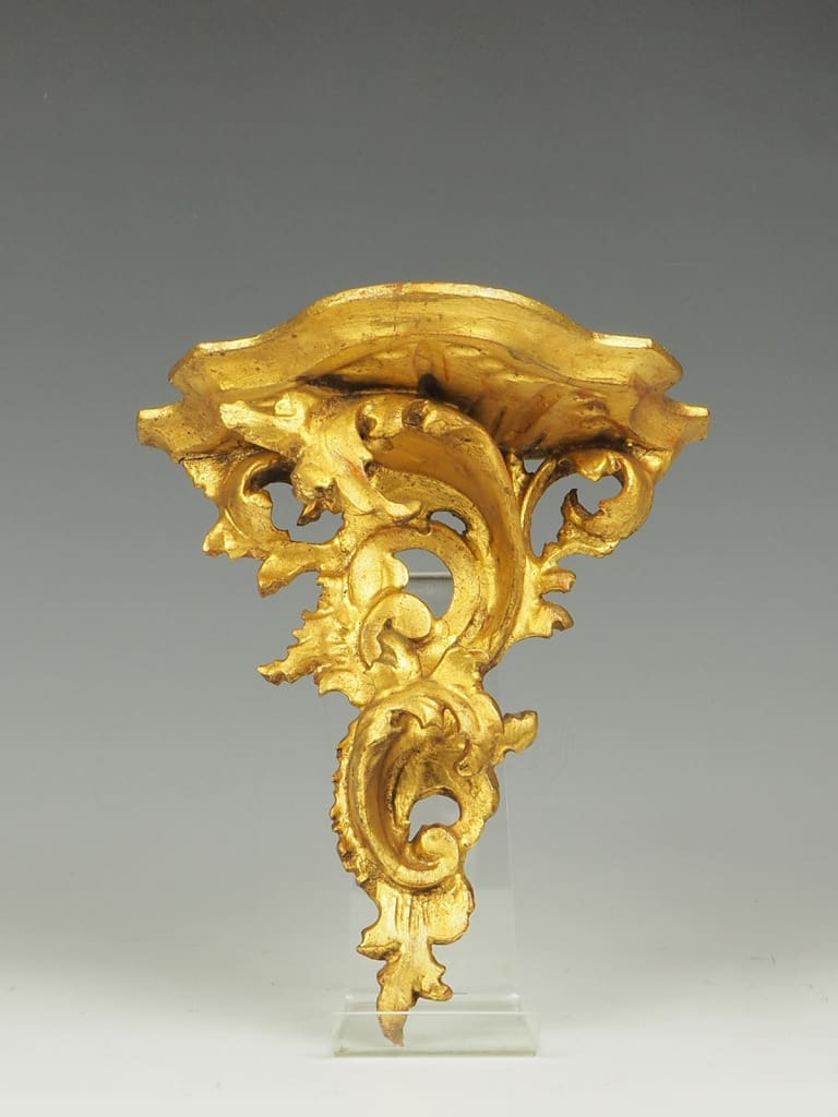 Italian Venetian Wall Shelf, a stunning piece that exudes timeless elegance and showcases the intricate craftsmanship of the Baroque era. This exquisite wall shelf is meticulously handcrafted from giltwood, boasting a rich golden hue that adds a touch of opulence to any space.