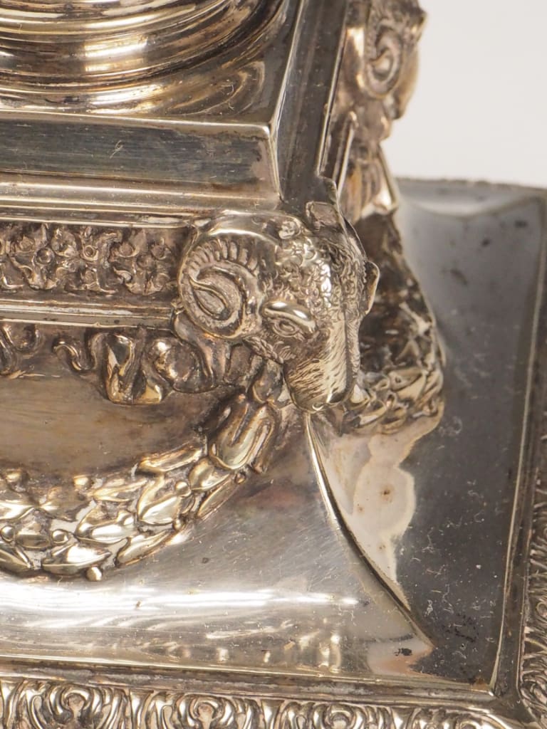 Complementing the Gorham pair is an exquisite set of Corinthian column candle holders by Martin Hall & Co., crafted in Sheffield, England, around 1890. These imposing candlesticks are distinguished by their classical architecture—fluted columns topped with Corinthian capitals and bases adorned with finely modeled rams' heads, symbols of nobility and strength.