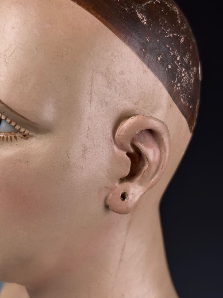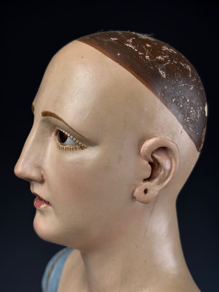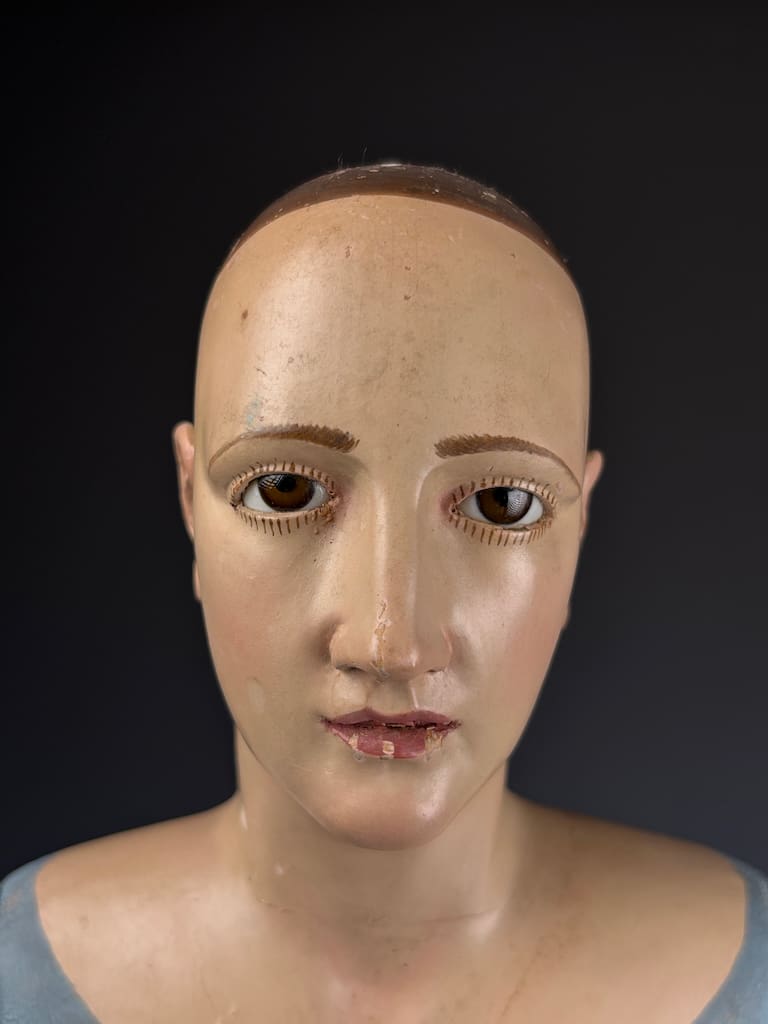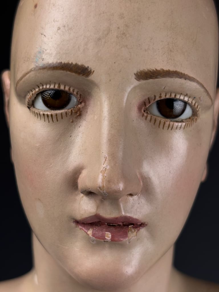 The figure’s finely modeled face and detailed anatomical proportions suggest the work of a skilled artisan from 18th-century Italy, where such devotional sculptures were widely used in churches and convents. Her serene expression, combined with the naturalistic glass eyes and original base, make this an evocative and highly collectible piece.