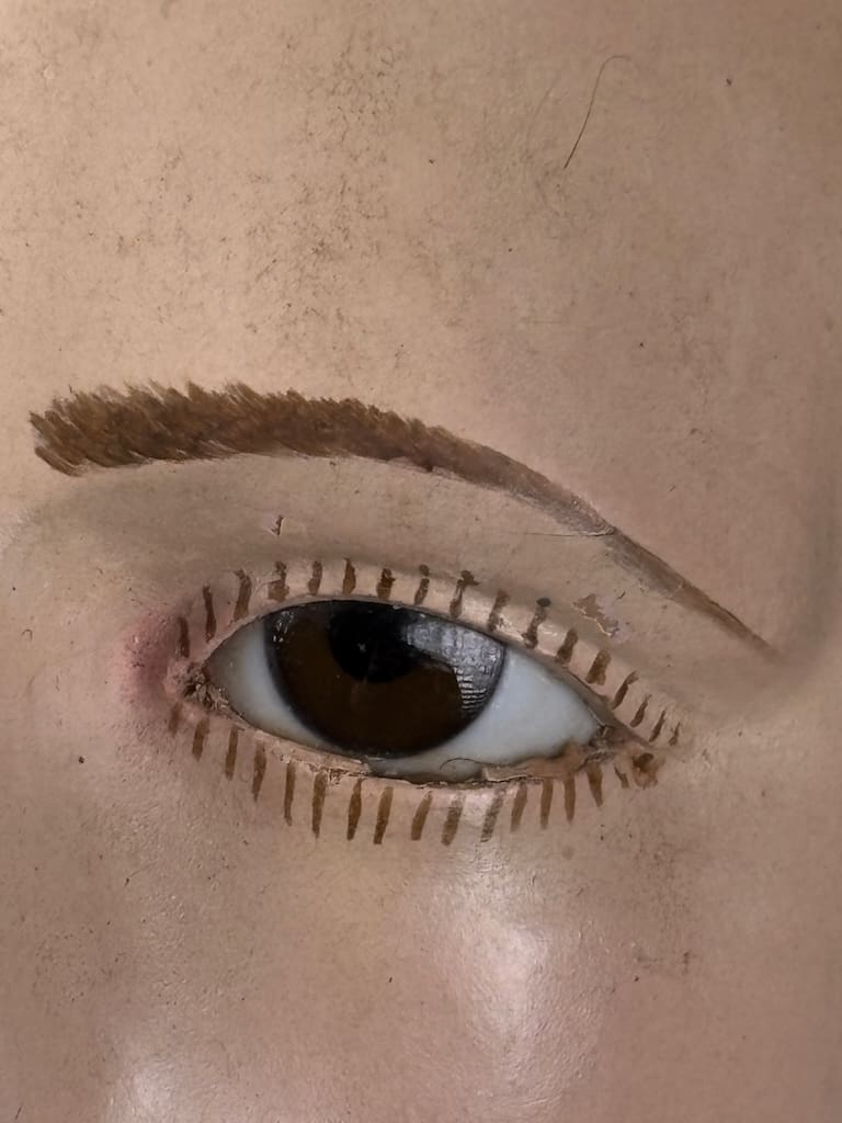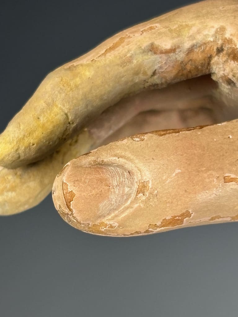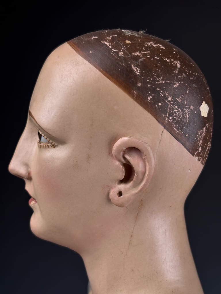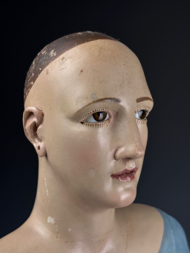 The figure’s finely modeled face and detailed anatomical proportions suggest the work of a skilled artisan from 18th-century Italy, where such devotional sculptures were widely used in churches and convents. Her serene expression, combined with the naturalistic glass eyes and original base, make this an evocative and highly collectible piece.