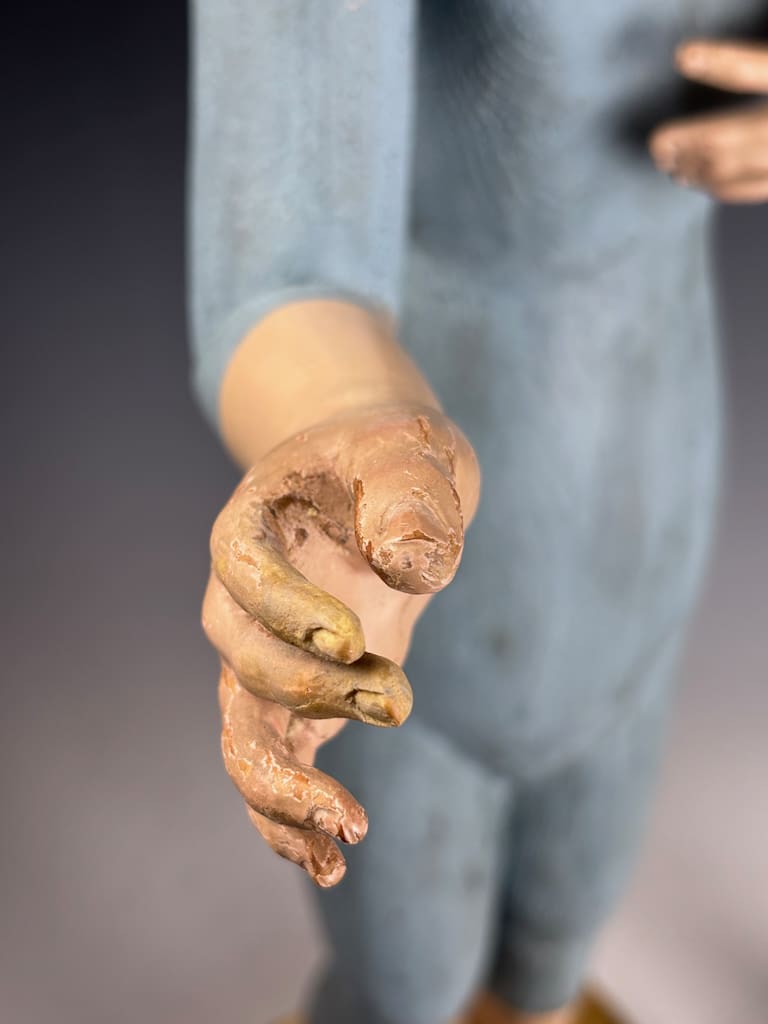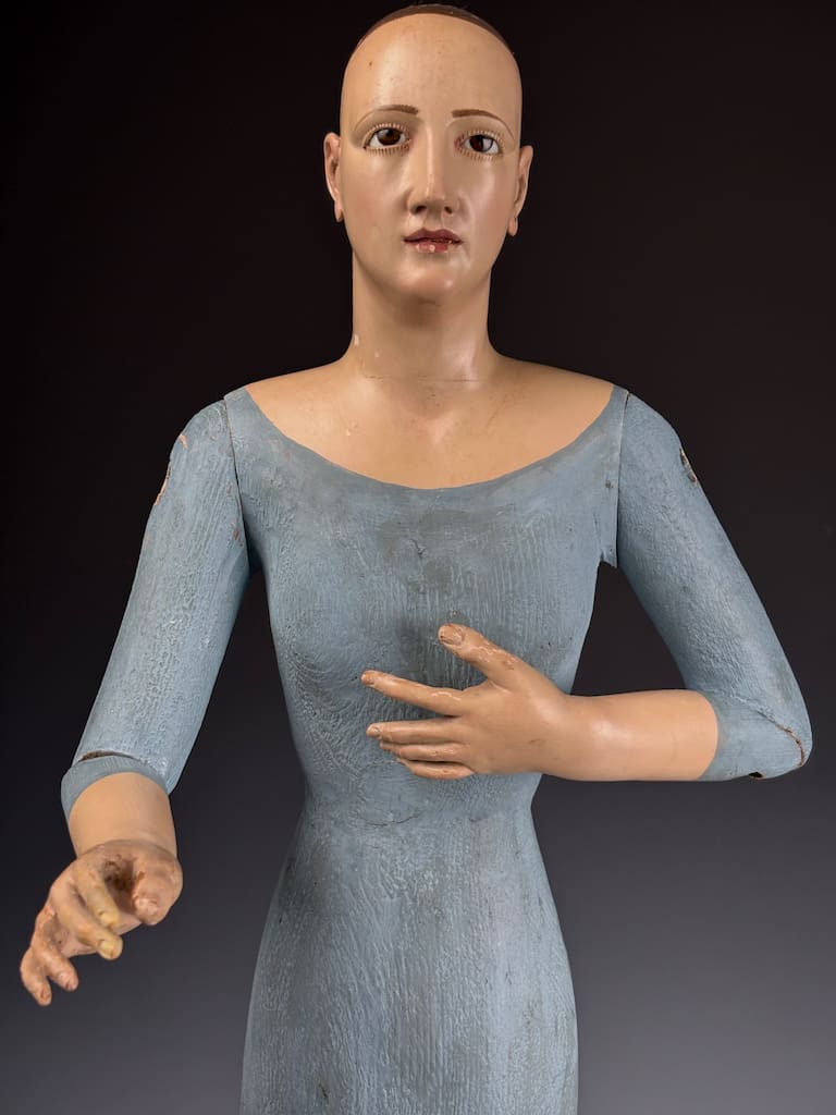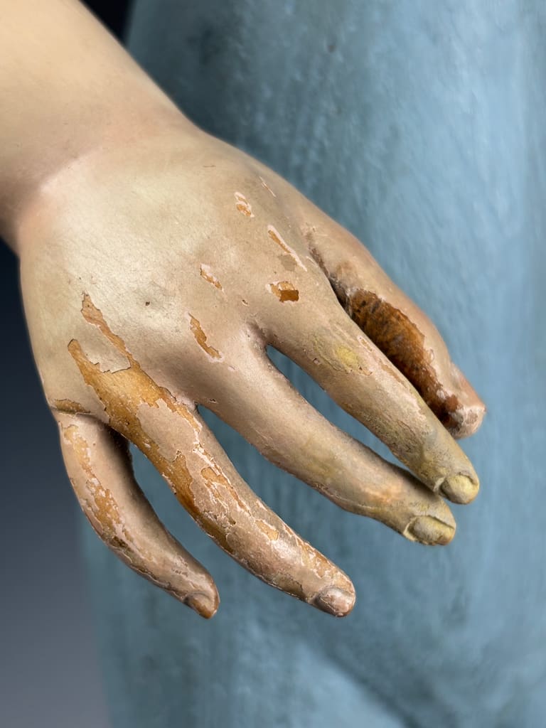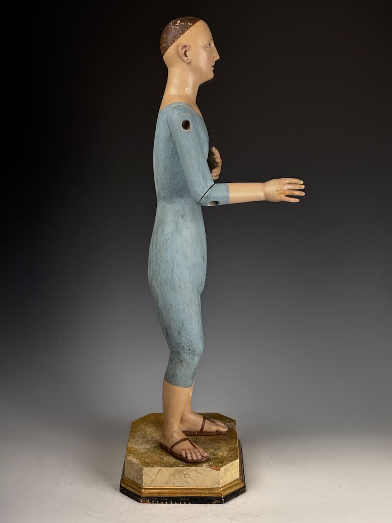 These figures were used in Catholic religious processions, dressed in richly embroidered vestments and carried through the streets on feast days. When not in use, they were placed on church altars or in private devotional settings. The articulated arms allowed the figure to be posed in different gestures or clothed appropriately according to the liturgical calendar.