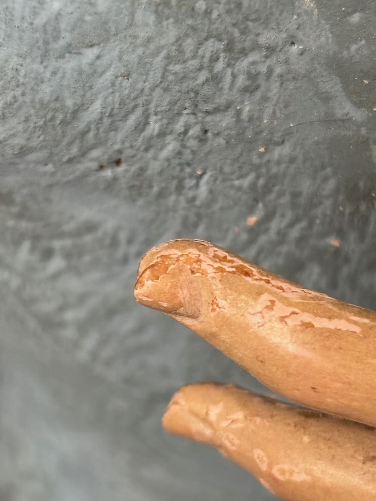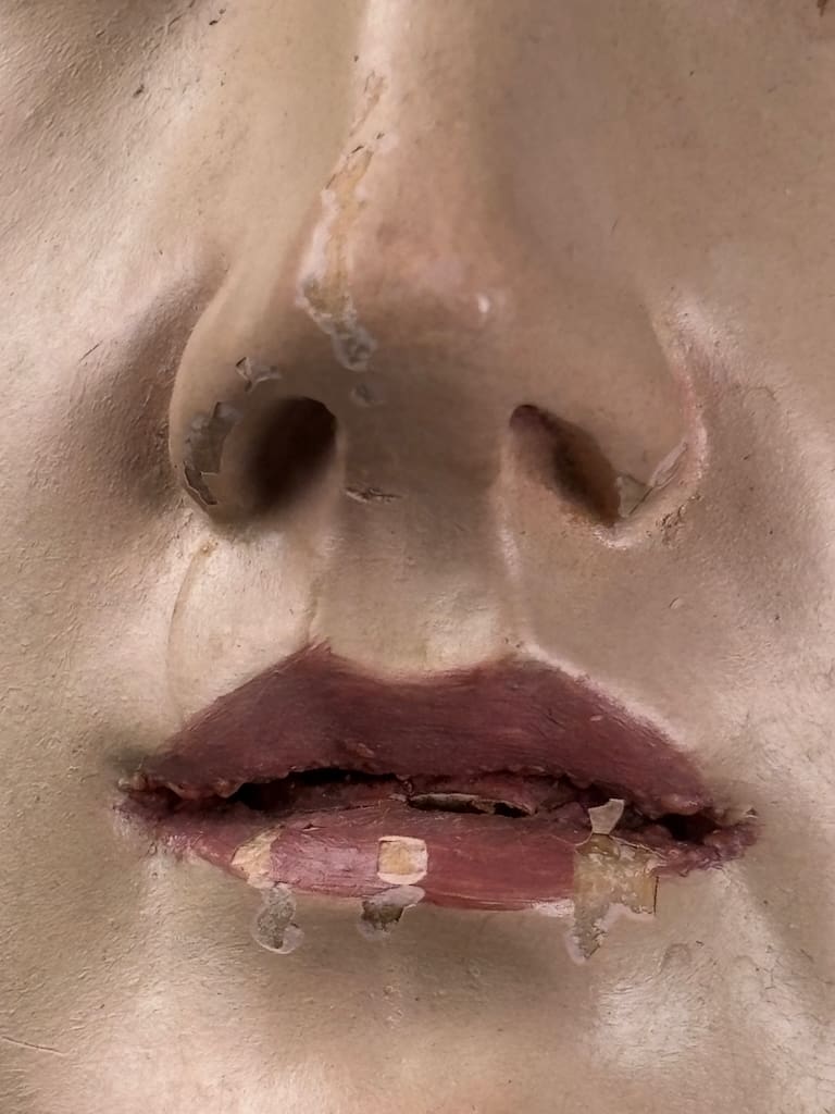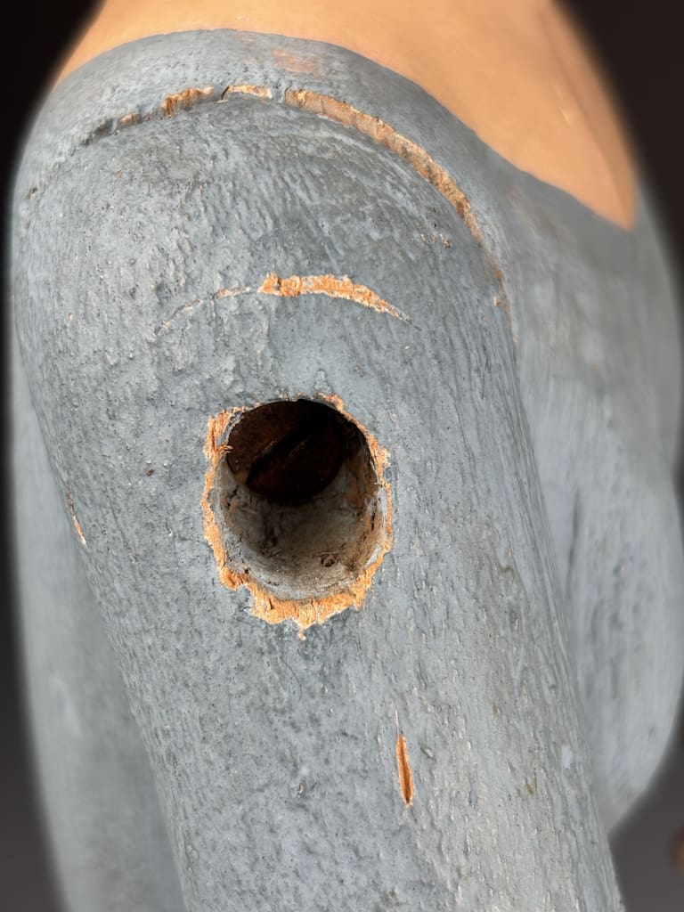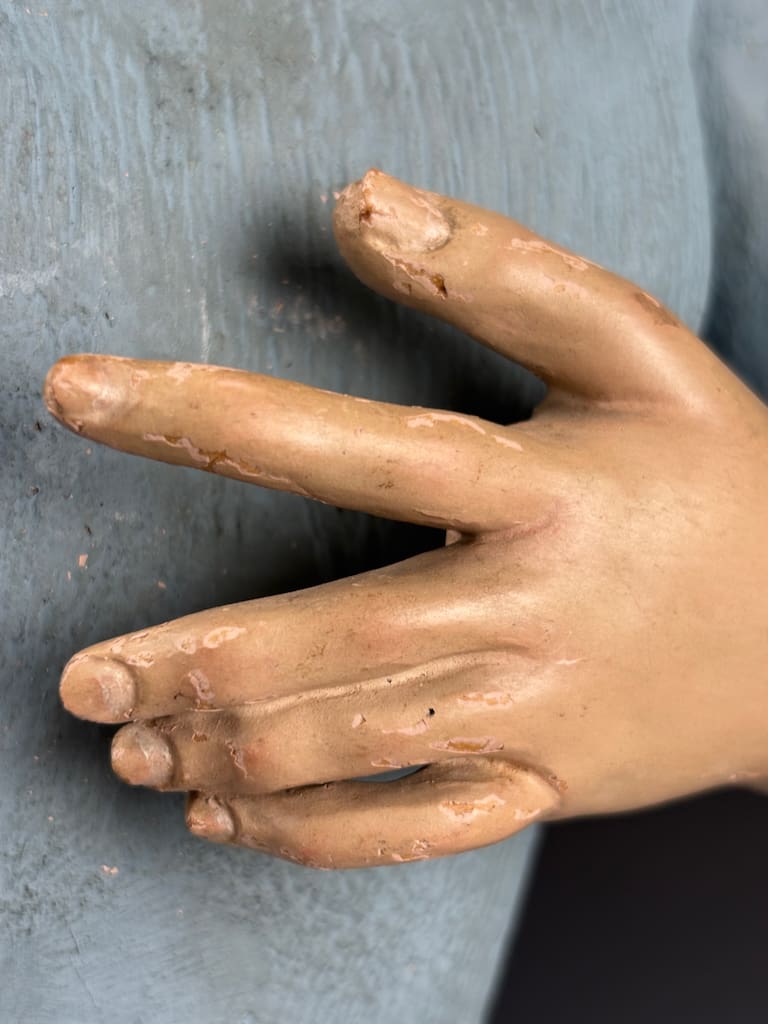 These figures were used in Catholic religious processions, dressed in richly embroidered vestments and carried through the streets on feast days. When not in use, they were placed on church altars or in private devotional settings. The articulated arms allowed the figure to be posed in different gestures or clothed appropriately according to the liturgical calendar.