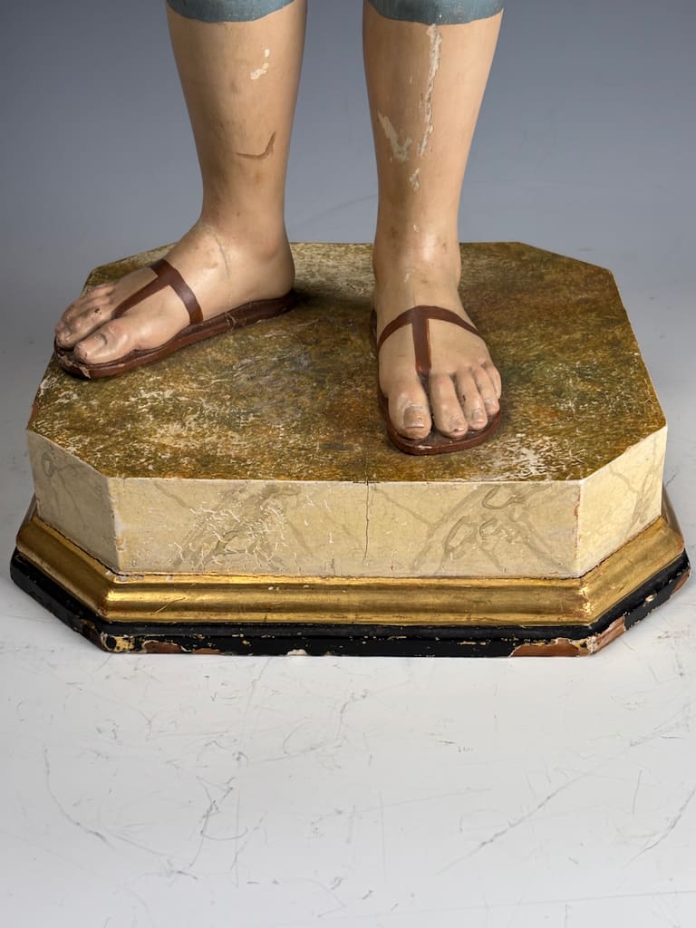 The carved wood body is stable and intact. No major structural damage or repairs observed. Original polychrome and gesso finish is largely preserved with areas of minor paint loss, small chips, and light craquelure typical of 18th-century devotional figures. The finely painted facial features remain clear and expressive. Glass eyes are original and securely set. Articulated arms move properly at the shoulders. Some minor wear and scuffing to joint areas. The original octagonal base is present with wear to the painted and gilded surface. Structurally sound.