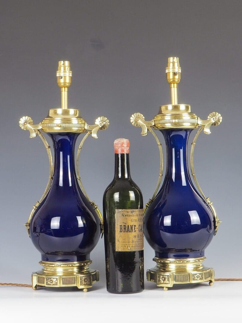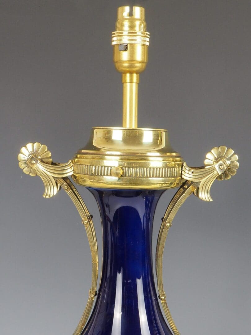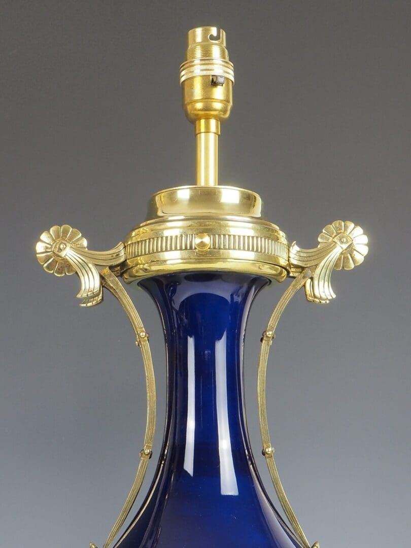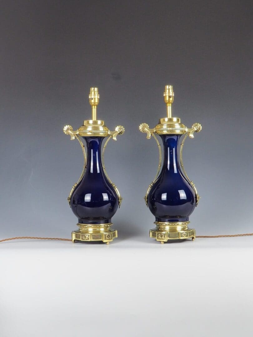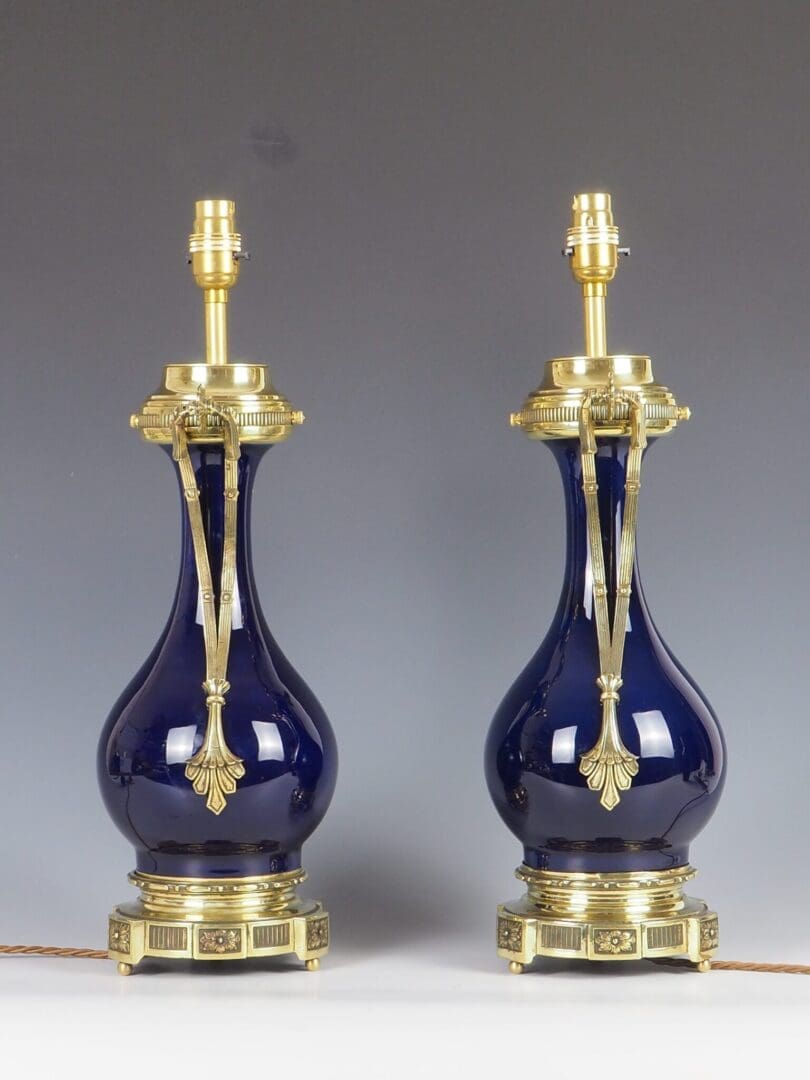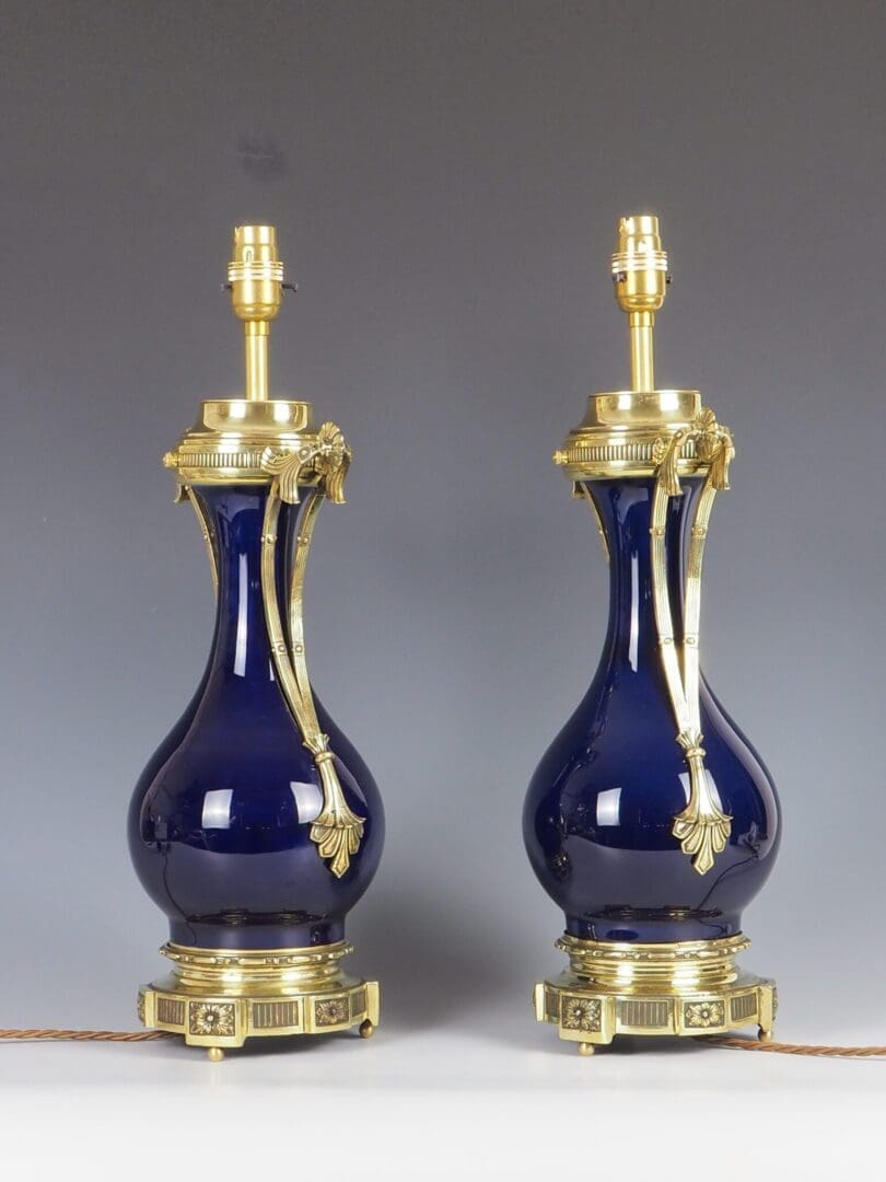 The porcelain bases exhibit no chips, cracks, or repairs. The vibrant royal blue hue remain vivid and intact. The brass fittings have been polished and restored, enhancing their lustrous appeal.