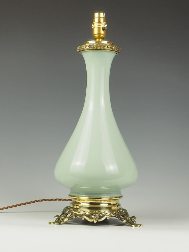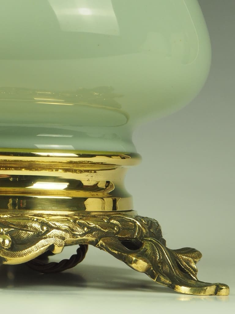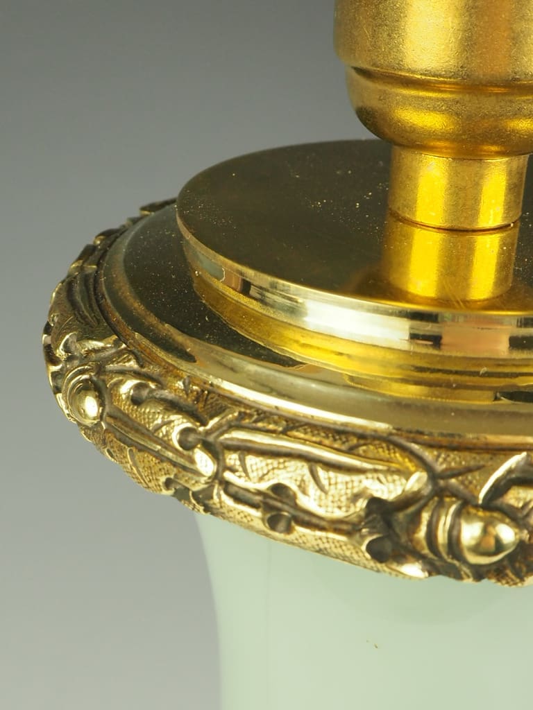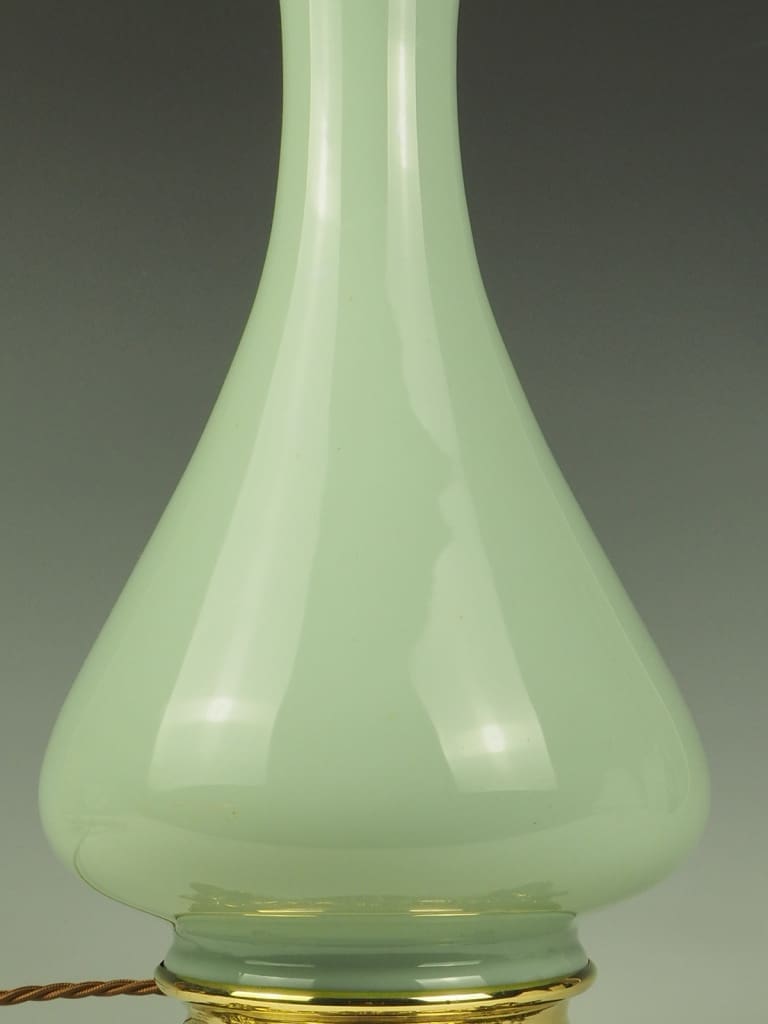 Exquisite Antique French Opaline Celadon and Bronze Table Lamp showcases a perfect blend of timeless elegance and functionality. Originally designed as an oil lamp, it has been thoughtfully converted to electric, ensuring convenience without compromising its charm. The lamp features a stunning opaline celadon glass body, which exudes a soft and ethereal glow when illuminated. The delicate celadon hue adds a touch of serenity and sophistication, making it a captivating centerpiece in both traditional and contemporary interiors.