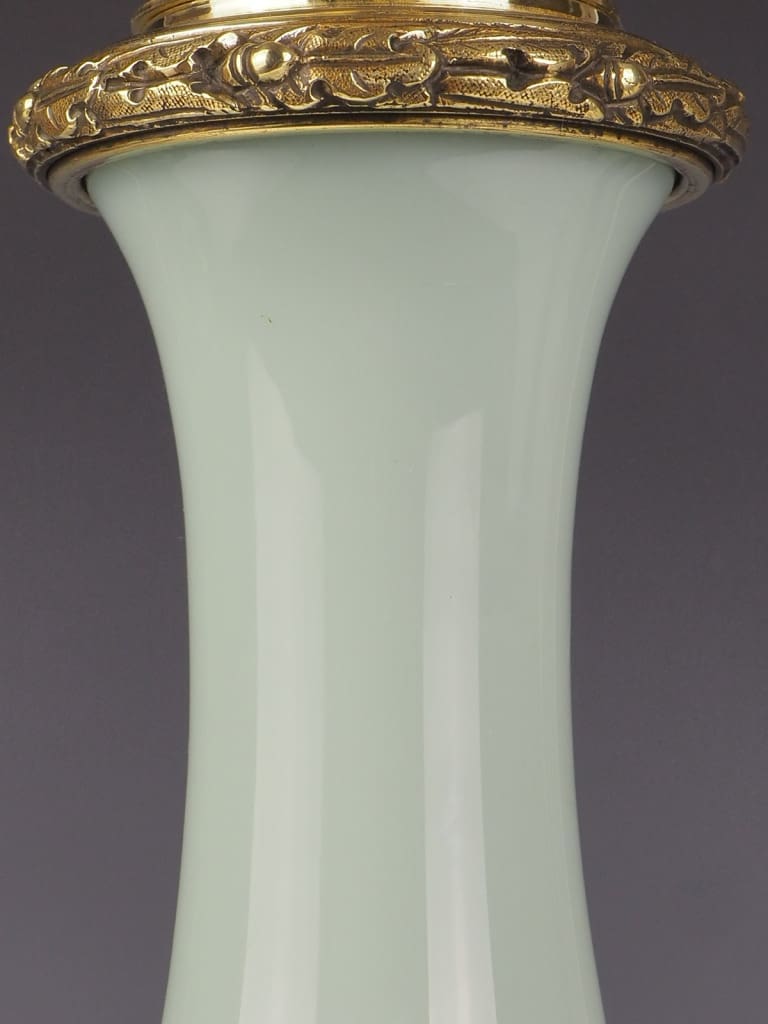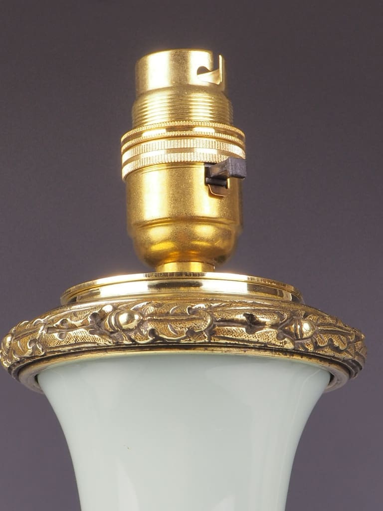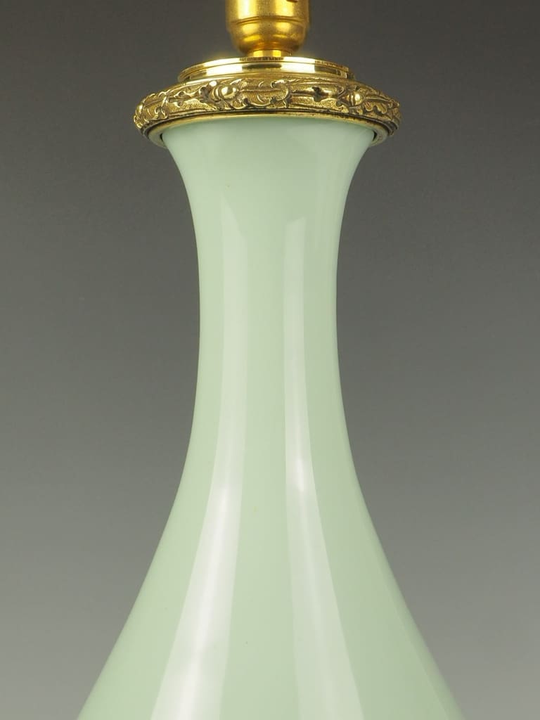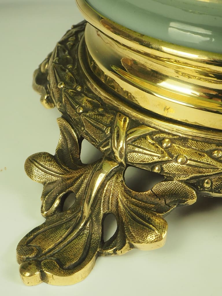 Exquisite Antique French Opaline Celadon and Bronze Table Lamp showcases a perfect blend of timeless elegance and functionality. Originally designed as an oil lamp, it has been thoughtfully converted to electric, ensuring convenience without compromising its charm. The lamp features a stunning opaline celadon glass body, which exudes a soft and ethereal glow when illuminated. The delicate celadon hue adds a touch of serenity and sophistication, making it a captivating centerpiece in both traditional and contemporary interiors.
