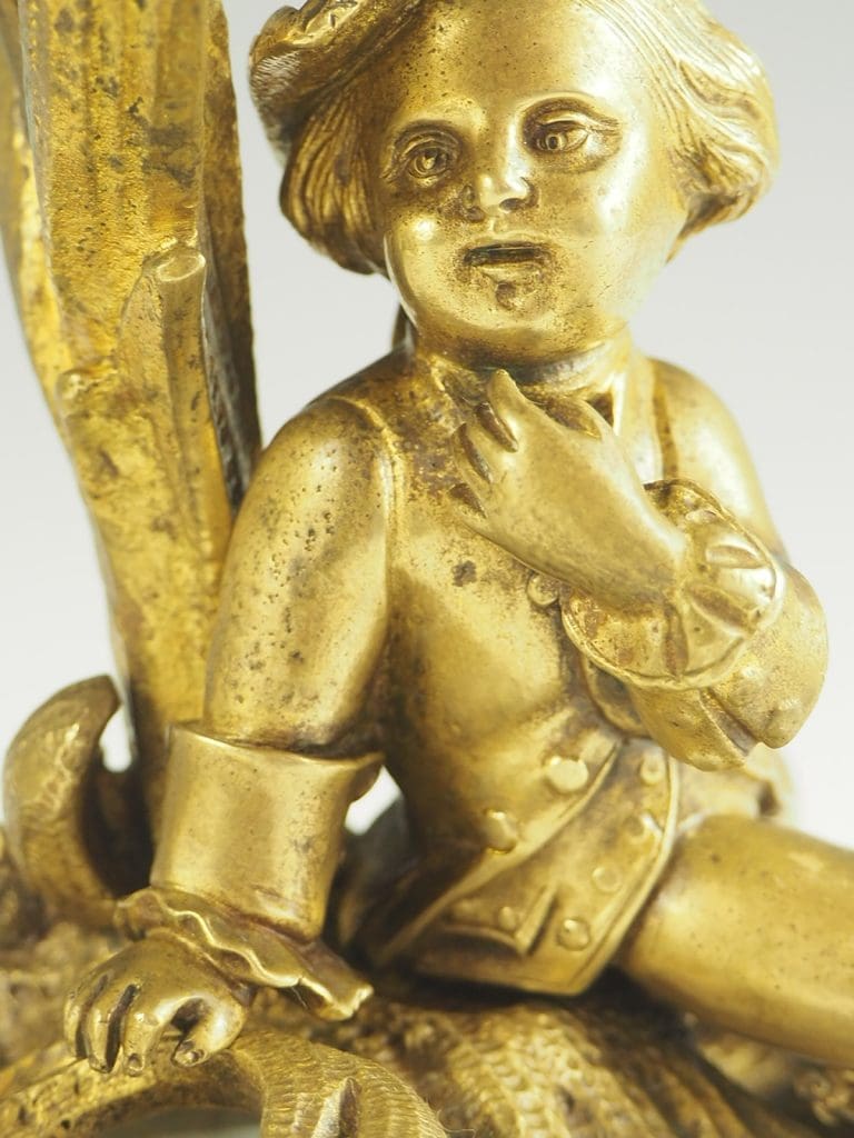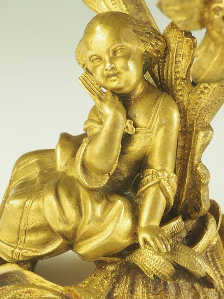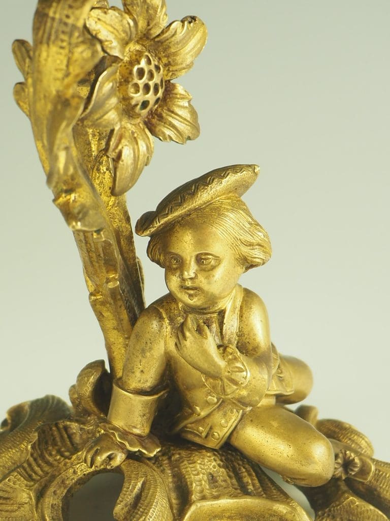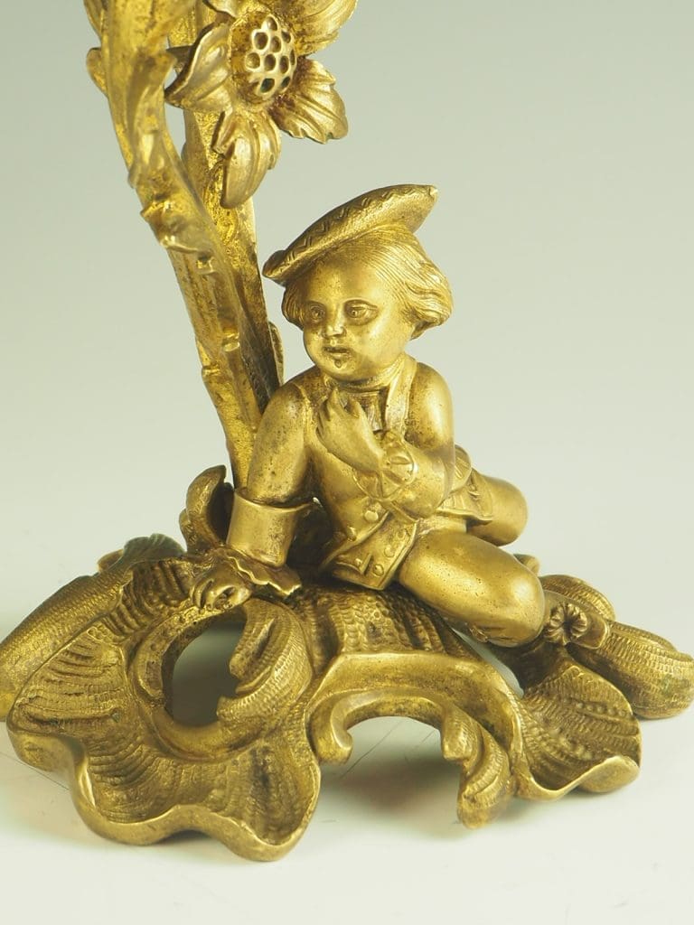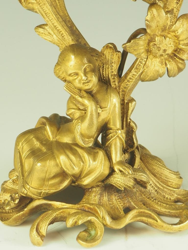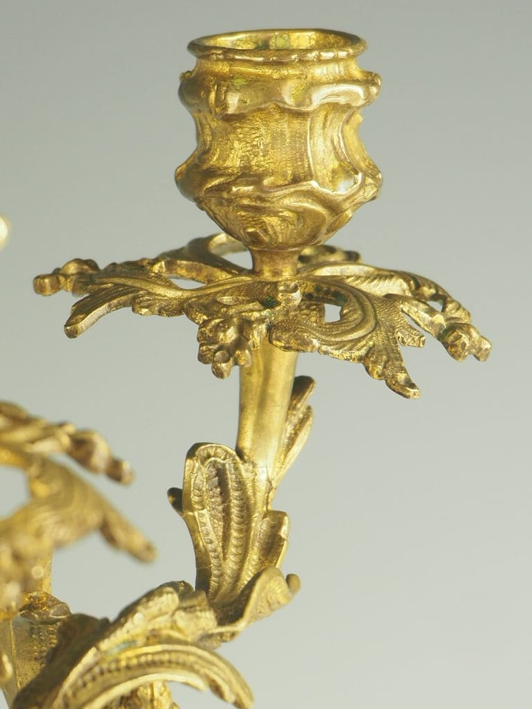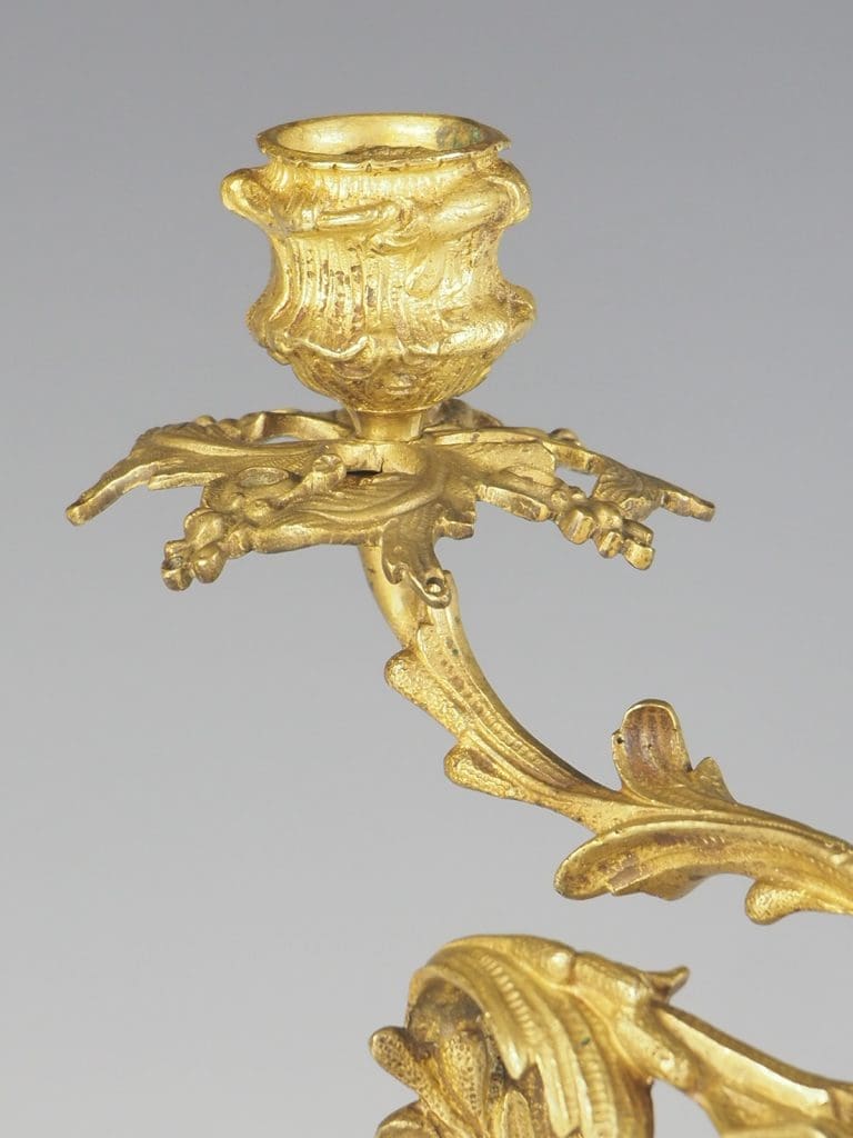 The candelabra are made from ormolu, a type of gilded bronze, which gives them a luxurious and opulent appearance. The fine craftsmanship is evident in every detail, from the intricate patterns on the base to the carefully sculpted figures of the courting couple.