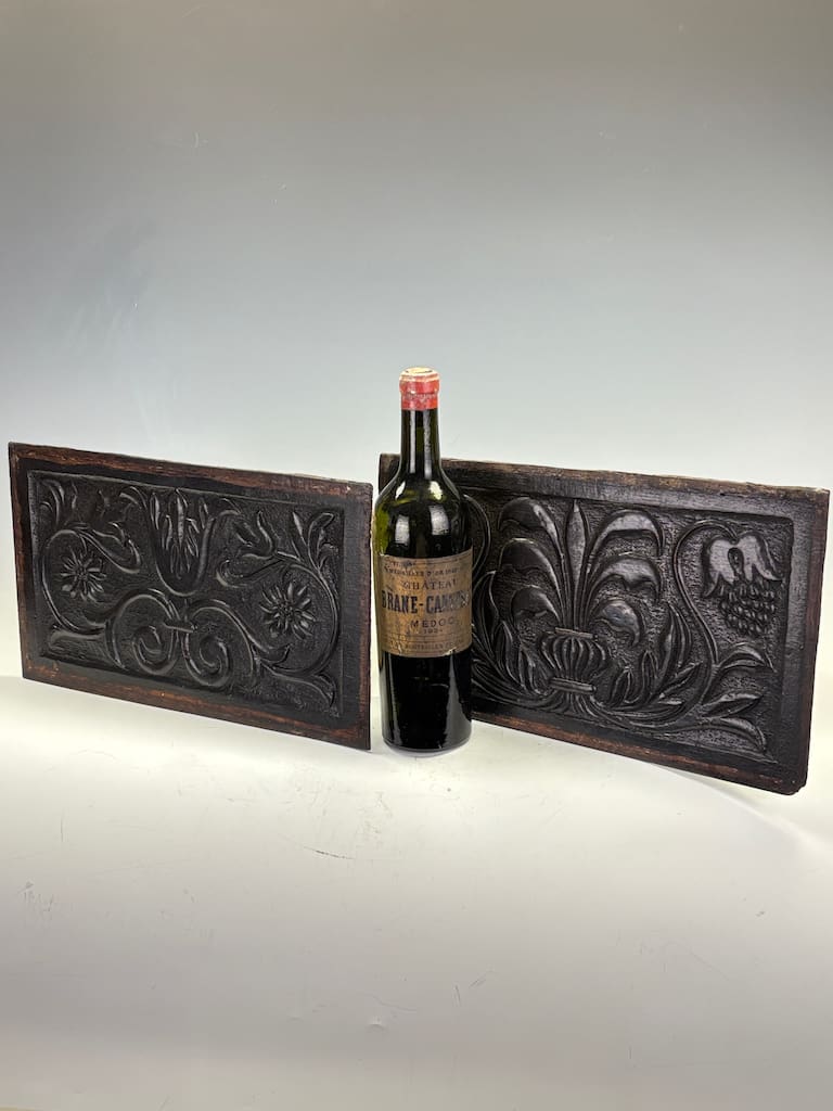 This is a magnificent pair of antique carved oak panels, rich in both detail and history. Dating from the late 17th or early 18th century, these panels are a prime example of the exquisite craftsmanship of the period. Each panel features a deep, well-defined carving that showcases a different traditional motif, likely representing nature and prosperity. The carving on the left panel is an elegant floral design, with a large, stylized flower flanked by intricate scrollwork. The right panel depicts a classical urn overflowing with foliage and grapes, a common symbol of abundance and celebration.