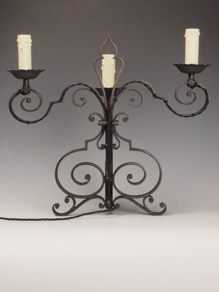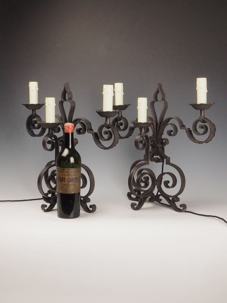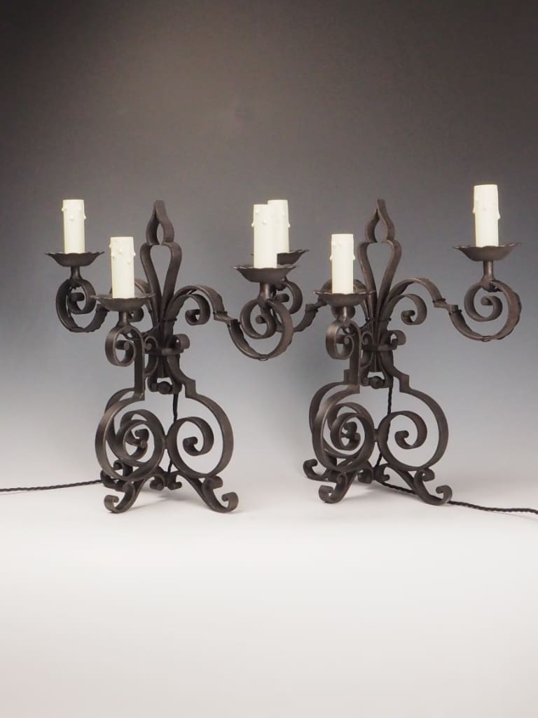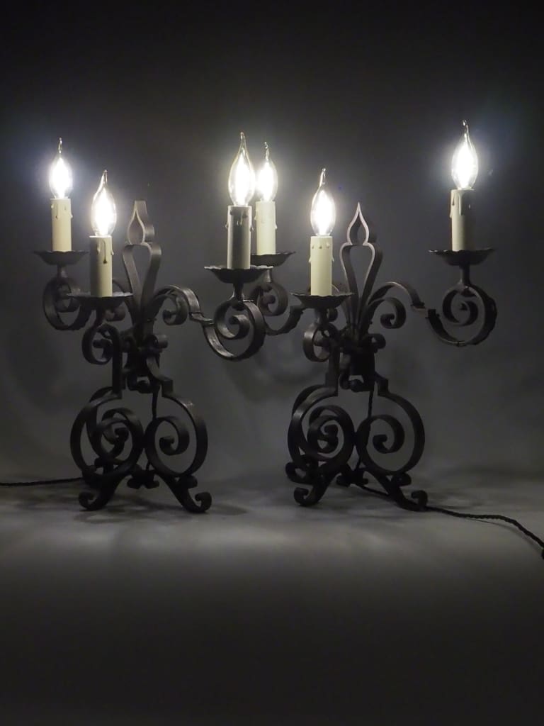 A striking pair of French antique lamps, crafted in wrought iron with ornate scrolled detailing and three candle-style light fixtures. Likely dating from the early 20th century, these lamps reflect the timeless influence of French design, with elegant curves and handcrafted ironwork that speak to a bygone era of skilled metal craftsmanship.