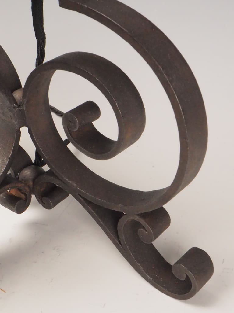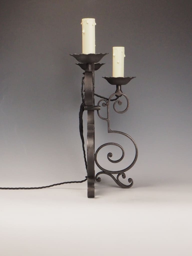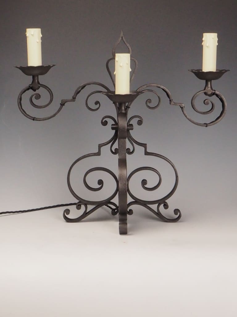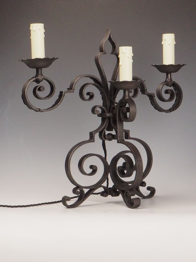 A striking pair of French antique lamps, crafted in wrought iron with ornate scrolled detailing and three candle-style light fixtures. Likely dating from the early 20th century, these lamps reflect the timeless influence of French design, with elegant curves and handcrafted ironwork that speak to a bygone era of skilled metal craftsmanship.