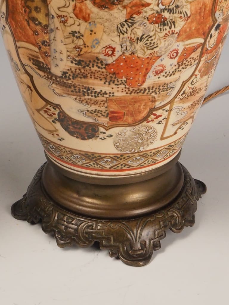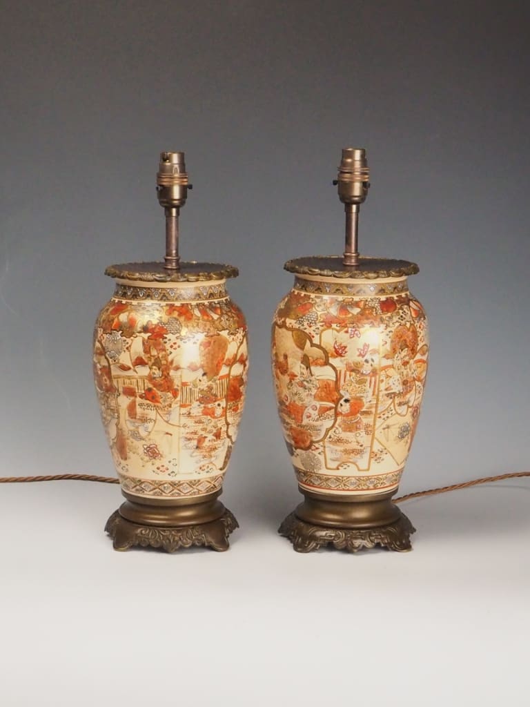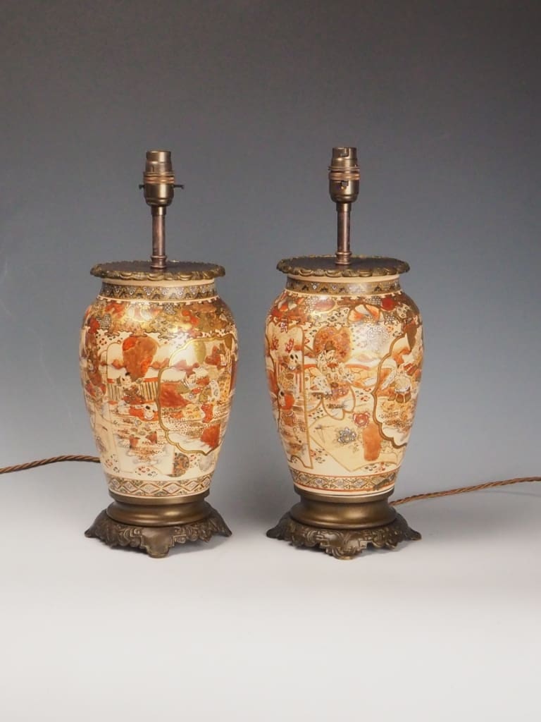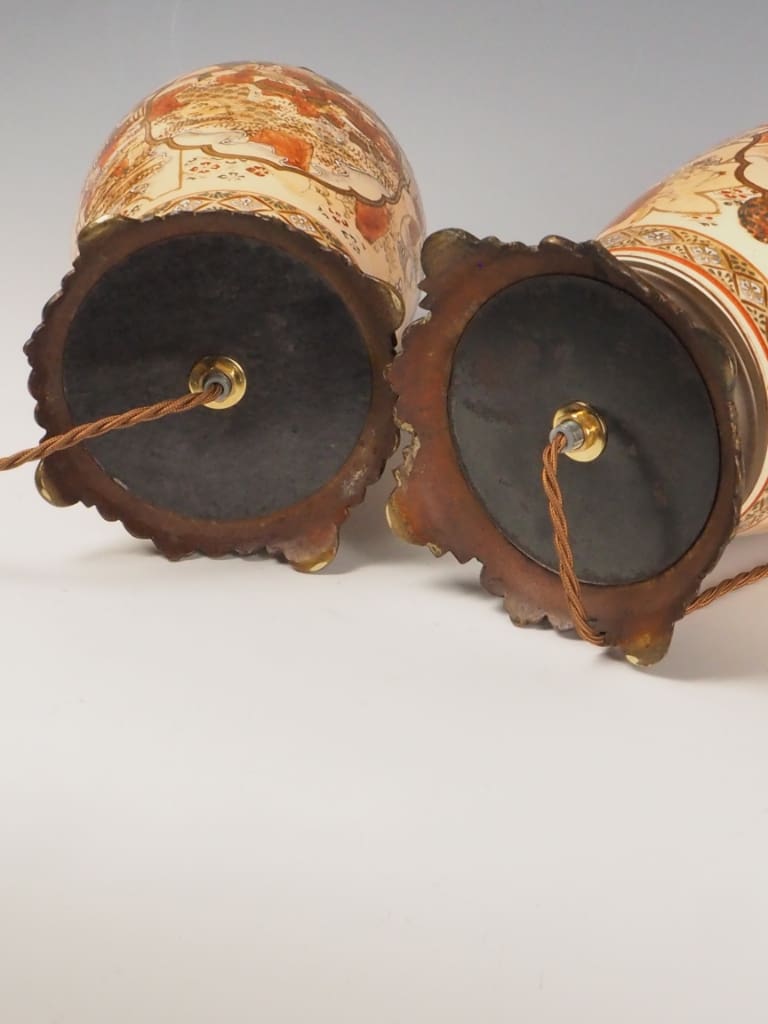 Each lamp is formed from a traditional Satsuma ware vase, beautifully adorned with intricate Japanese figural and landscape scenes, bordered by ornate gilded detailing. The delicate enamels and soft earthy tones are characteristic of authentic Satsuma ceramics—highly prized by collectors and interior designers alike.