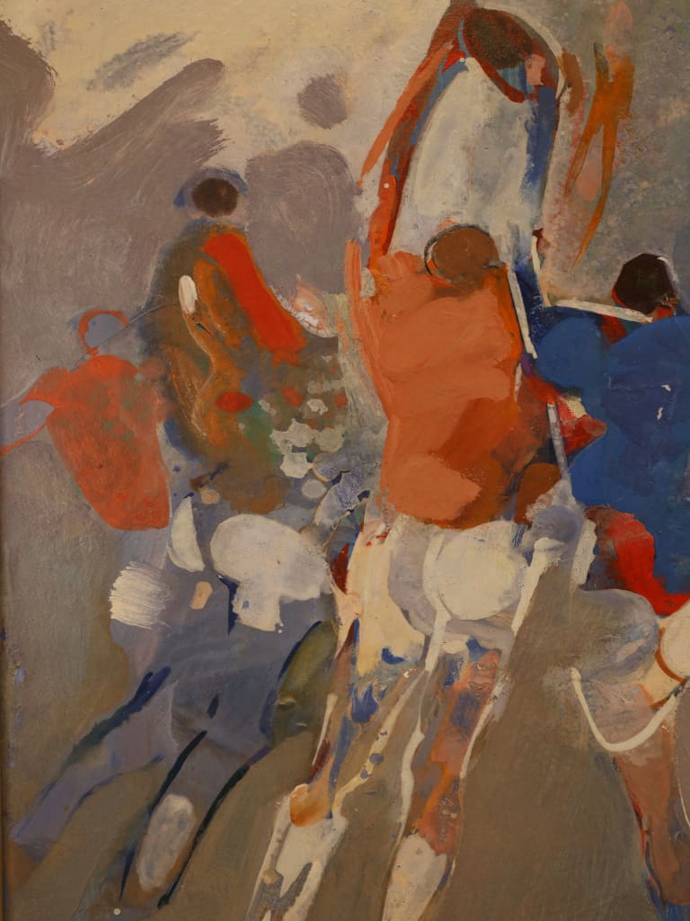 A dynamic and evocative mid-century oil on board by the French artist Pierre Chièze (1929–2011), depicting a high-energy rugby line-out. Chièze was a master of capturing movement through a unique lens of figurative abstraction, and this work is a quintessential example of his celebrated sporting series.