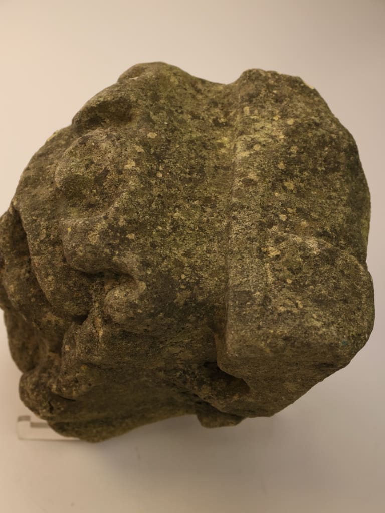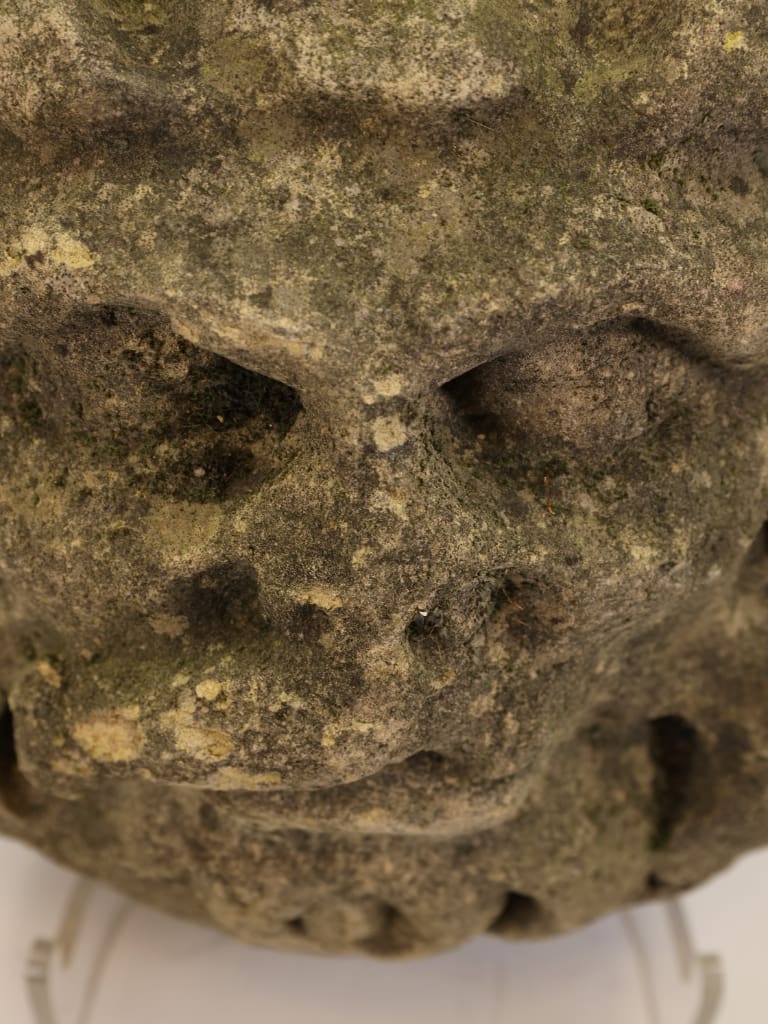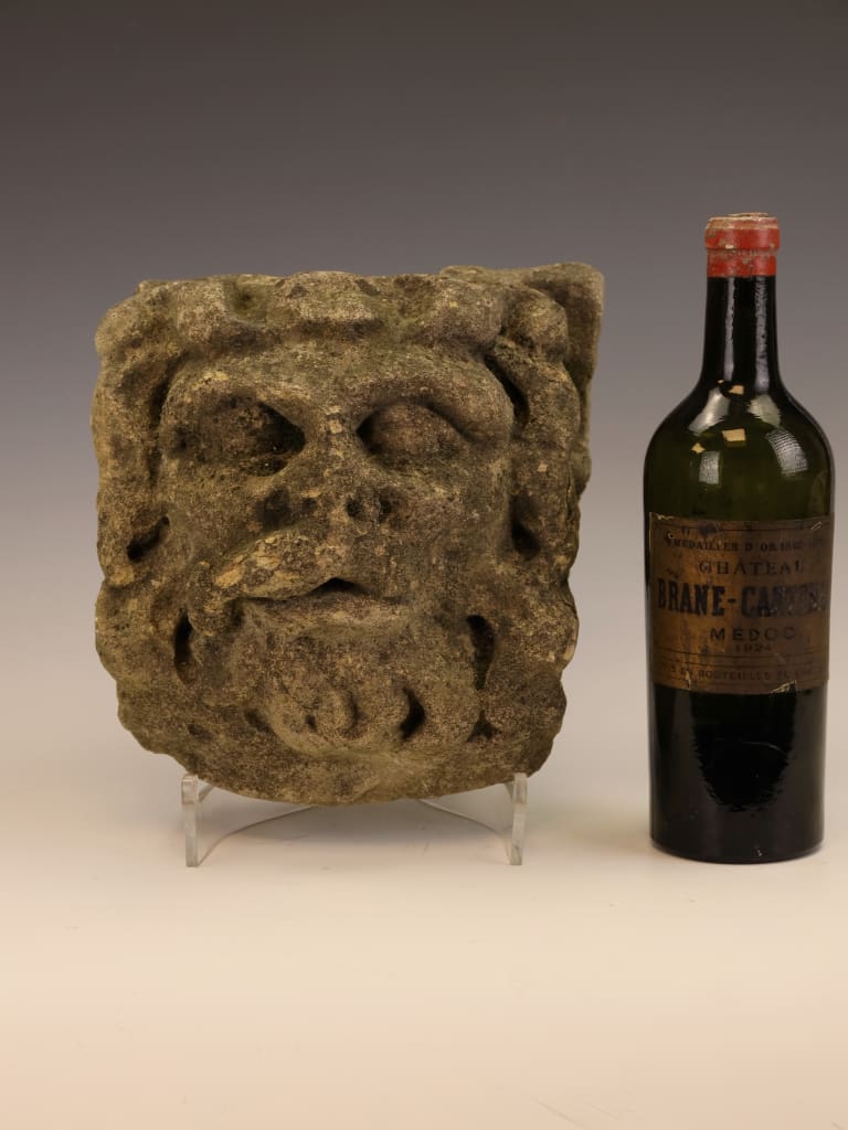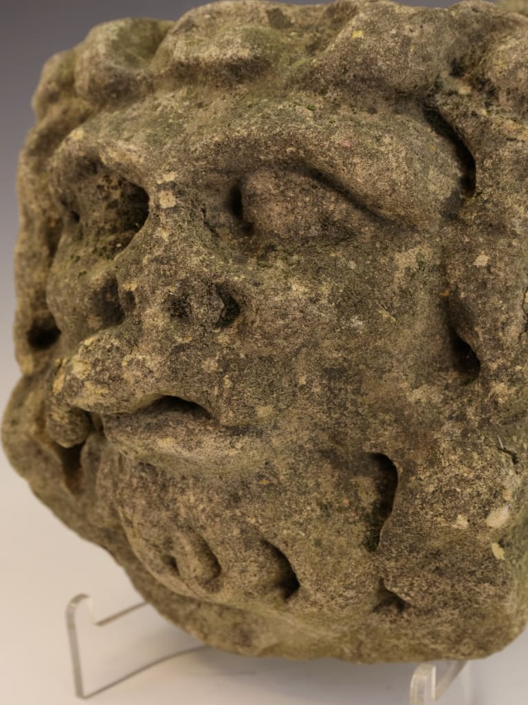 The carving features a classic Grotesque visage, characterised by a furrowed brow, prominent ocular ridges, and a grimacing mouth. The rhythmic, almost foliate treatment of the beard and hair draws on the ancient "Green Man" and "Wild Man" traditions, which remained a popular decorative motif in the British Isles well into the 17th century. Carved from a robust native limestone, the piece displays a monumental quality that commands any space it occupies.
