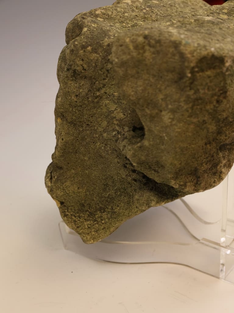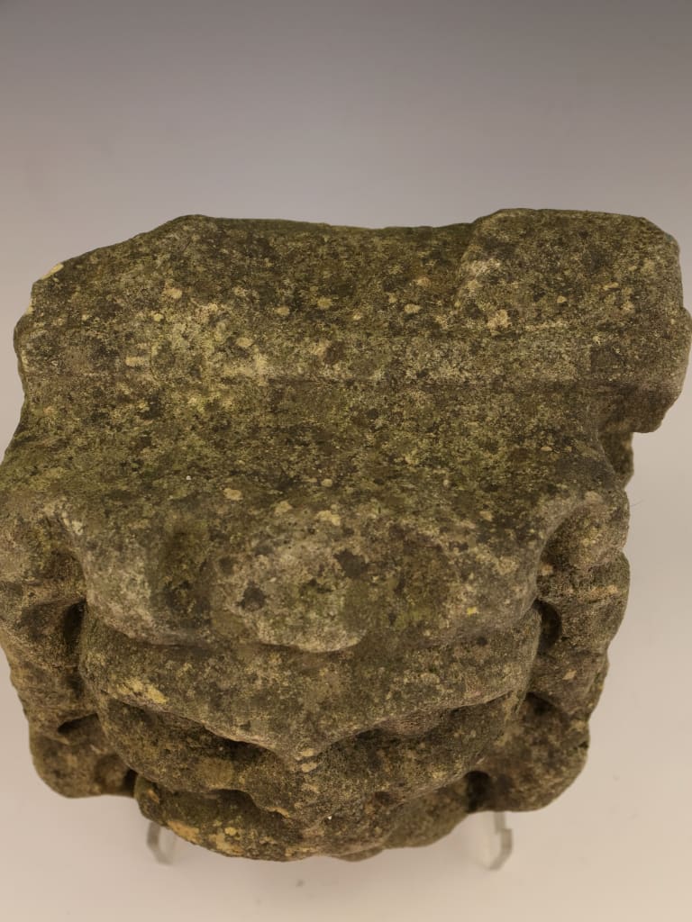 A deeply compelling and powerfully expressive carved stone corbel head, representing the transition from late Medieval Gothic to the early post-Medieval vernacular of the 17th century. This architectural survivor was originally a structural element, likely supporting a hammerbeam roof or stone vaulting in a high-status manor house or an ecclesiastical building.