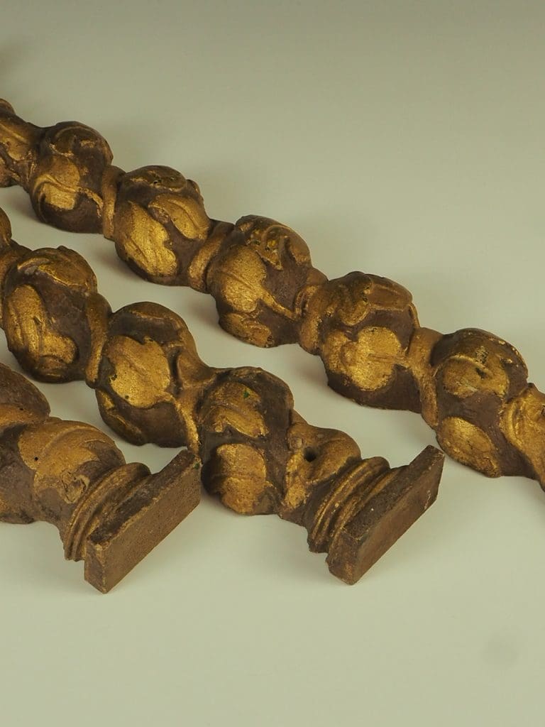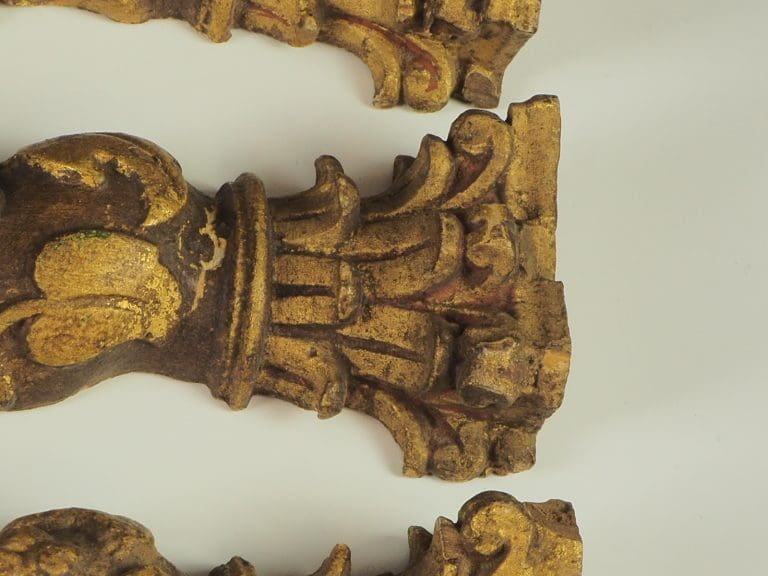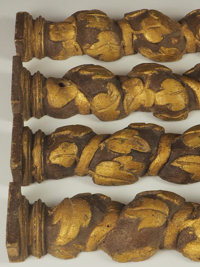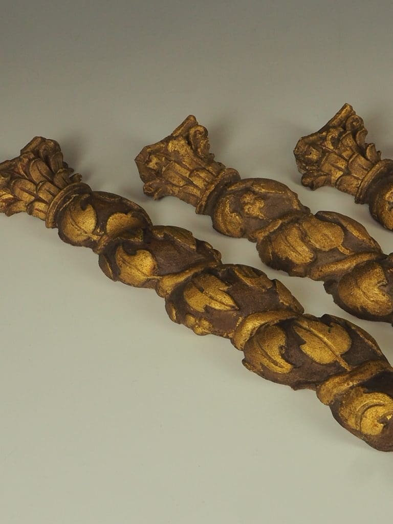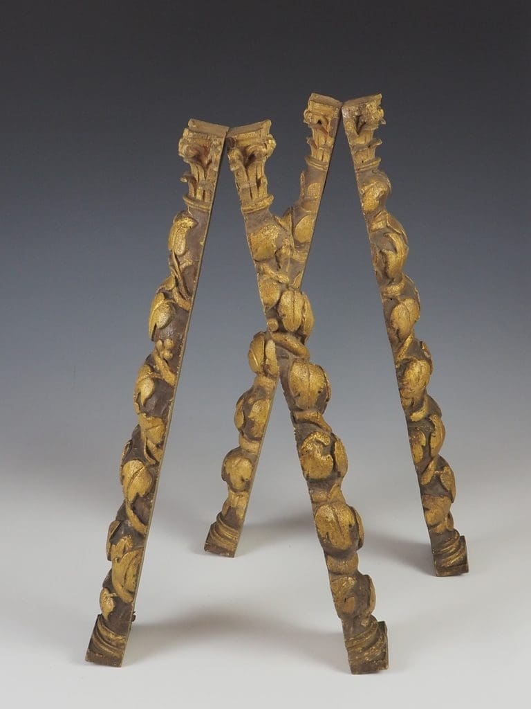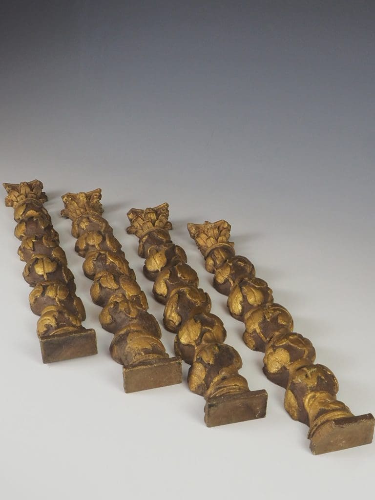 Description Highly decorative small set of 4 late 18th century Baroque style Solomonic carved gilt wood columns, possibly Spanish or Italian with original gilding This stunning set of half columns consist of Corinthian capitals to the top carved with scrolling acanthus leading down to the spiral Solomonic columns carved with scrolling foliage and flower decoration.