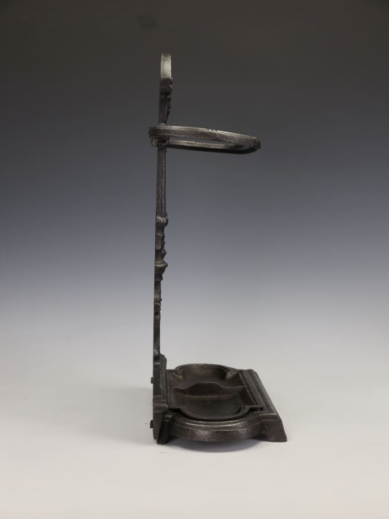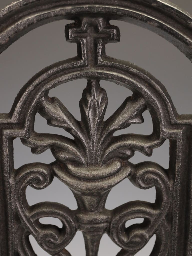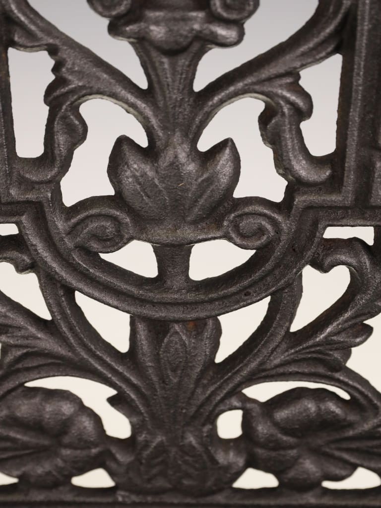 The stand is meticulously cast in a classic black finish, exhibiting a strong sense of proportion and refined detail characteristic of the period's preference for revival styles, notably elements of the Neo-Classical or Renaissance revival. The design features a beautifully pierced back panel with elaborate scrolled foliate and classical vase motifs, lending it an air of architectural sophistication.