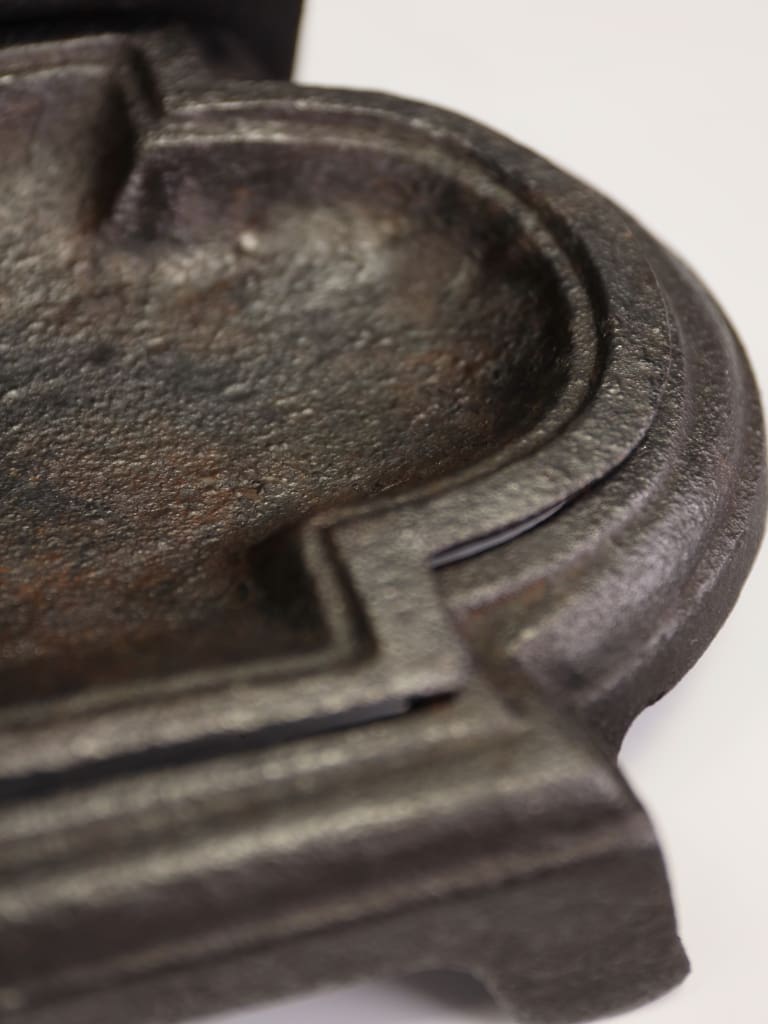 It is flanked by two sturdy, baluster-form uprights, which rise to support the upper rail. The lower section of the pierced screen is particularly engaging, incorporating highly stylised, crouching grotesque beasts or lions, which terminate the scrolling ironwork and add a mythological or Rococo flourish.