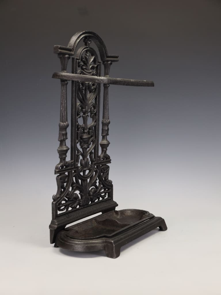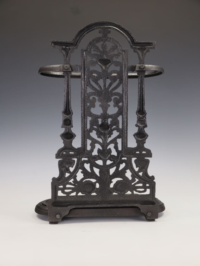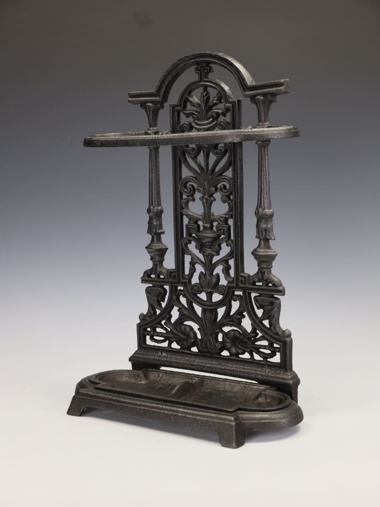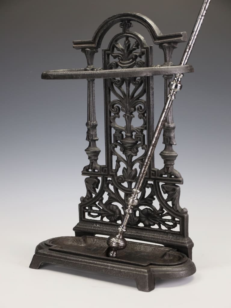 Perfectly scaled for an entrance hall, lobby, or mudroom, this stick stand is more than a utility item; it is a statement of enduring design and Victorian engineering. It also offers a creative alternative for a fireside stand, holding fire irons and implements with equal style. A handsome, solid, and decorative piece for any discerning collector of fine architectural and decorative antiques.