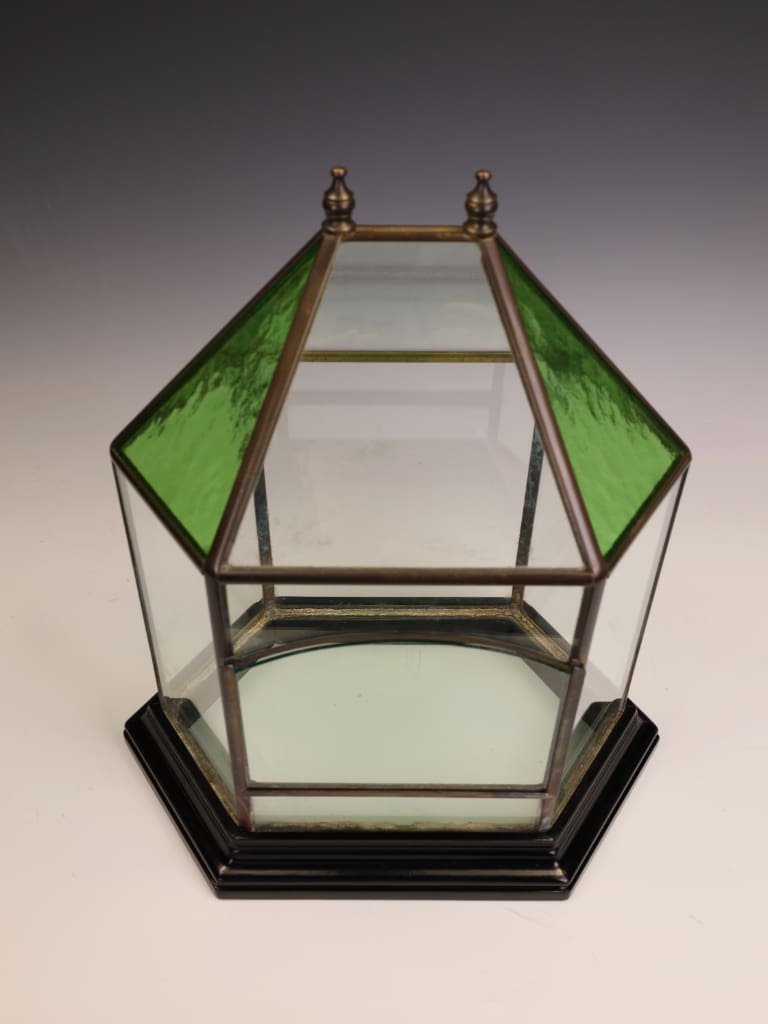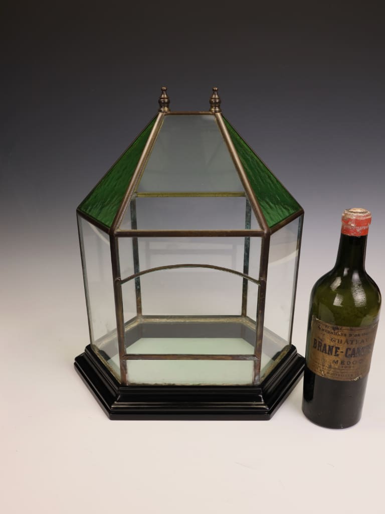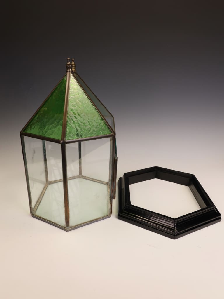 This elegant, hexagonal glass enclosure is a wonderful example of Victorian craftsmanship, likely serving as either a display case for cherished items or an early Wardian Case (a type of miniature greenhouse for house plants). The design combines structural symmetry with highly attractive materials, making it a beautiful architectural accent for any room.