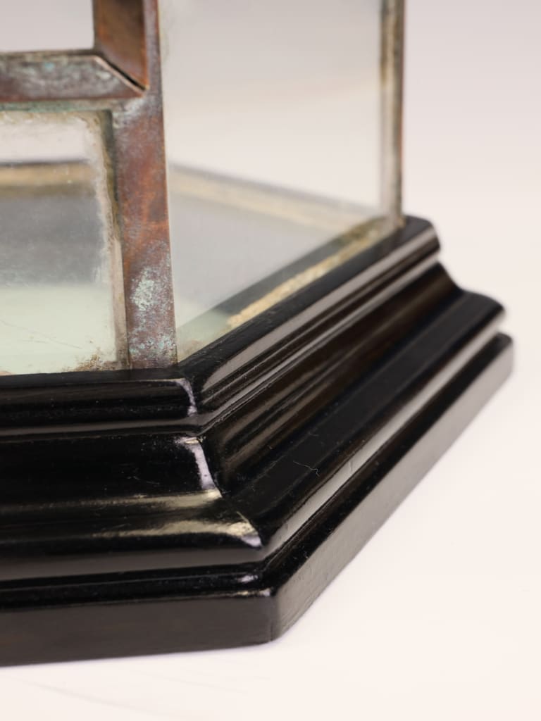The case is constructed using the traditional leaded/brass-bound technique, reminiscent of fine stained glass windows or decorative lantern making. The six vertical panels and pyramidal roof are held together by a patinated brass frame, lending the piece a robust, antique character.