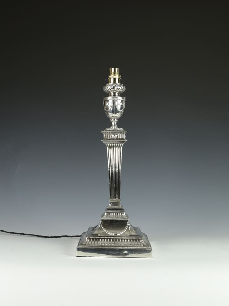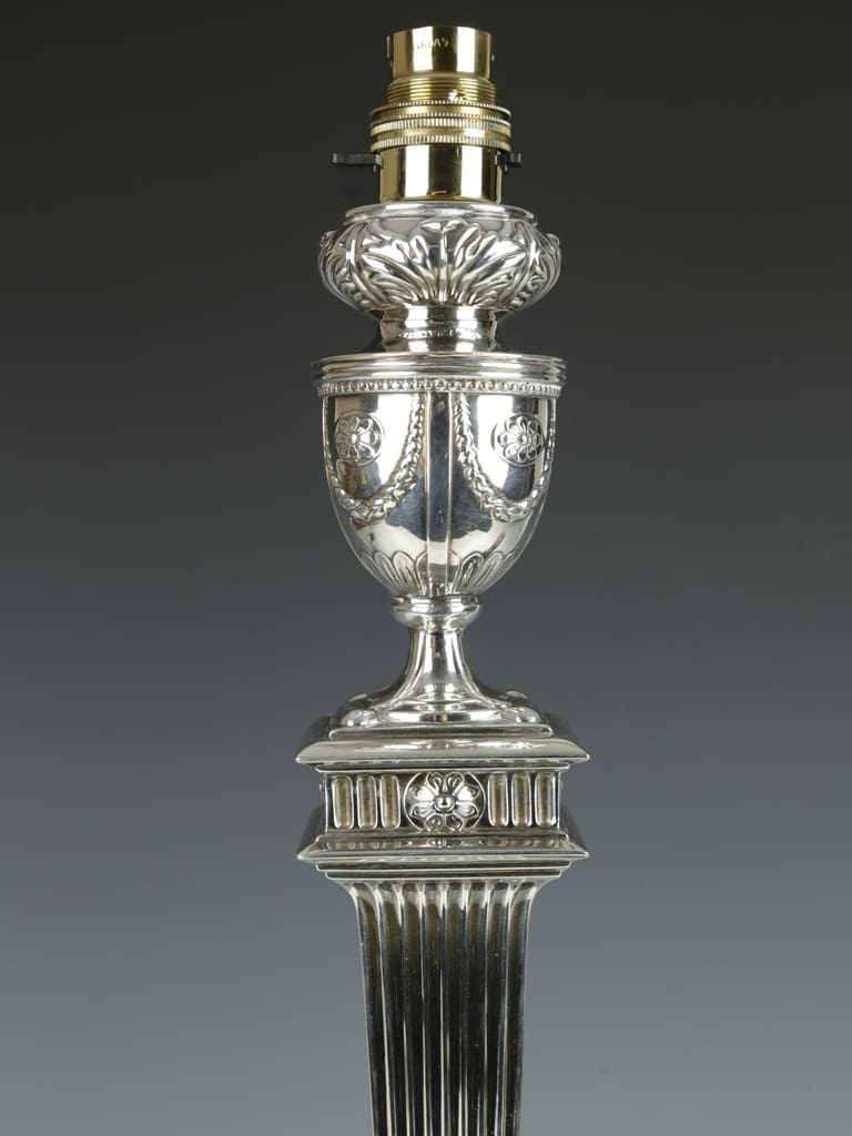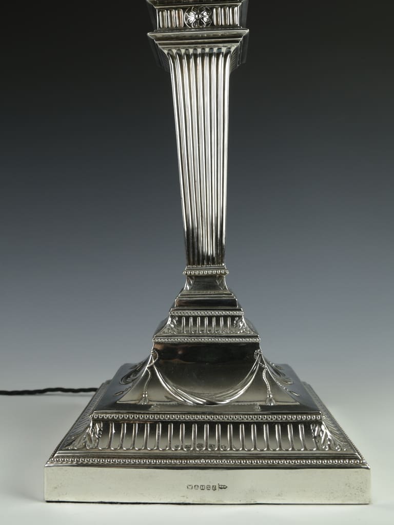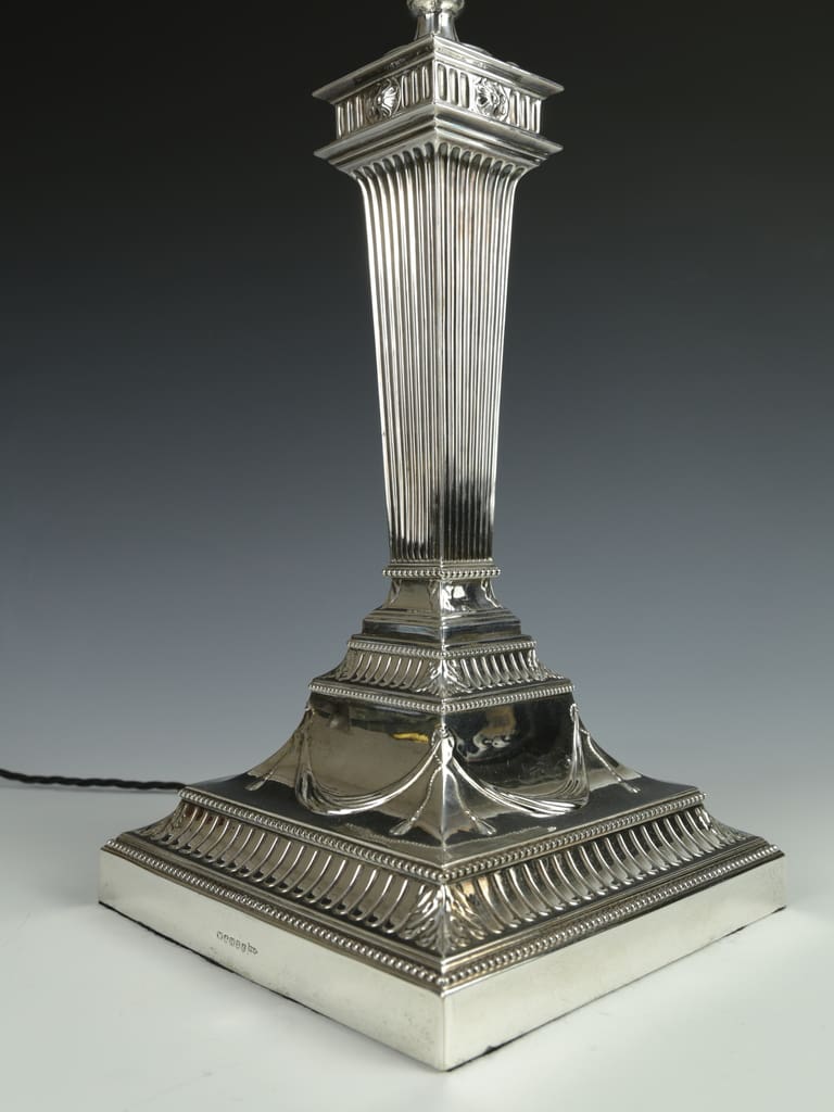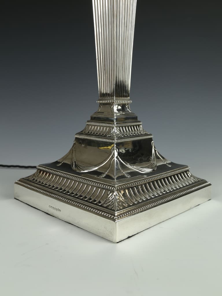 This impressive antique silver-plated table lamp, hallmarked and crafted by Walker & Hall in 1892, exudes elegance and sophistication. It features a square base with lower fluted bands and elegantly sloped sections adorned with intricate relief details of drapes and swags. The lamp is topped by a round vase-shaped capital, embellished with garlands and medallions, all supported by a square fluted tapering column.