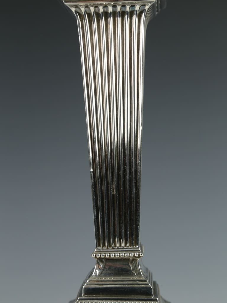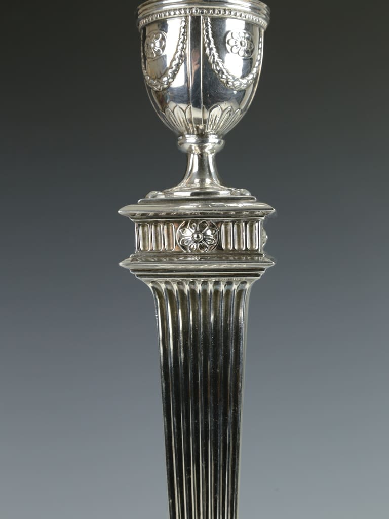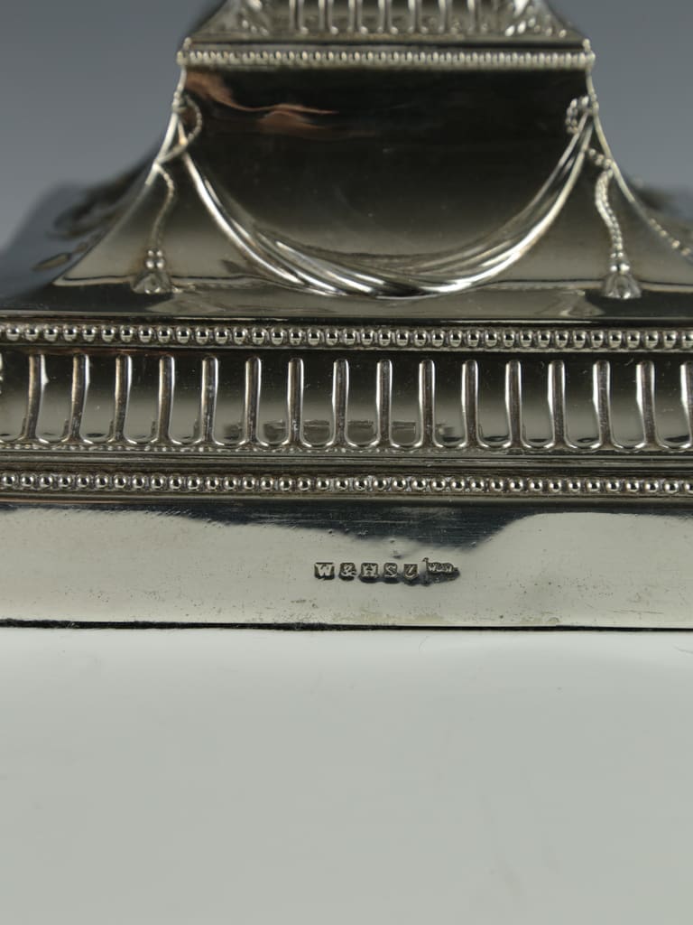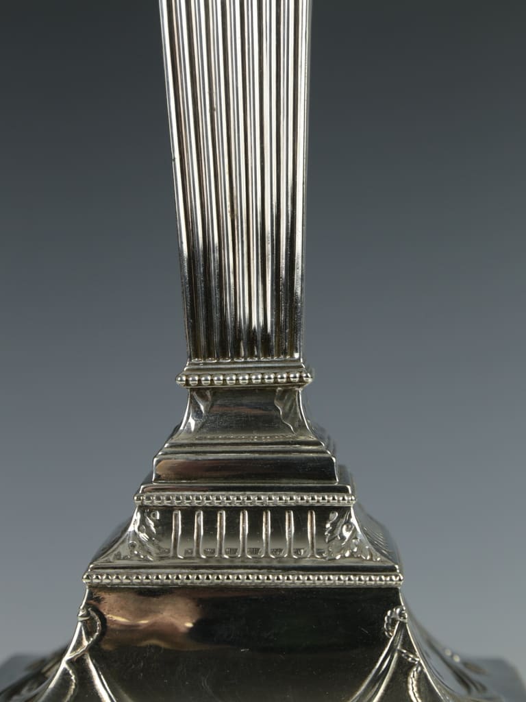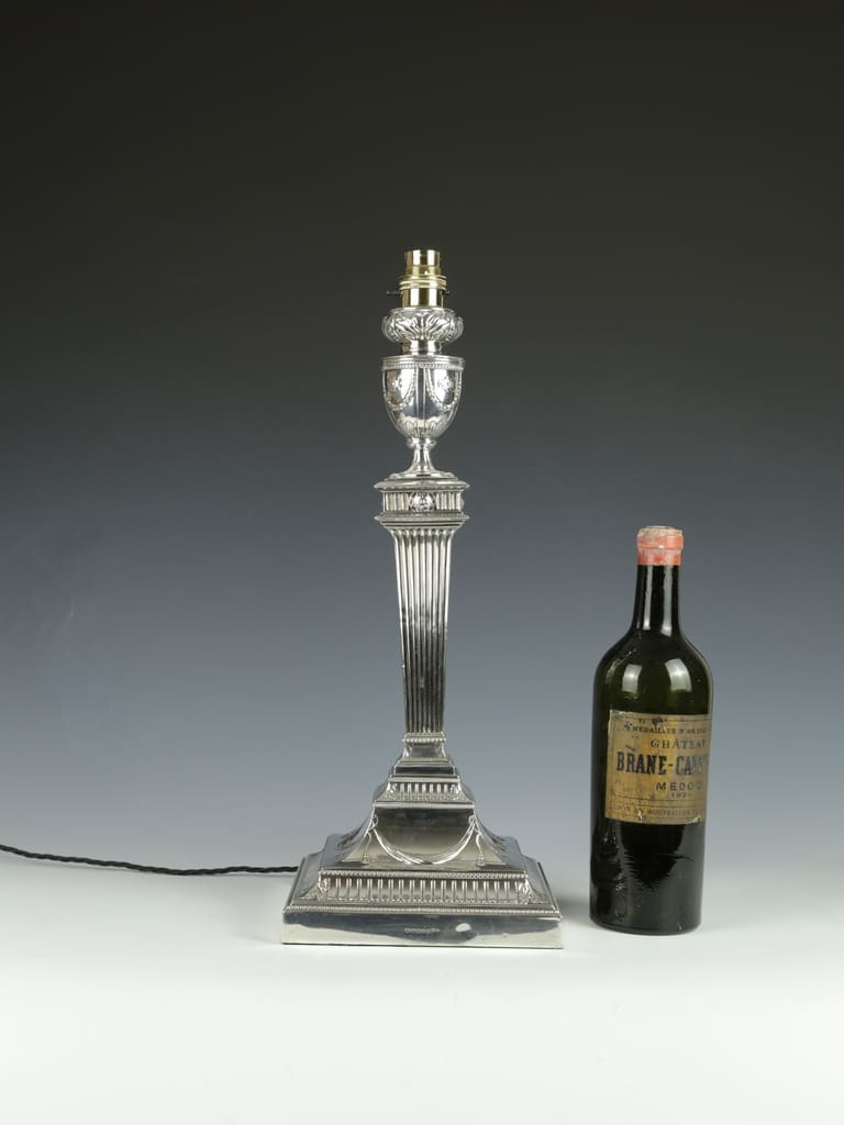 This impressive antique silver-plated table lamp, hallmarked and crafted by Walker & Hall in 1892, exudes elegance and sophistication. It features a square base with lower fluted bands and elegantly sloped sections adorned with intricate relief details of drapes and swags. The lamp is topped by a round vase-shaped capital, embellished with garlands and medallions, all supported by a square fluted tapering column.