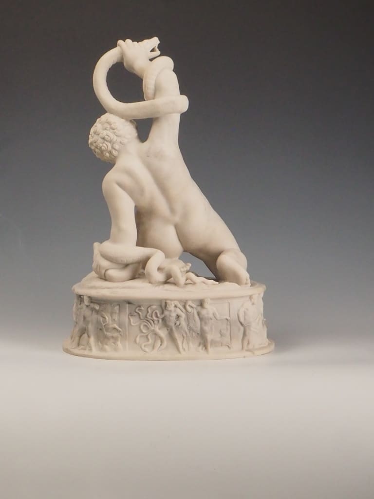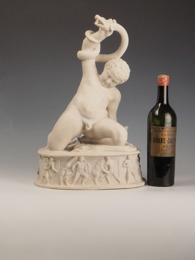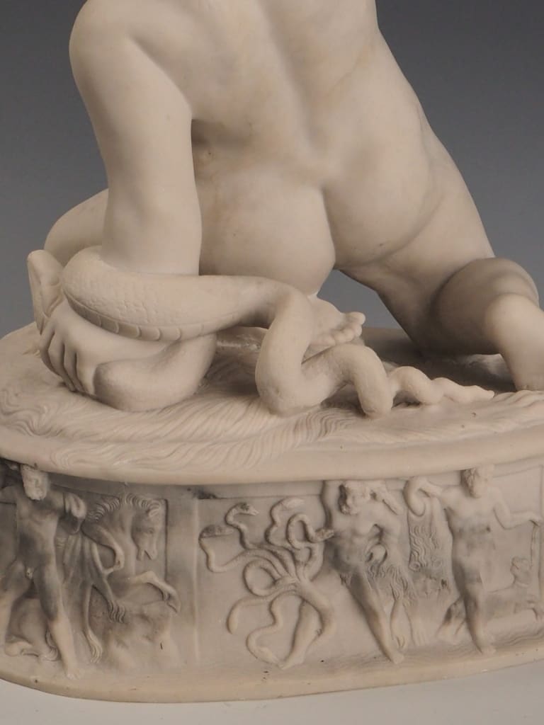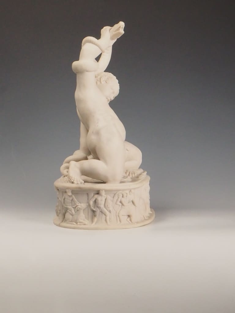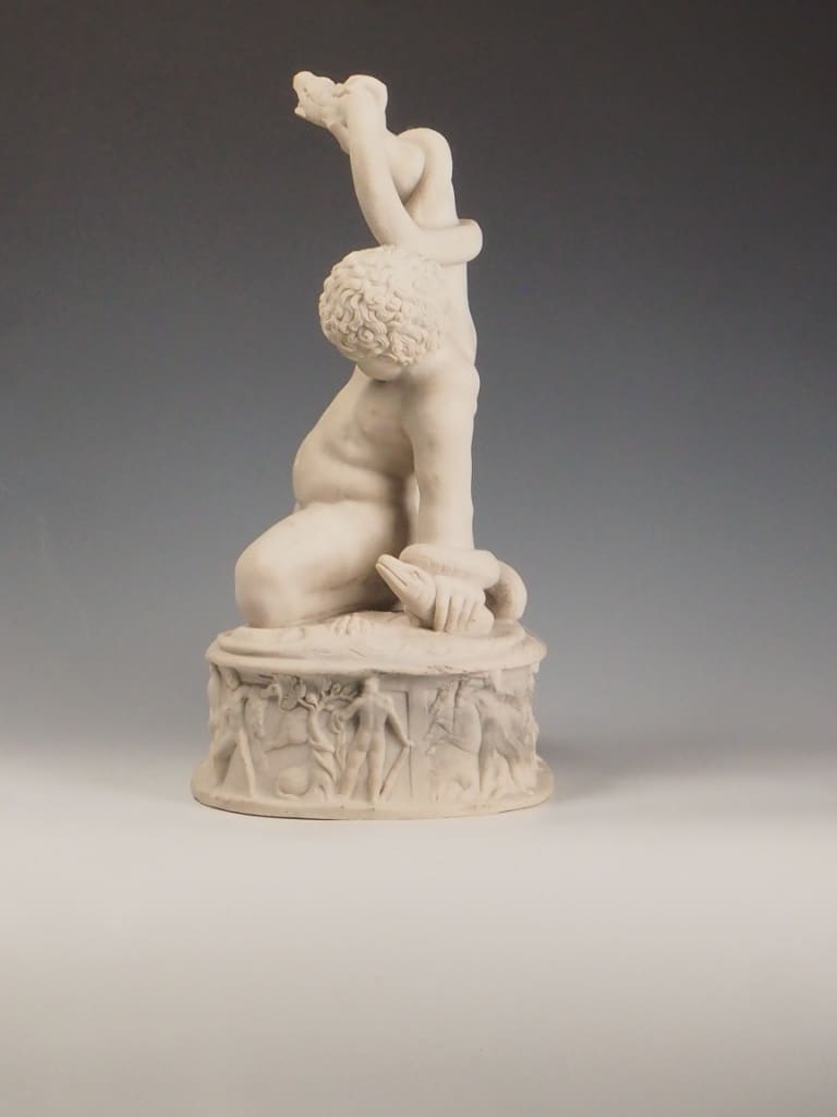 This reproduction powerfully conveys that dramatic moment. Hercules is shown kneeling firmly on a tiger skin, his expression calm but focused, as he grips the writhing serpents, each rendered with muscular realism. His youthful form is finely modelled in the Neoclassical tradition—idealised yet natural, capturing both innocence and latent power.