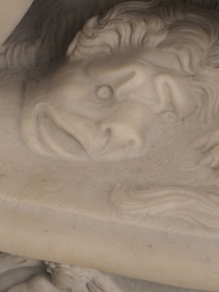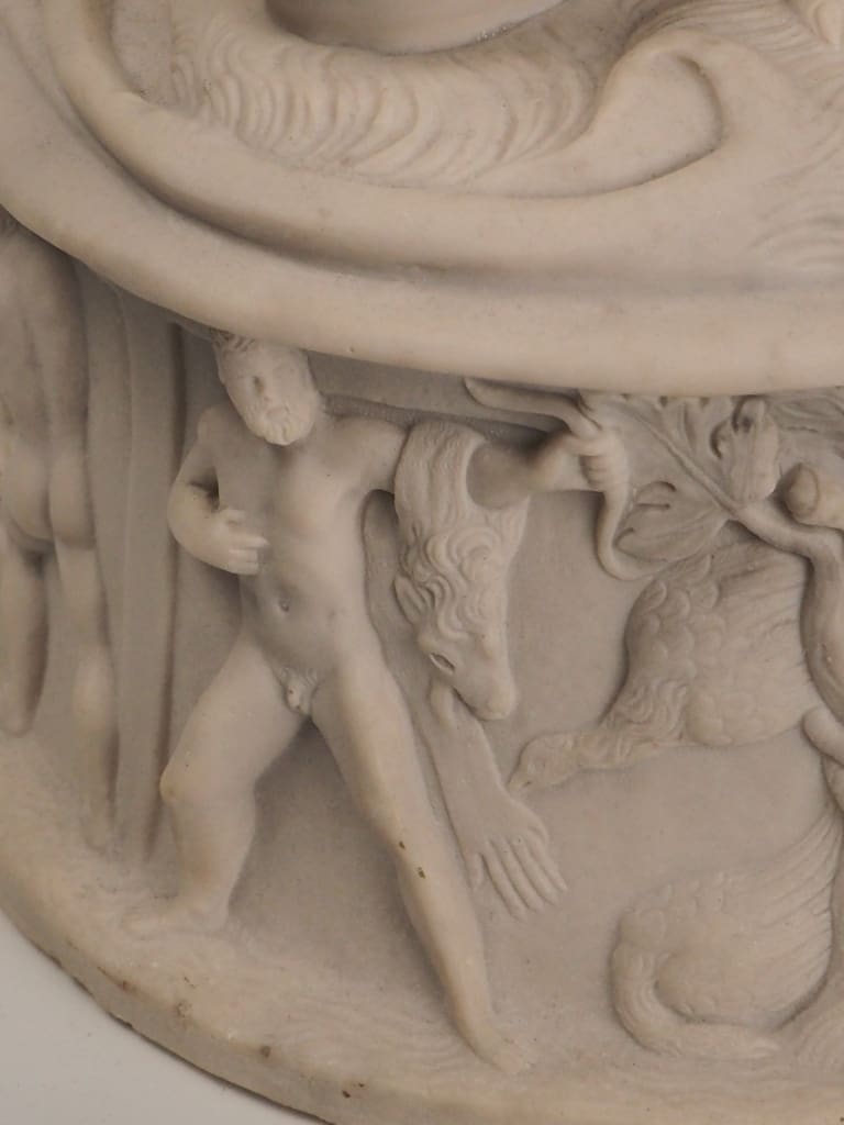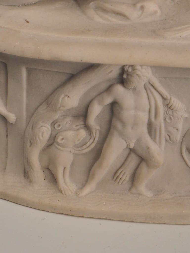 The sculpture rests atop a finely detailed plinth, edged with a sculpted frieze depicting scenes from the Twelve Labours of Hercules—from slaying the Nemean Lion to capturing Cerberus. These intricate carvings offer both decorative richness and deeper symbolic meaning, reinforcing Hercules' legendary journey from mortal to immortal.