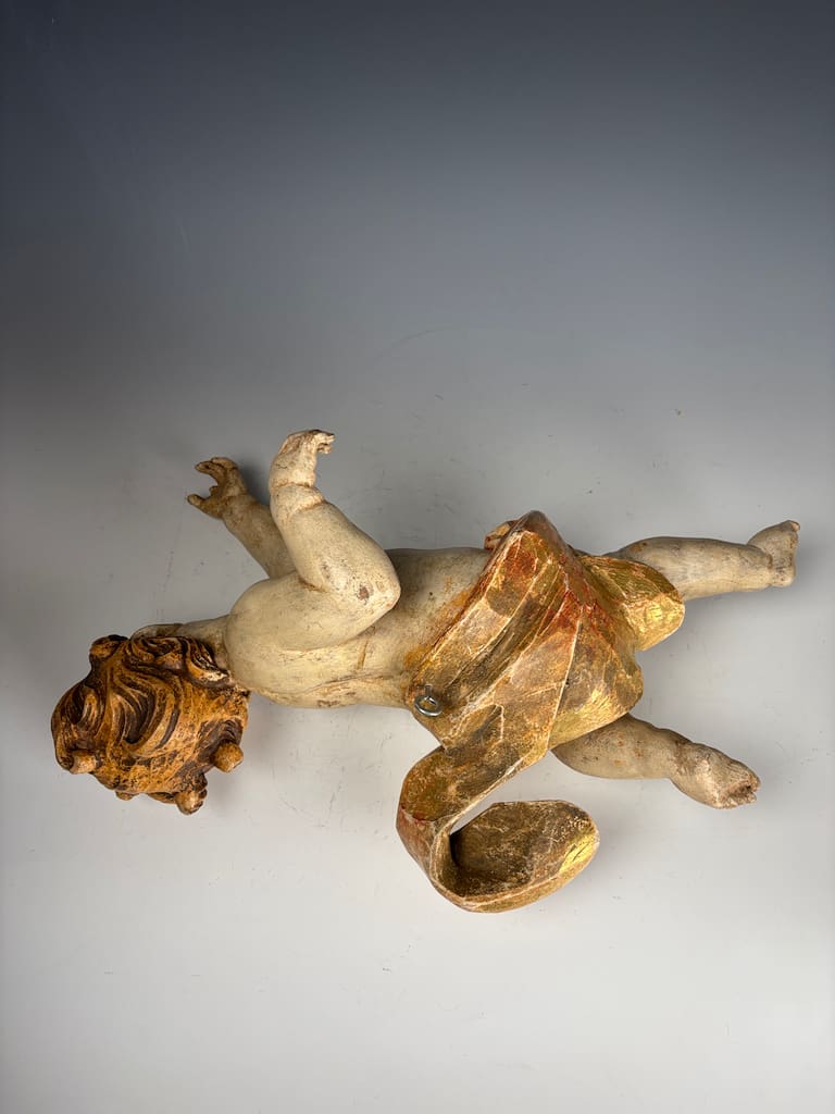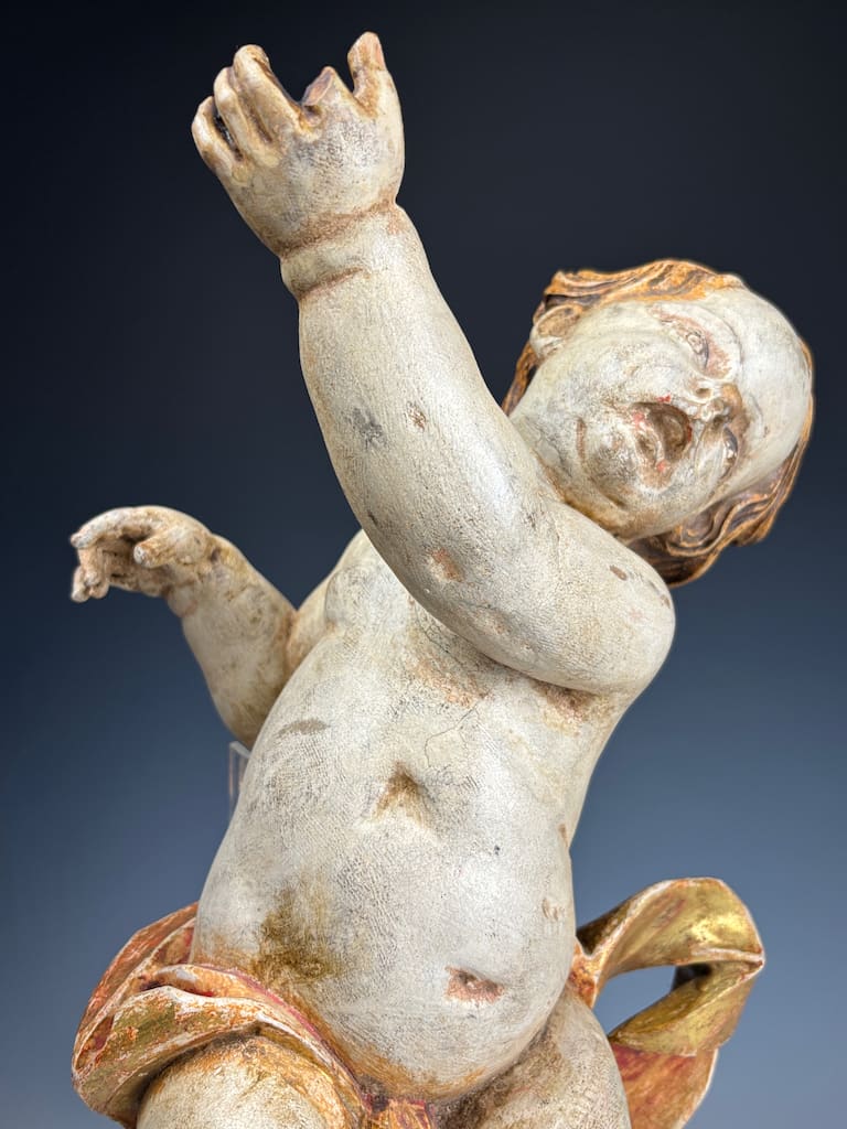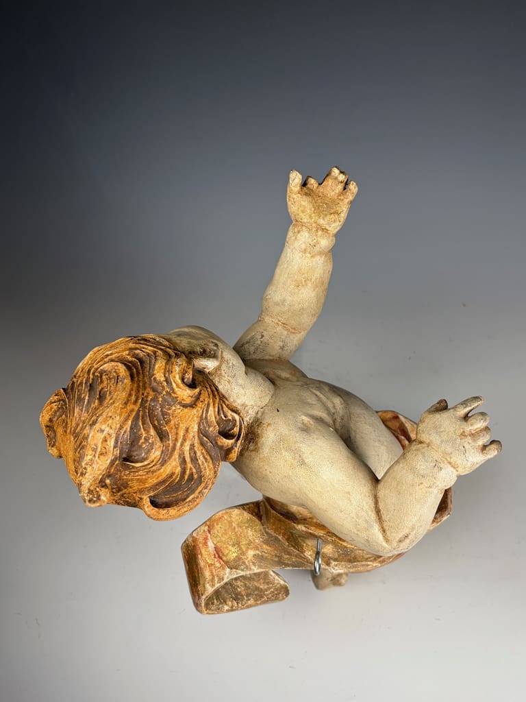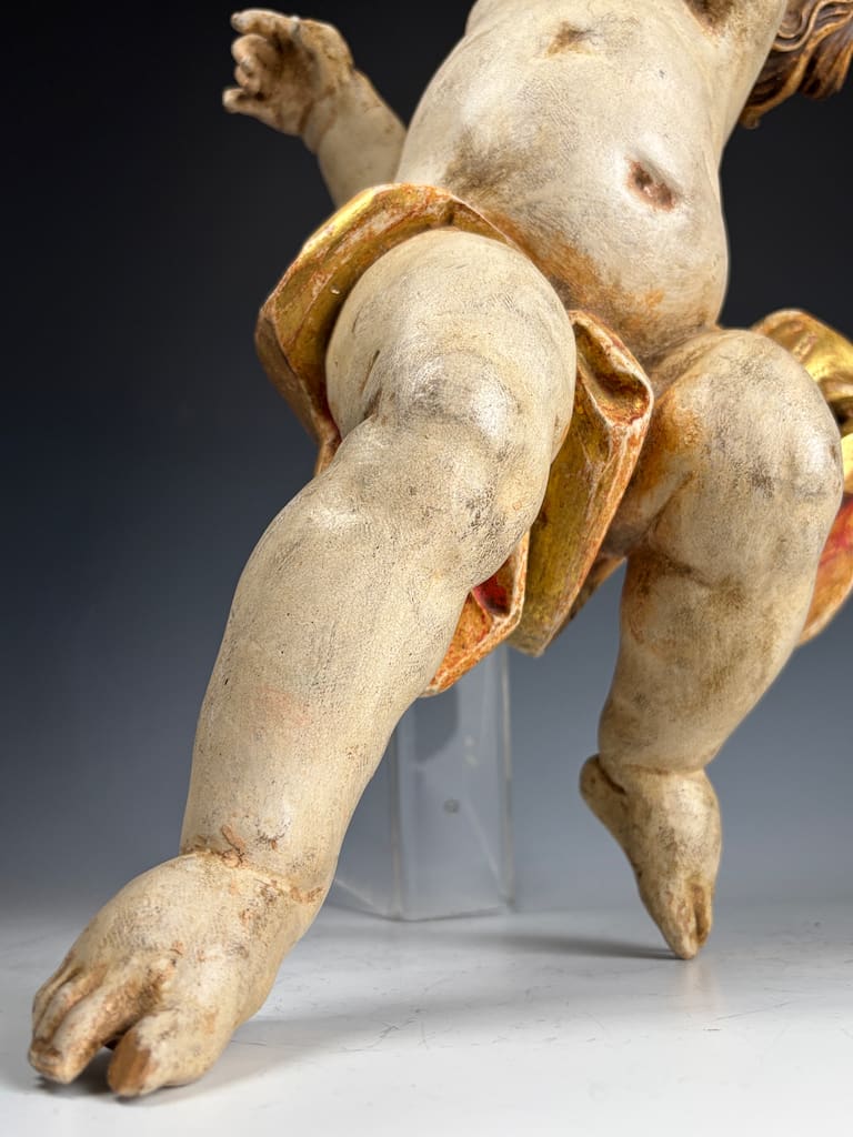 The cherub, or putto, is carved with striking expressiveness and movement, characteristic of Baroque aesthetics, which emphasized drama, emotion, and dynamism. The figure’s slightly twisted posture, raised arms, and flowing hair suggest motion and vitality, hallmarks of late 17th to 18th century sacred sculpture. Traces of the original gilding and painted details remain, particularly in the rich gold-and-red drapery that swirls around its waist, lending the piece warmth and vibrancy despite its age.
