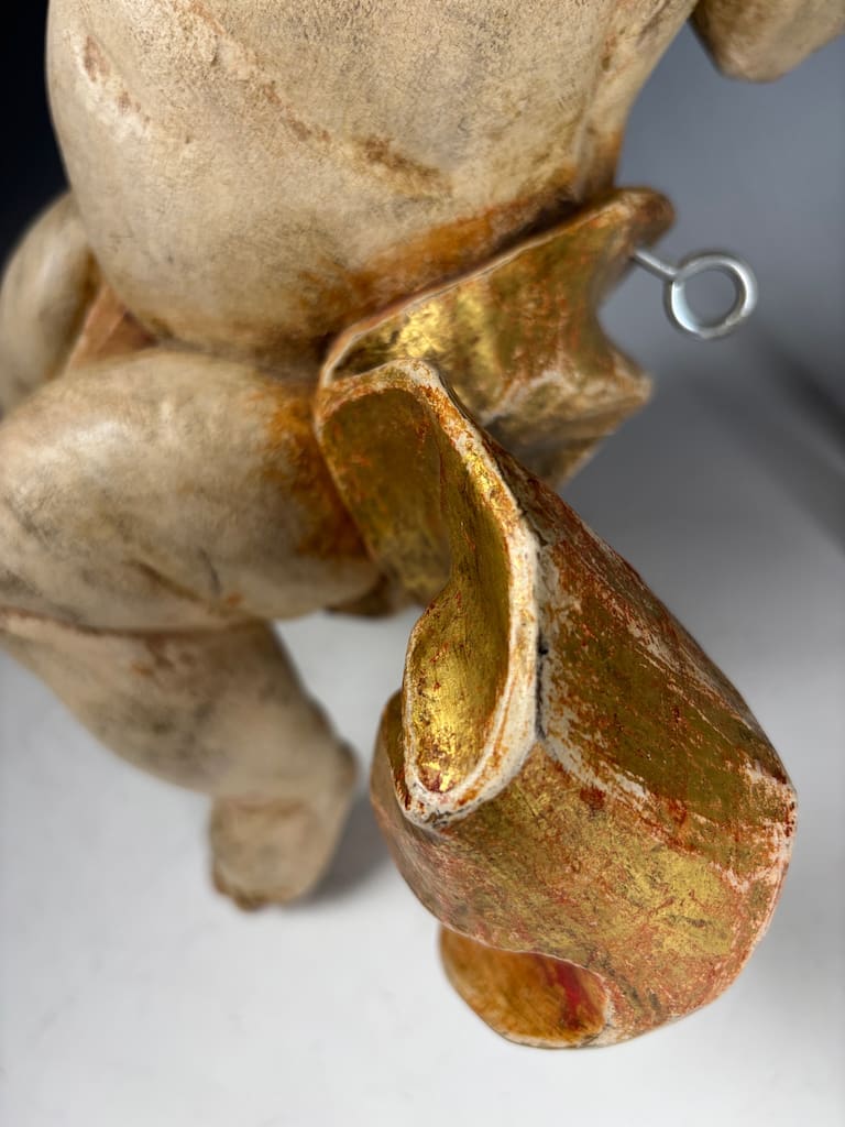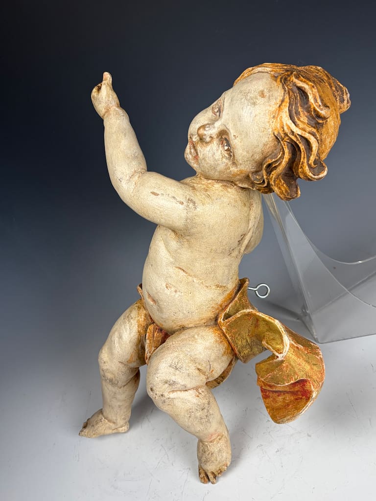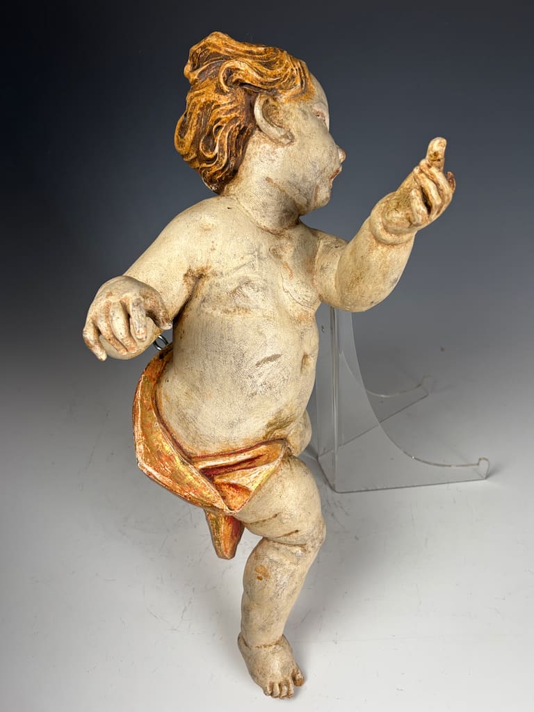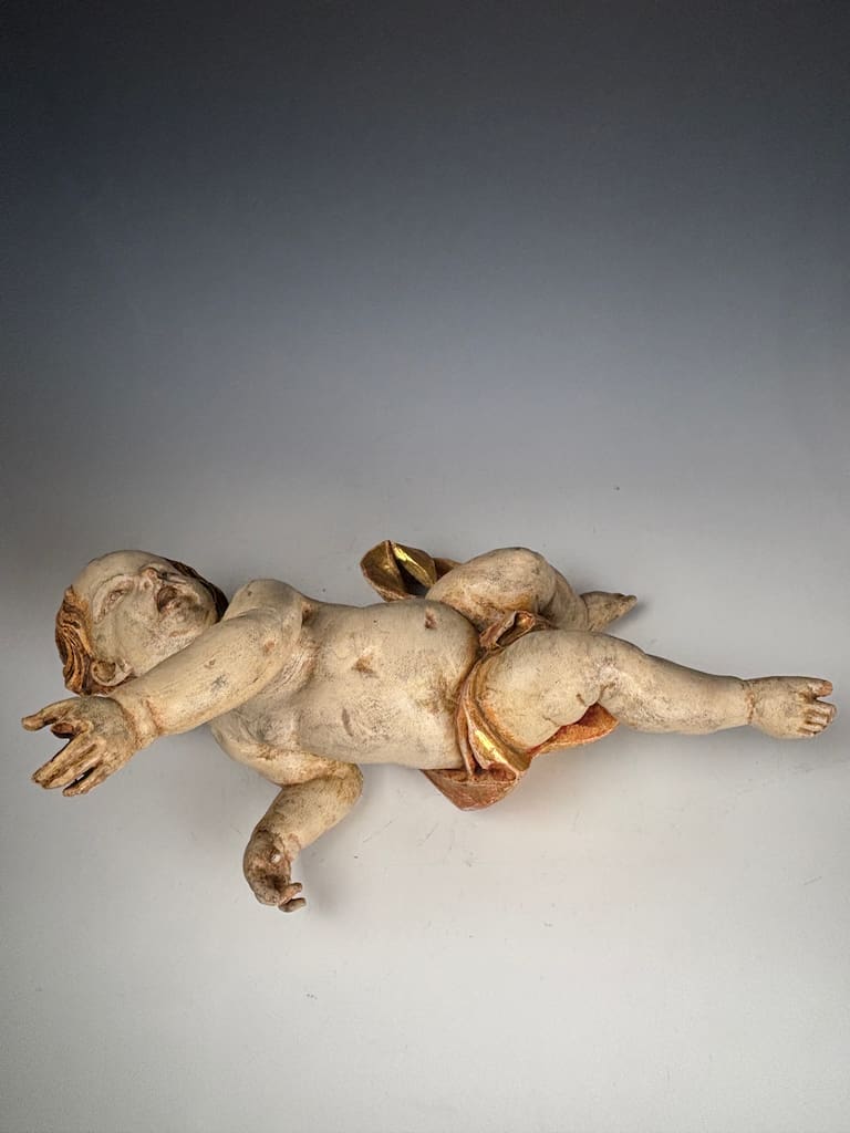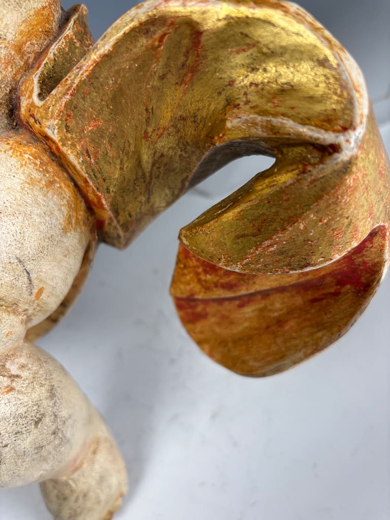 The cherub, or putto, is carved with striking expressiveness and movement, characteristic of Baroque aesthetics, which emphasized drama, emotion, and dynamism. The figure’s slightly twisted posture, raised arms, and flowing hair suggest motion and vitality, hallmarks of late 17th to 18th century sacred sculpture. Traces of the original gilding and painted details remain, particularly in the rich gold-and-red drapery that swirls around its waist, lending the piece warmth and vibrancy despite its age.