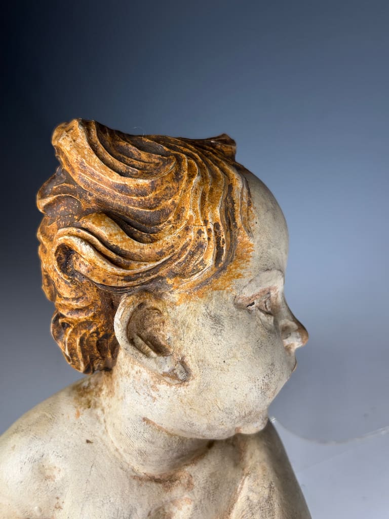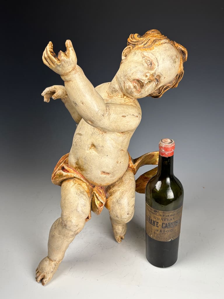 Whether displayed as a standalone statement piece or incorporated into a collection of religious or Baroque decorative arts, this putto offers a rare opportunity to own a true piece of 18th century ecclesiastical craftsmanship. It’s a compelling blend of sacred history, artistic skill, and timeless design—ideal for collectors, decorators, or anyone drawn to the emotional depth and elegance of antique sculpture.
