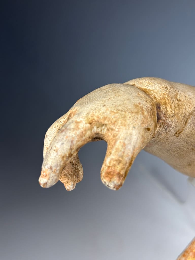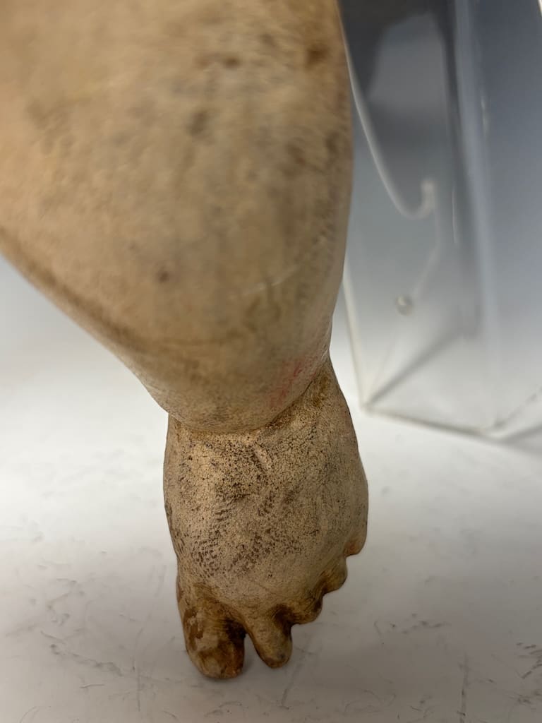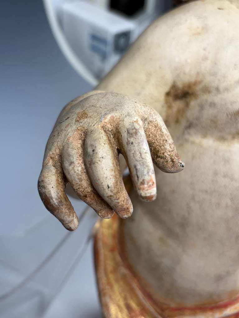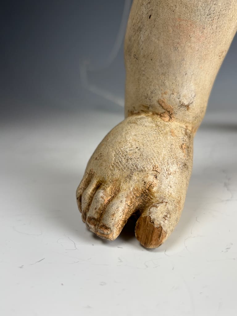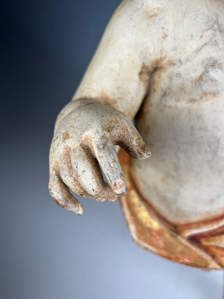 Good antique condition, consistent with its age and original use. The carved wooden figure retains significant areas of original polychrome paint and gilding, though surface wear is visible throughout. Notable losses include a broken finger and toe, and minor chips.