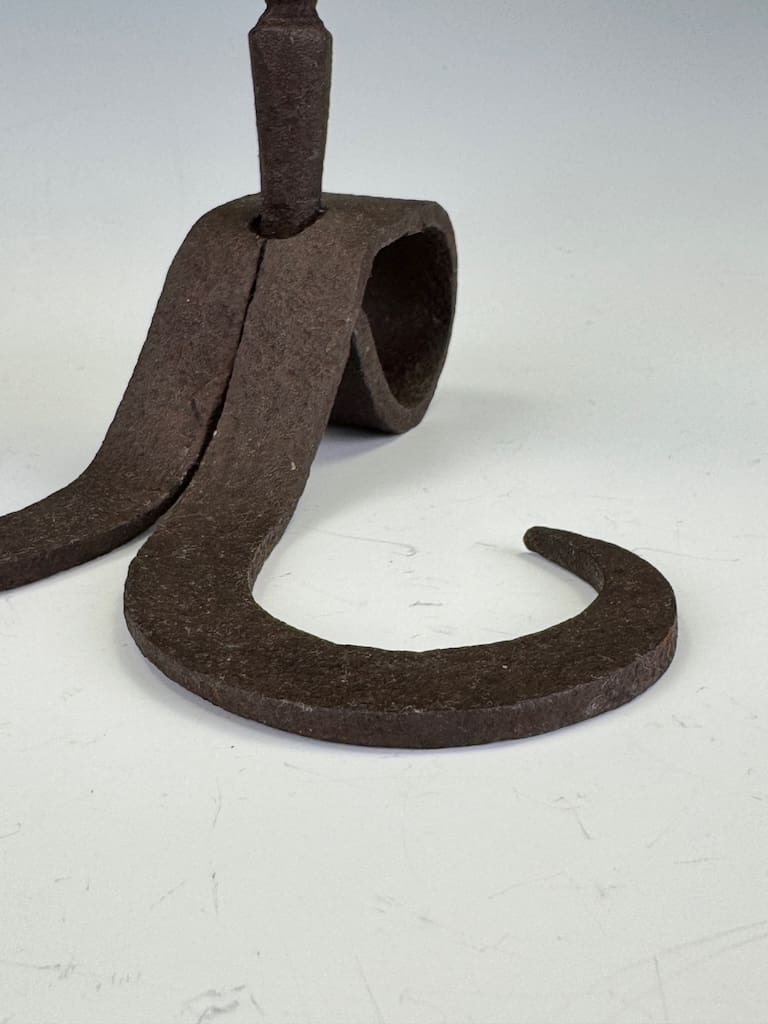 A superb and rare pair of mid to late 18th-century Flemish wrought iron candle holders, masterfully hand-forged in the traditional manner by Northern European blacksmiths. Each piece is sculpted from a single length of iron, exhibiting exceptional craftsmanship with finely twisted shafts, subtly flared bobeches, and elegant tripod bases terminating in scroll feet.