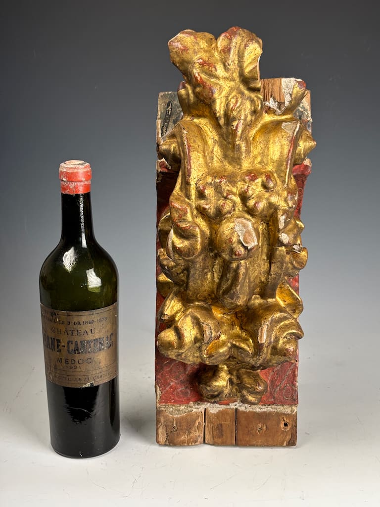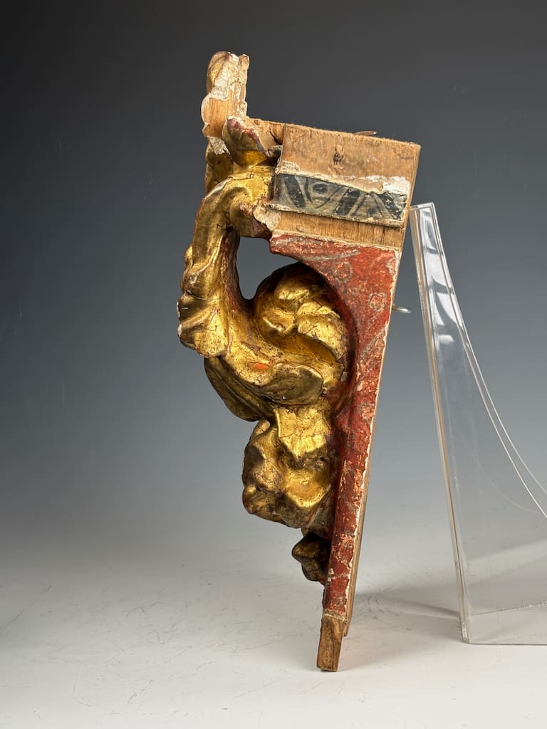 The piece displays a vigorous composition of scrolling acanthus and foliate forms, deeply modelled and embellished with water-gilded surfaces, the whole set against a painted red ground with further linear ornament. Its robust carving, enhanced with a mellowed burnished gilding now softly worn through age, speaks to the skilled hand of a Baroque or early Rococo craftsman.