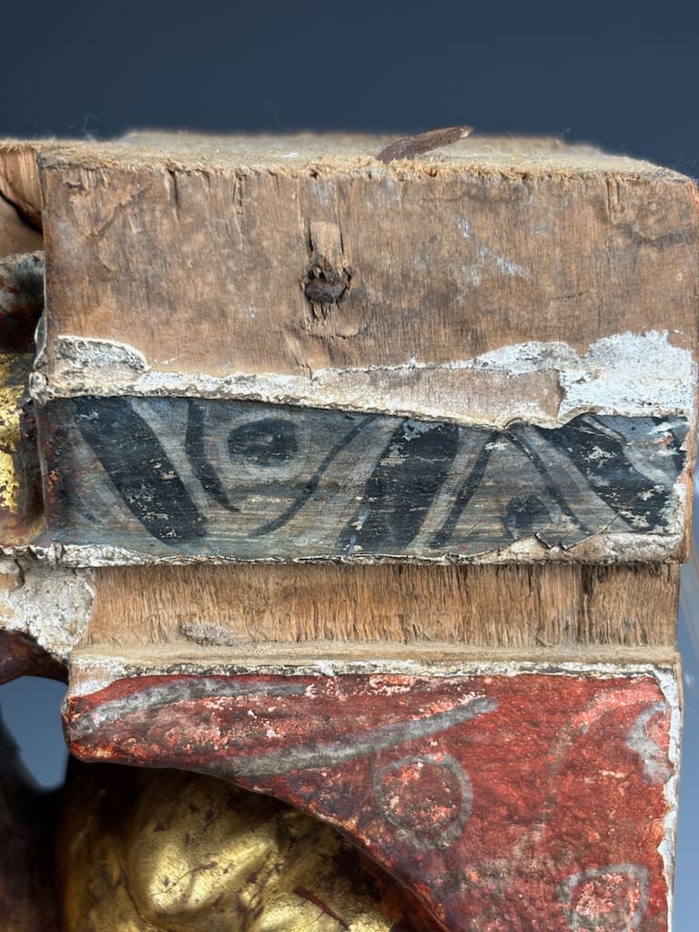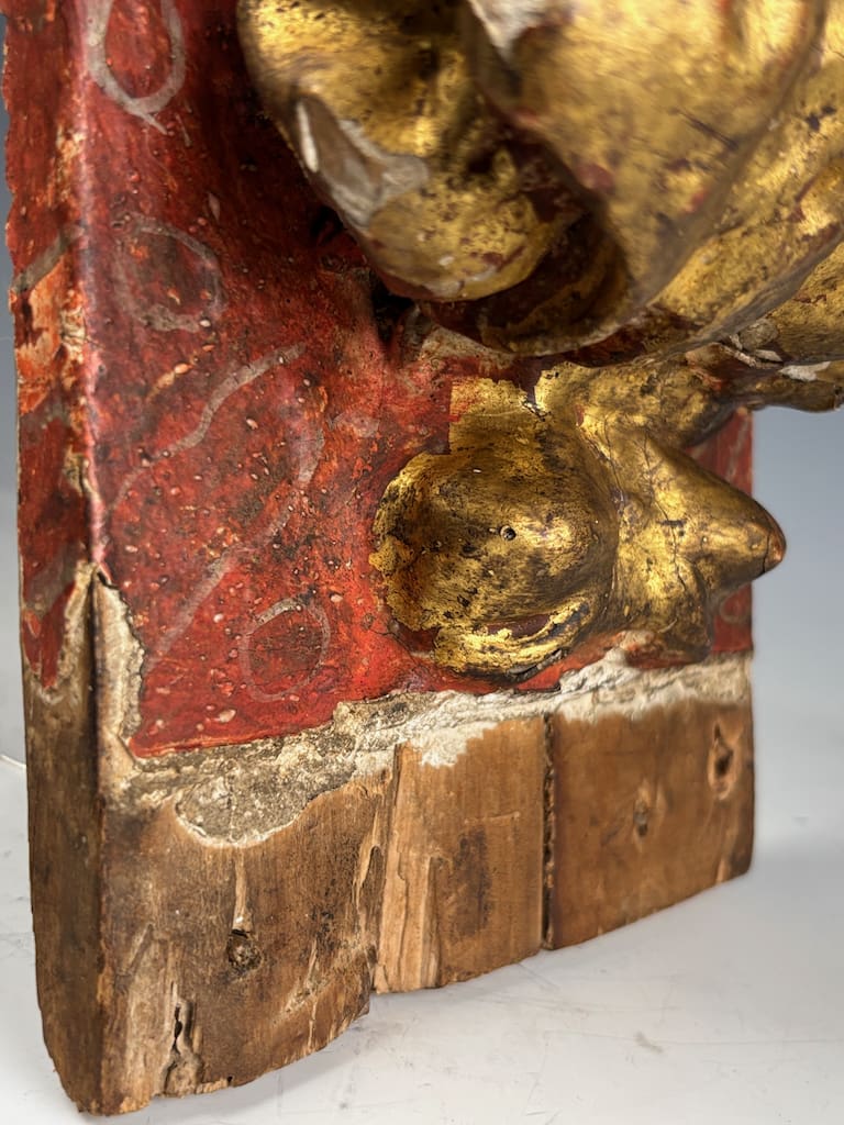 The condition is consistent with age, with areas of wear, shrinkage and old surface losses, all contributing to its historic character and authenticity. The surviving layers of gilt and polychromy lend great depth and richness, while the fragmentary nature only enhances its sculptural presence as an objet de vertu today.