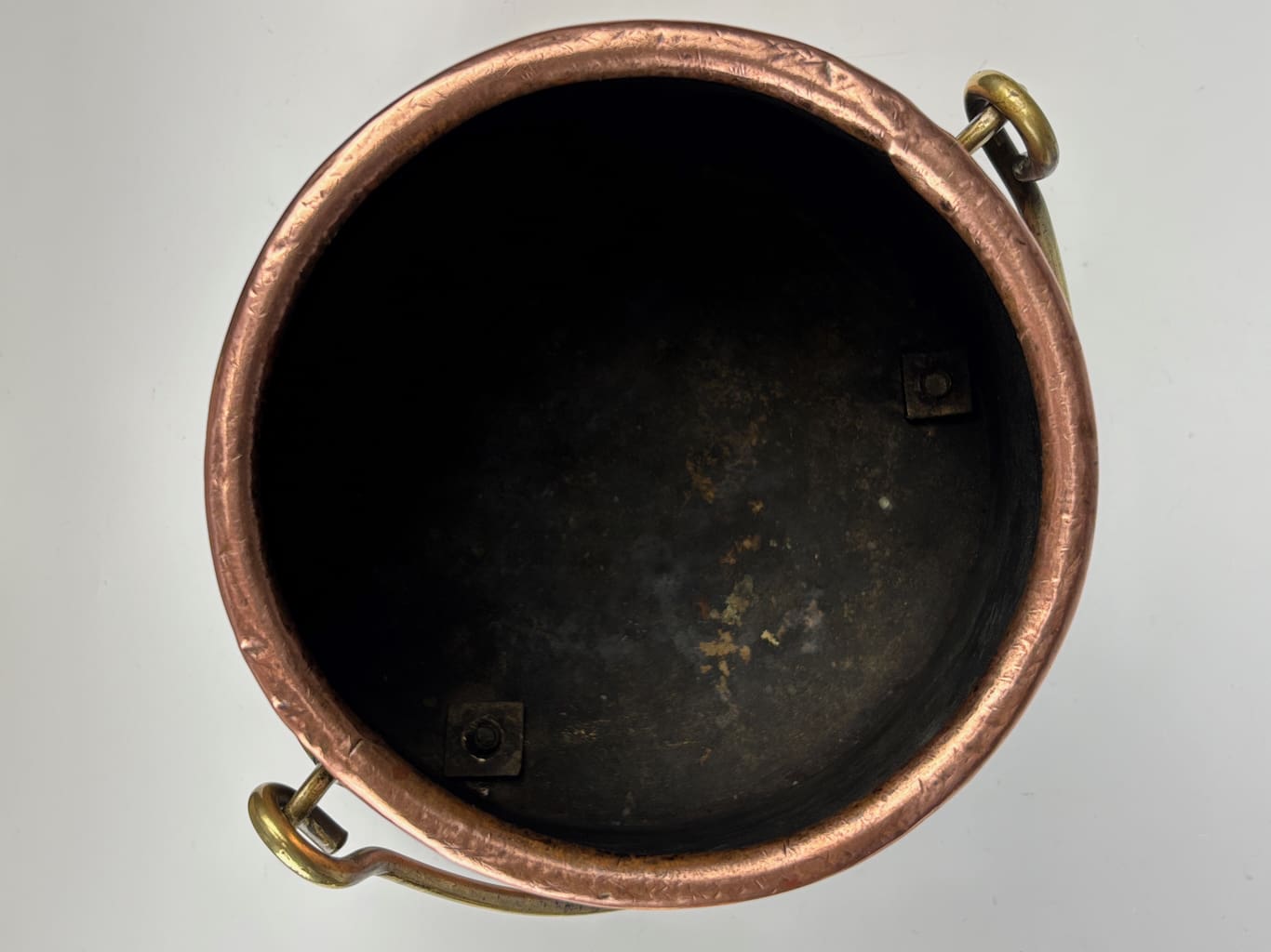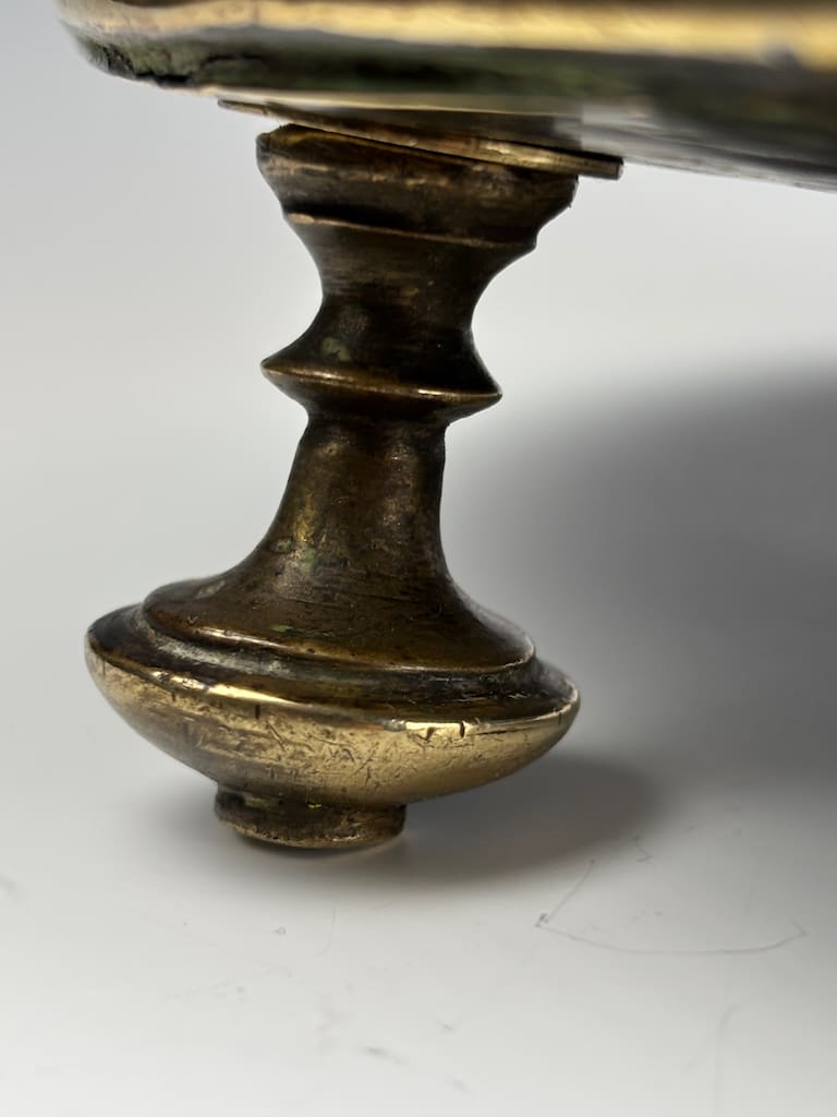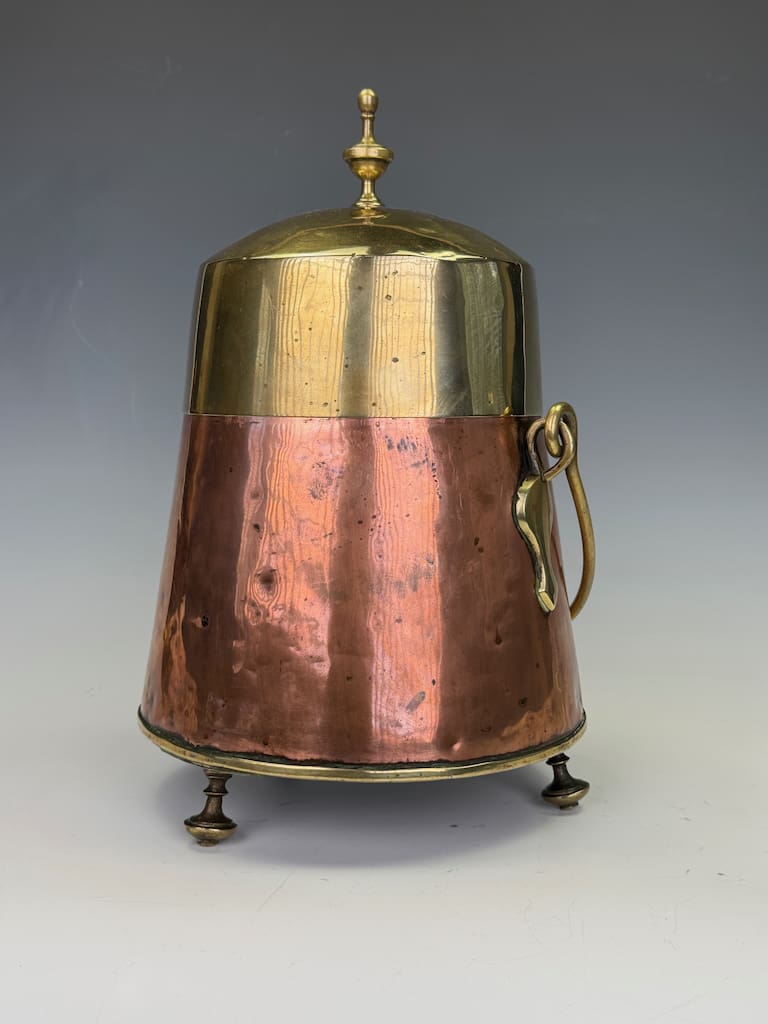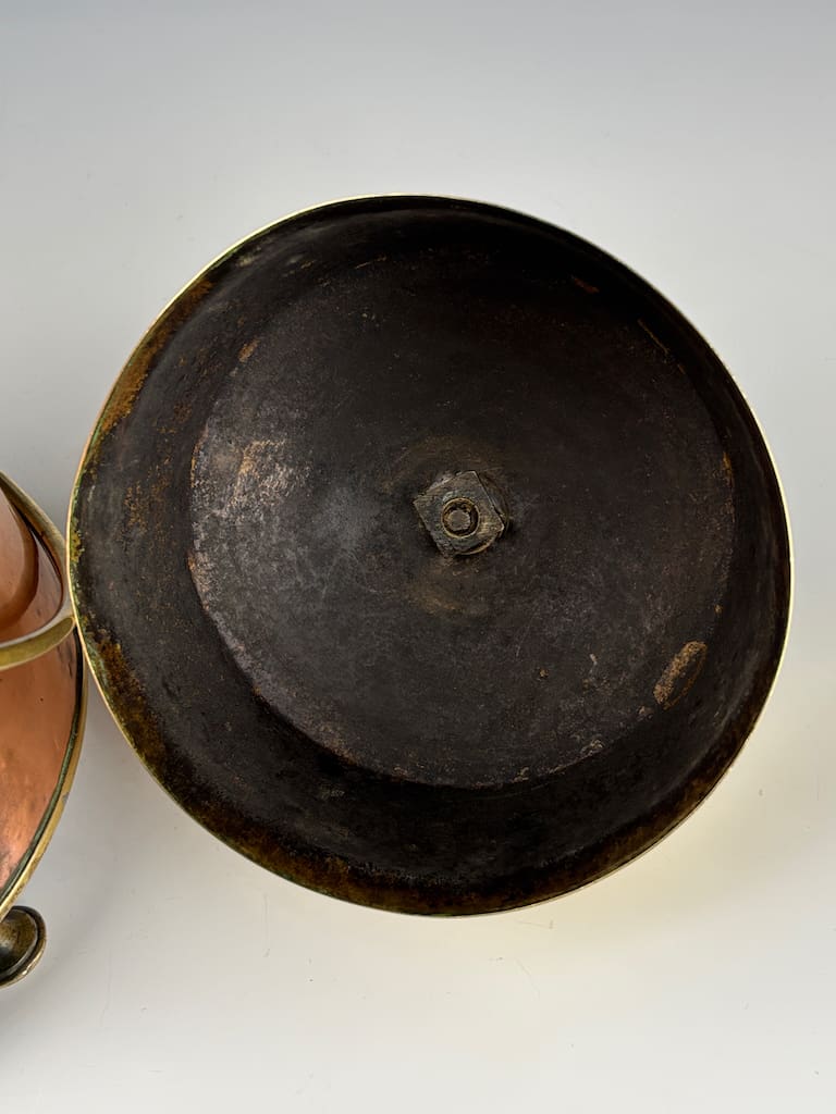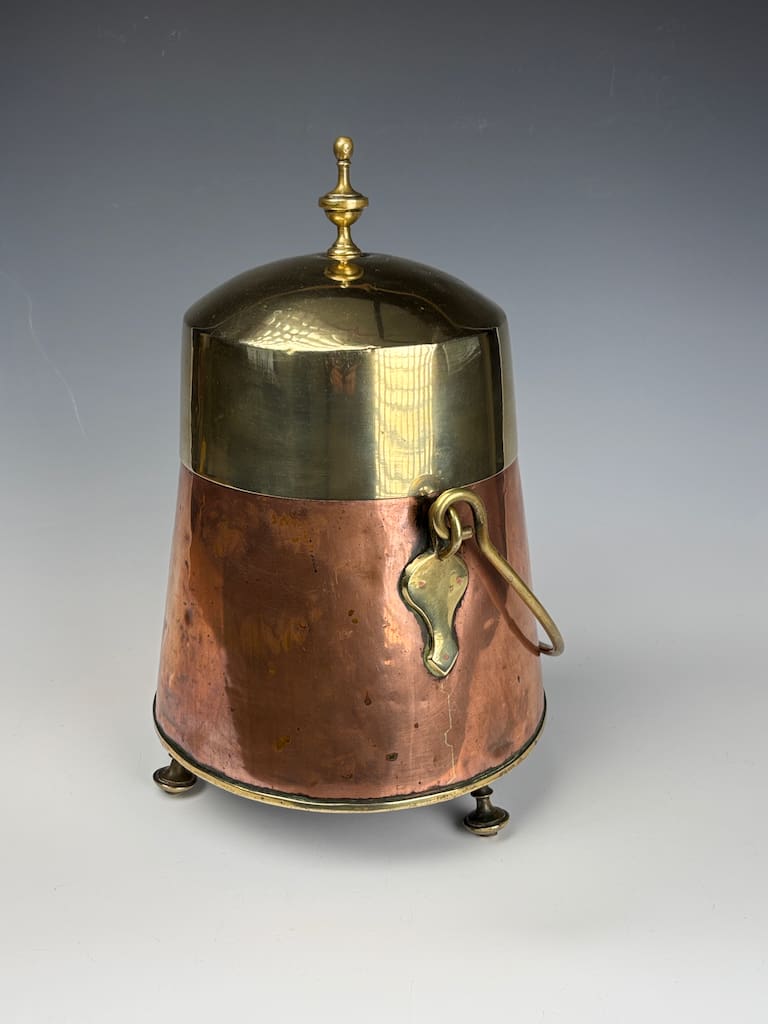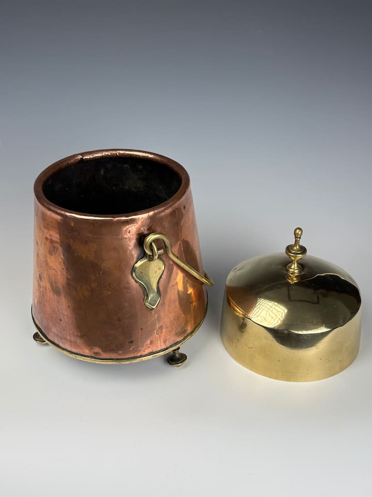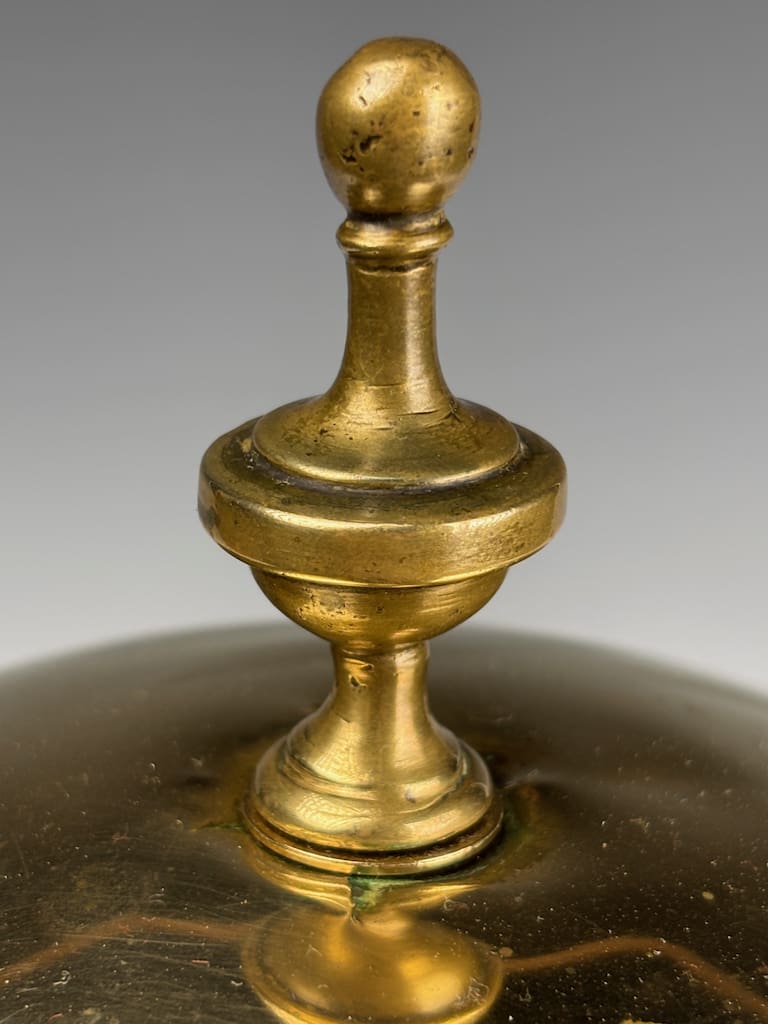 The lid is a perfect example of purpose-driven design: a heavy, seamless brass dome topped with a turned finial. When placed firmly on the rim, it would have created an airtight seal, starving the embers of oxygen and extinguishing them safely. The sturdy, riveted ring handles and three small brass feet complete the form, lending it both stability and a refined decorative air.