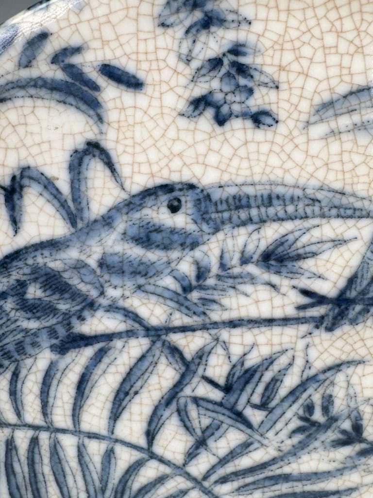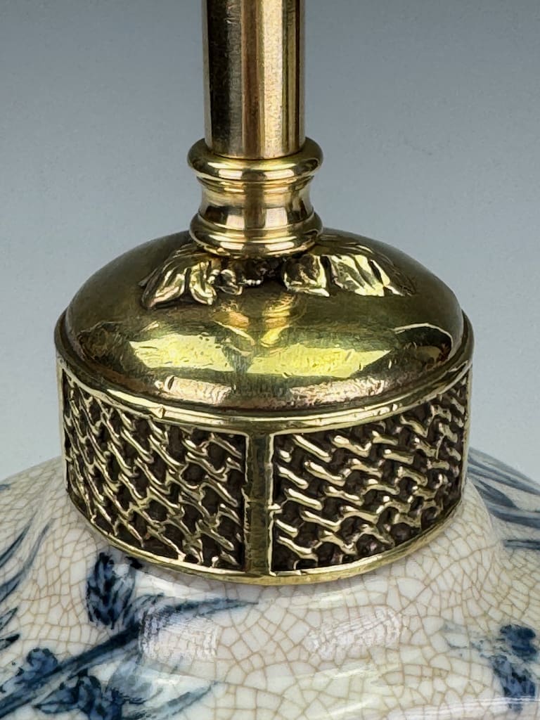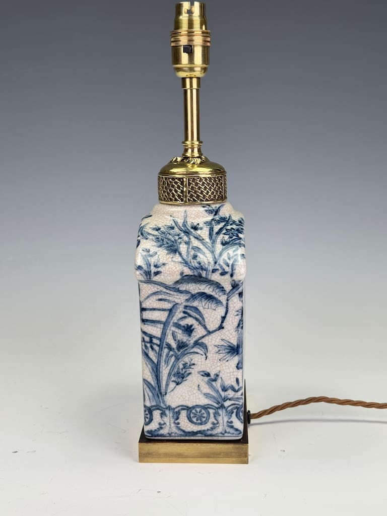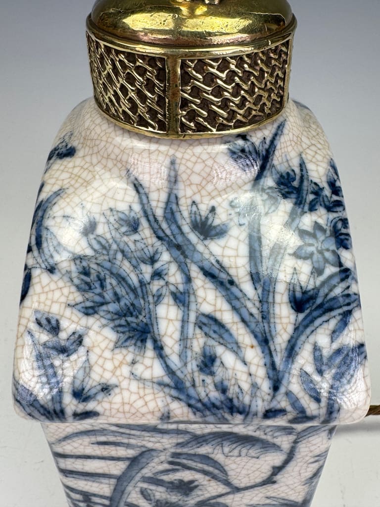 The lamp base is crafted from a fine earthenware with a delicate, finely crazed glaze that adds a wonderful antique patina. The intricate hand-painted decoration in cobalt blue depicts a series of exotic birds, possibly mythical or stylised pheasants, amidst a dense and lush landscape of ferns, bamboo, and stylised flora. A captivating feature is the circular sun-like motif with radiating lines, a strong nod to Japanese influence, particularly the rising sun of the Meiji period. Below this central scene, a decorative border of interlocking scrolls and stylised medallions completes the composition.