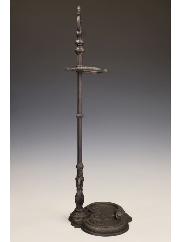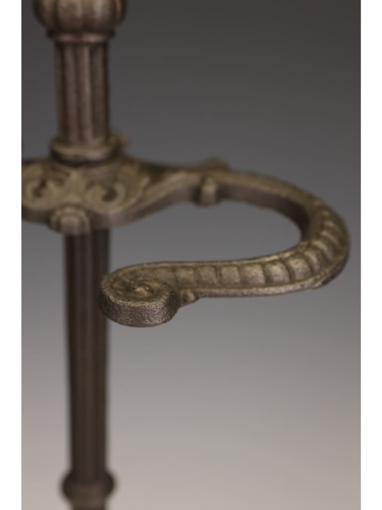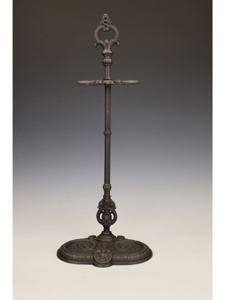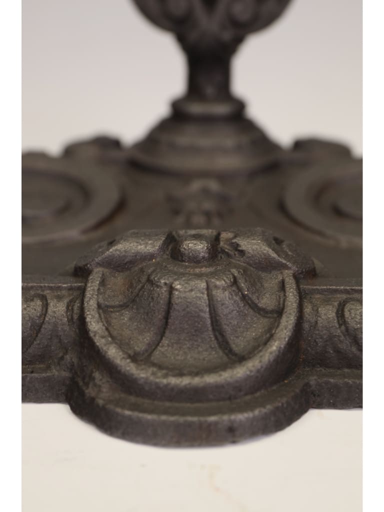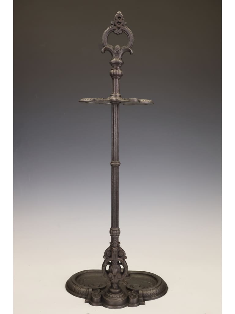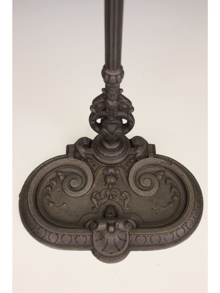 Crafted from solid, heavy cast iron, the stand features a tall, commanding profile defined by a central columnar shaft adorned with distinct neo-classical and foliate ornamentation.