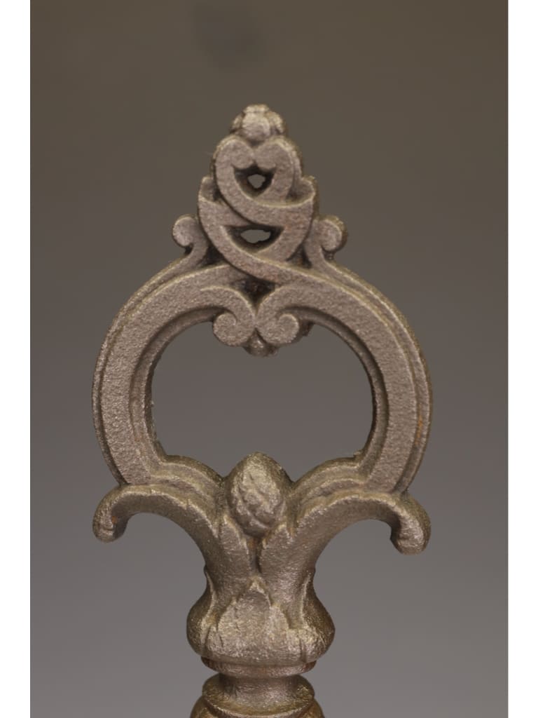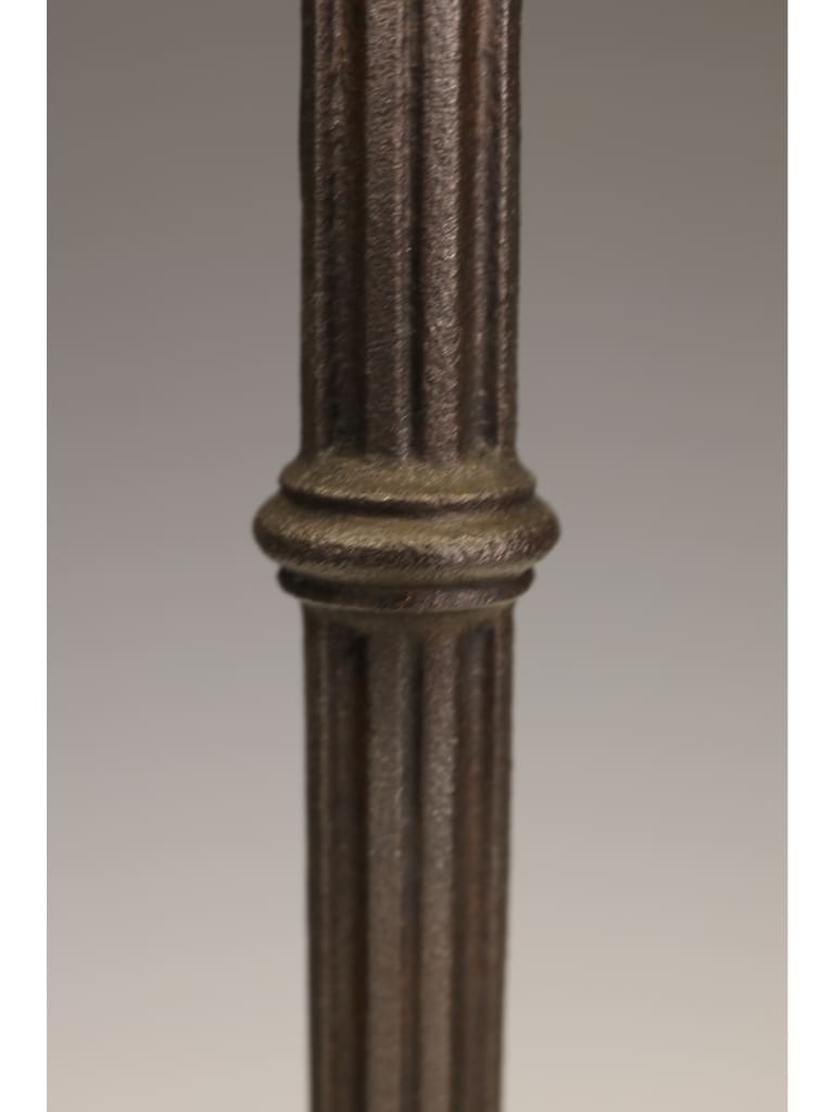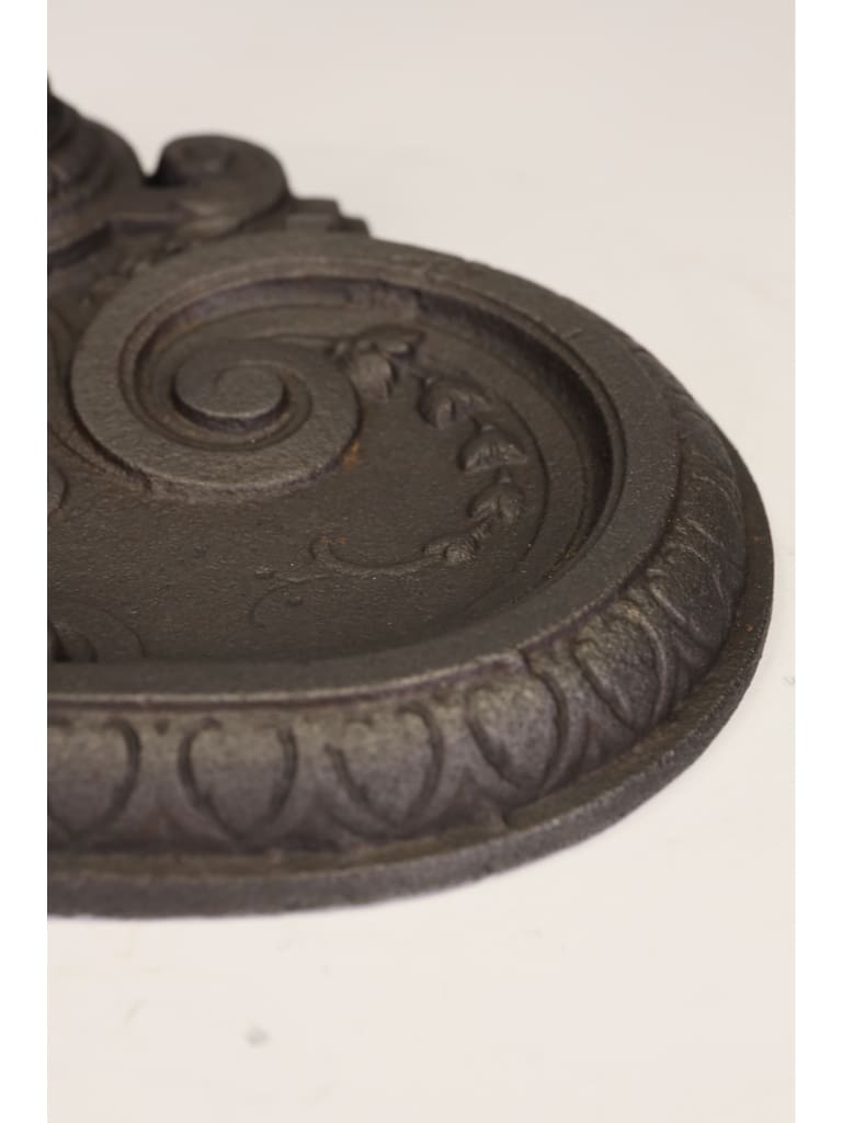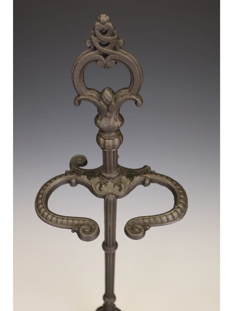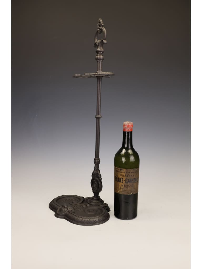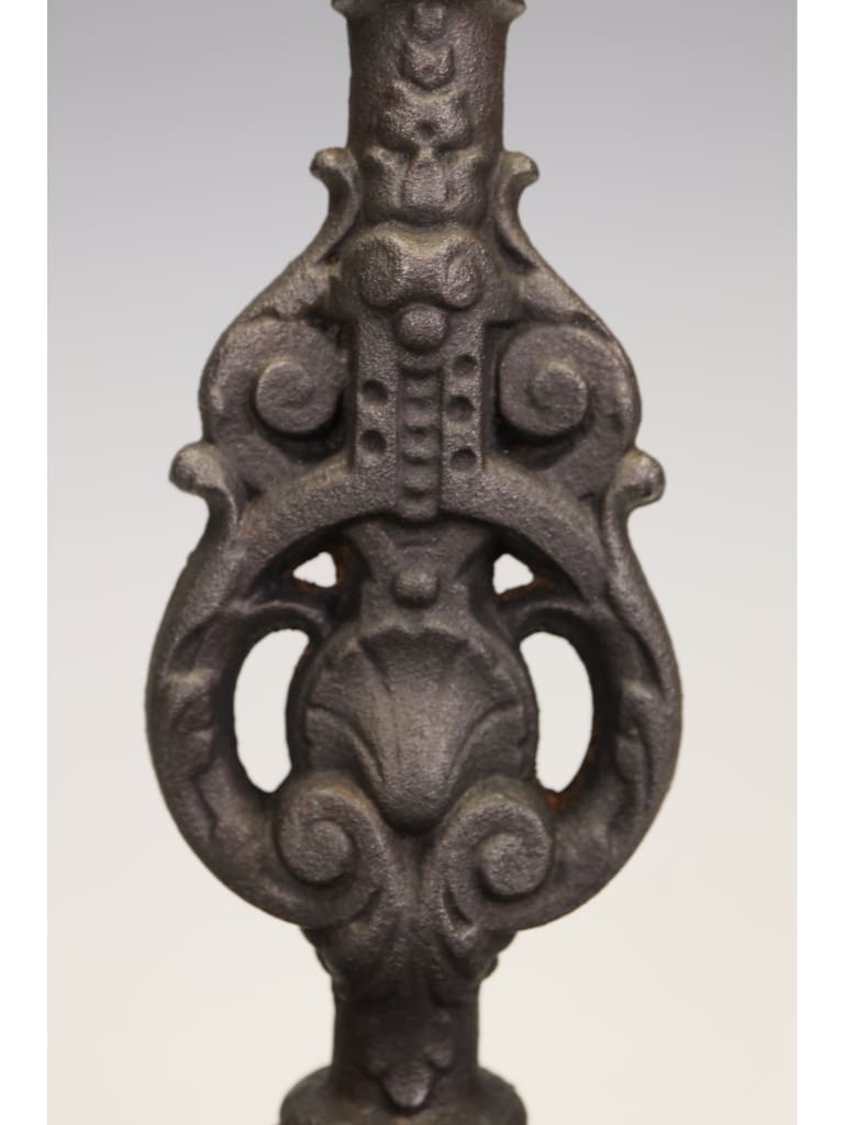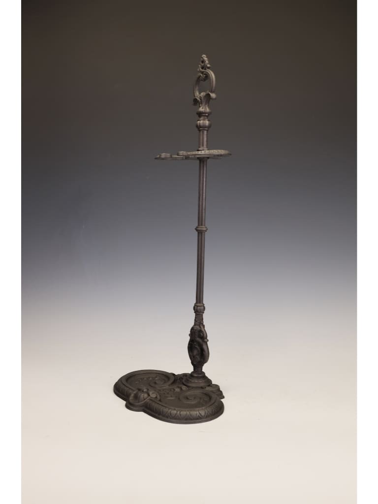 Crafted from solid, heavy cast iron, the stand features a tall, commanding profile defined by a central columnar shaft adorned with distinct neo-classical and foliate ornamentation.