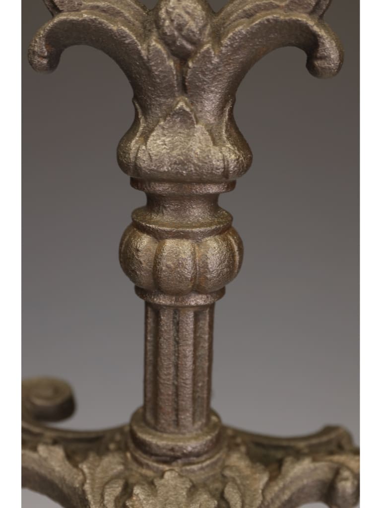 The central support is delicately ribbed and punctuated by an ornate knop featuring scrolling foliage and anthemion-style elements in high relief, firmly placing the design within the popular revival styles of the late 19th century, particularly Neo-Classicism and Napoleon III aesthetics.
