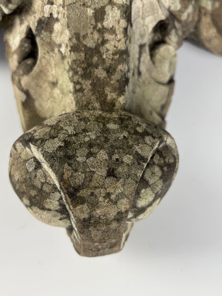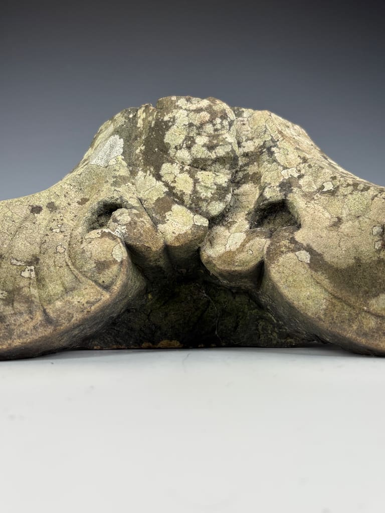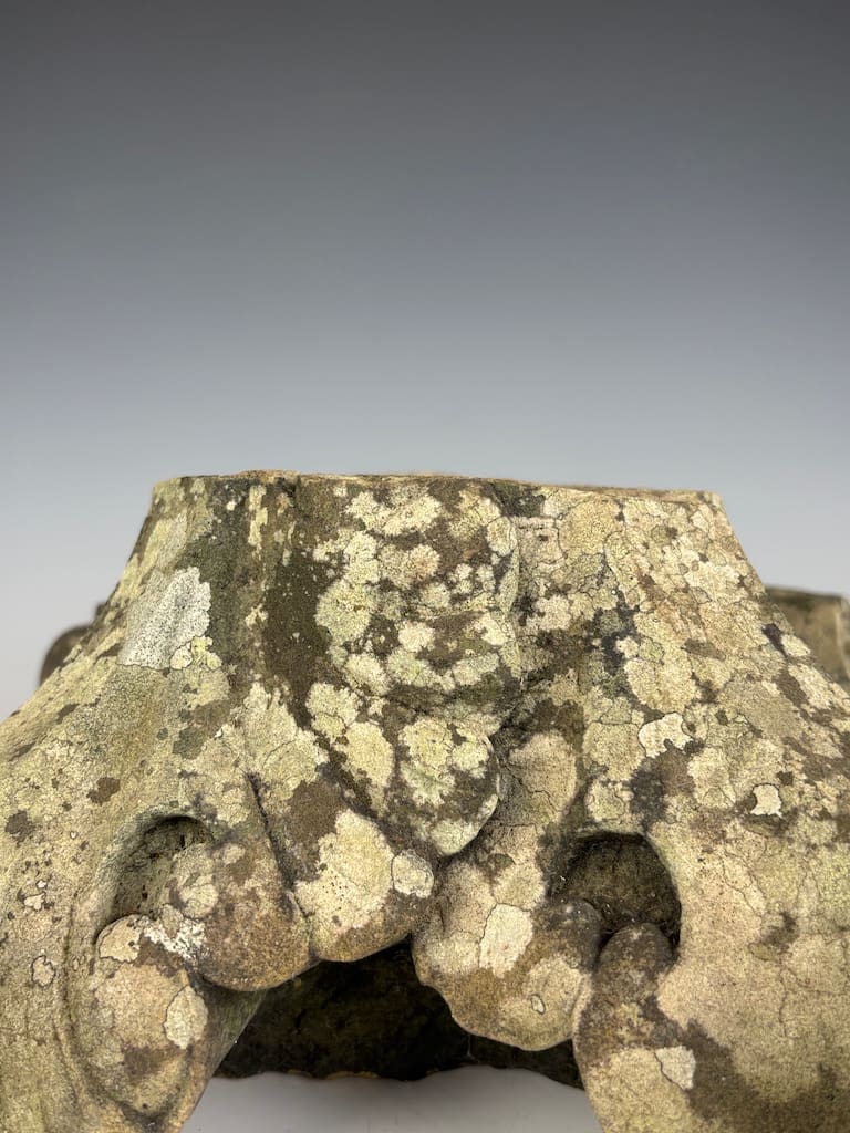 The item is offered in its found, "as-is" condition, consistent with over a century of outdoor exposure. The surface of the carved stone has developed a magnificent, natural patination, a highly desirable characteristic for a piece of this age. The stone is covered in a rich tapestry of mosses and lichens, presenting a beautiful variety of green, gray, and ochre tones. This natural growth confirms its authenticity and longevity as a garden ornament.