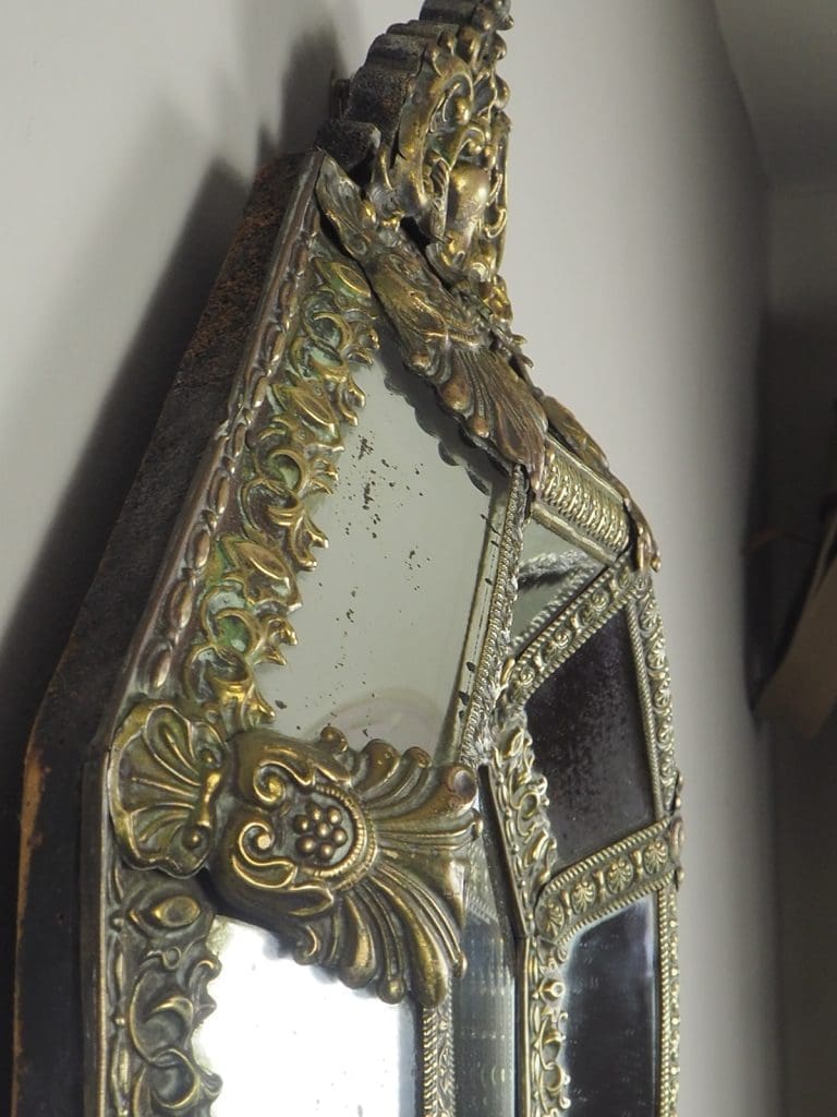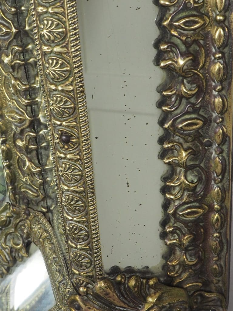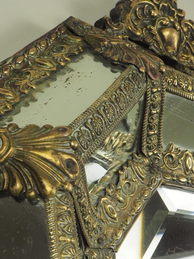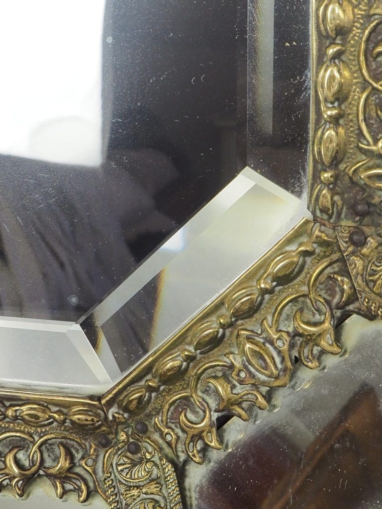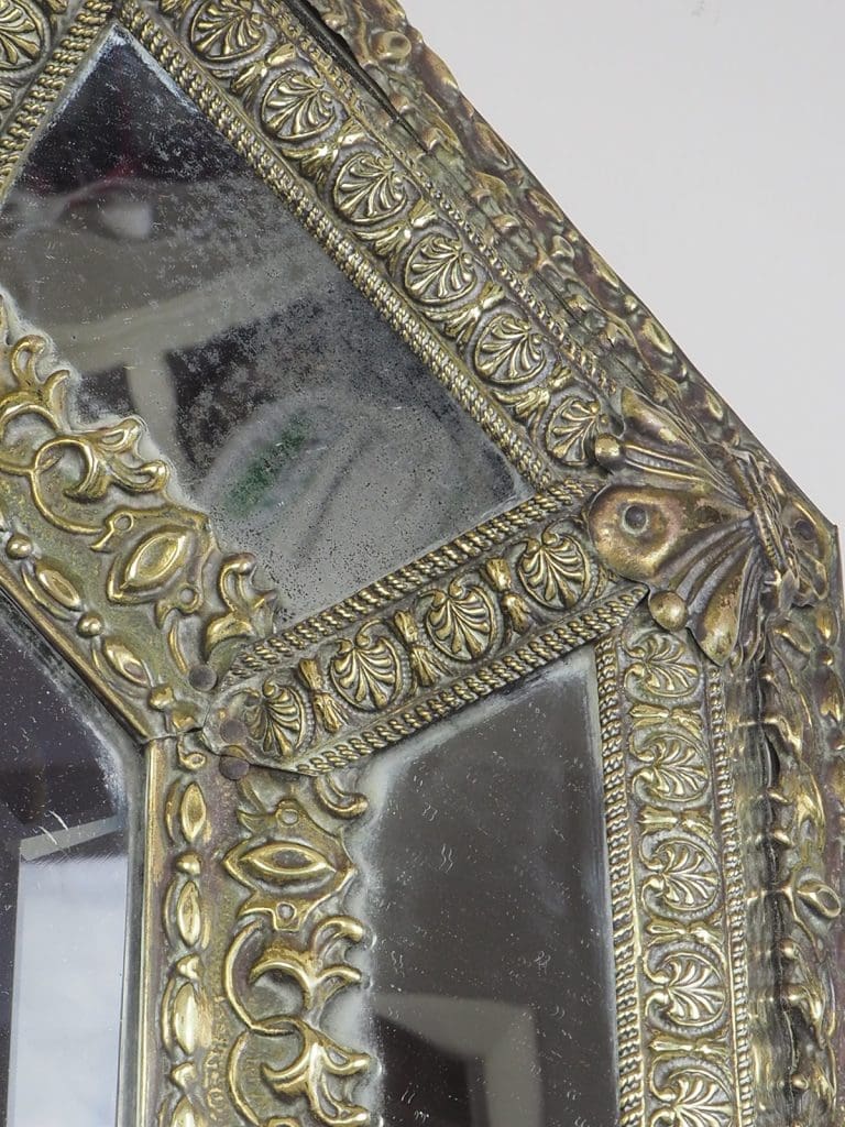 Description 19th century French repousse cushion hexagonal brass relief wall mirror is a true testament to the elegance of the Napoleon III period. Crafted with meticulous attention to detail, this mirror features a central beveled glass that adds a touch of sophistication to any space.