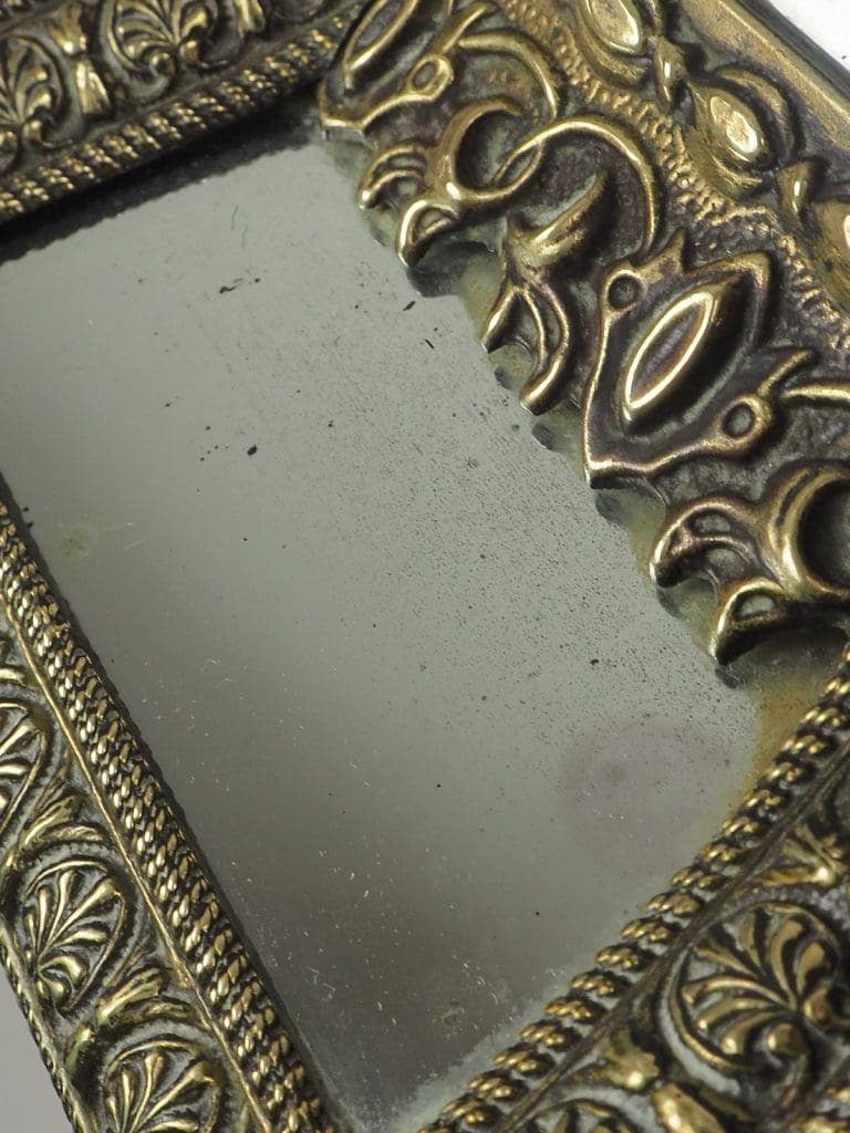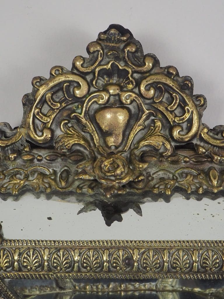 Although the mirror has lost its larger decorative crest over the years, it still retains a smaller crest that proudly sits at the top, adding a regal touch to its overall design. The central beveled mirror is surrounded by eight marginal cushion mirrors, creating a visually stunning display. Each section is separated by an attractive embossed frame, further enhancing the mirror's aesthetic appeal.