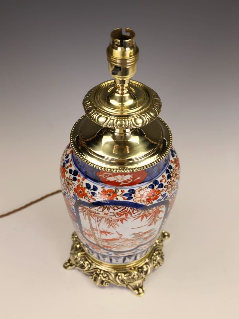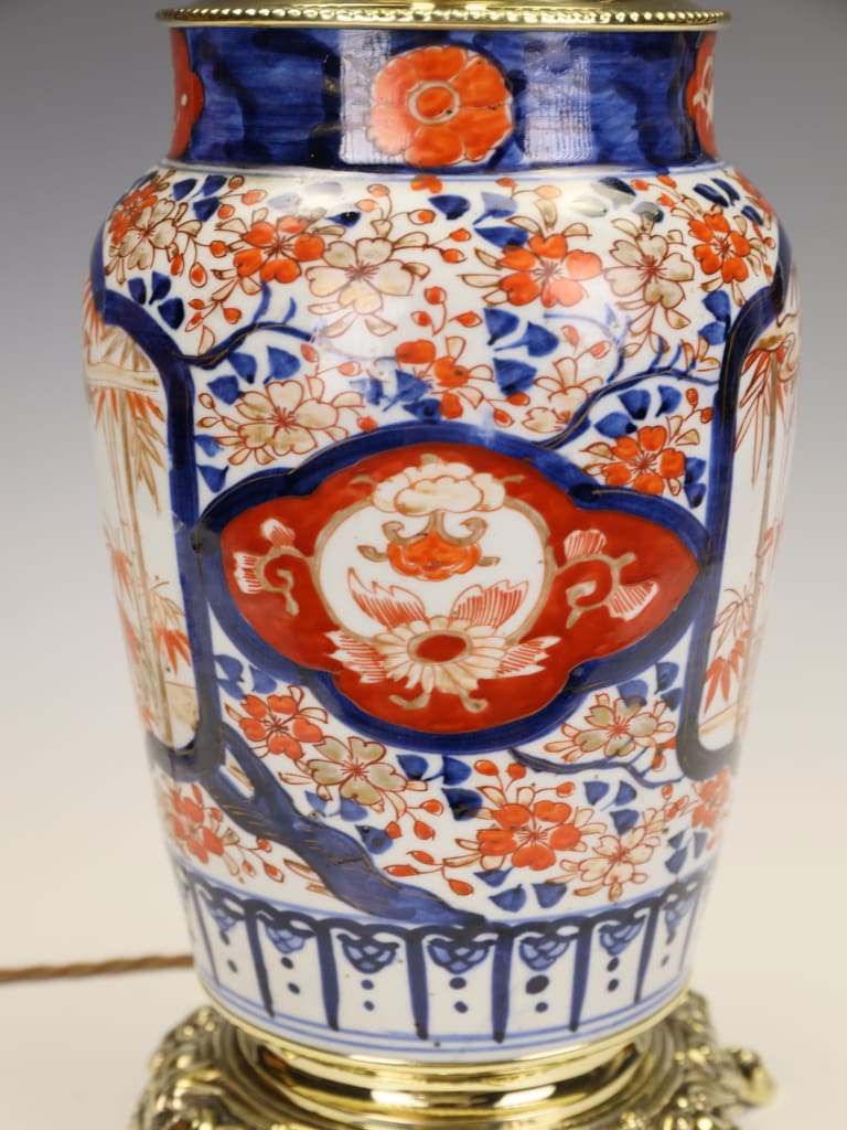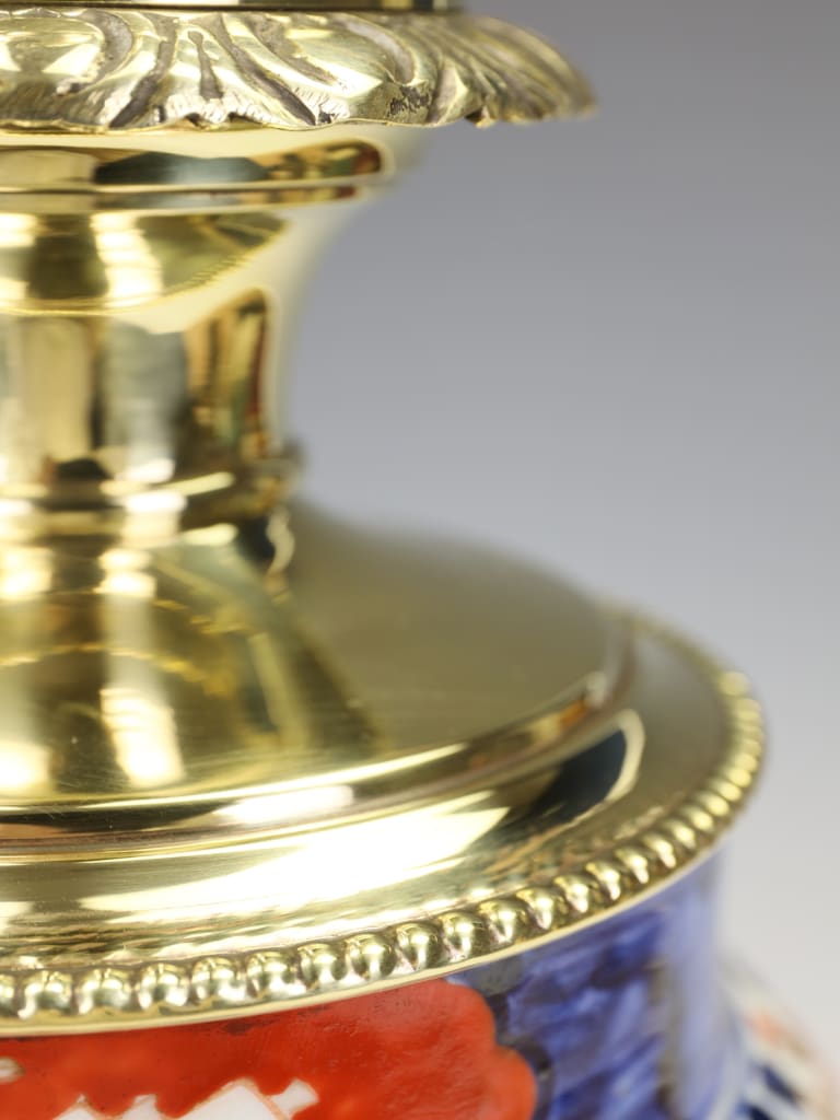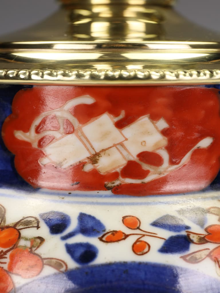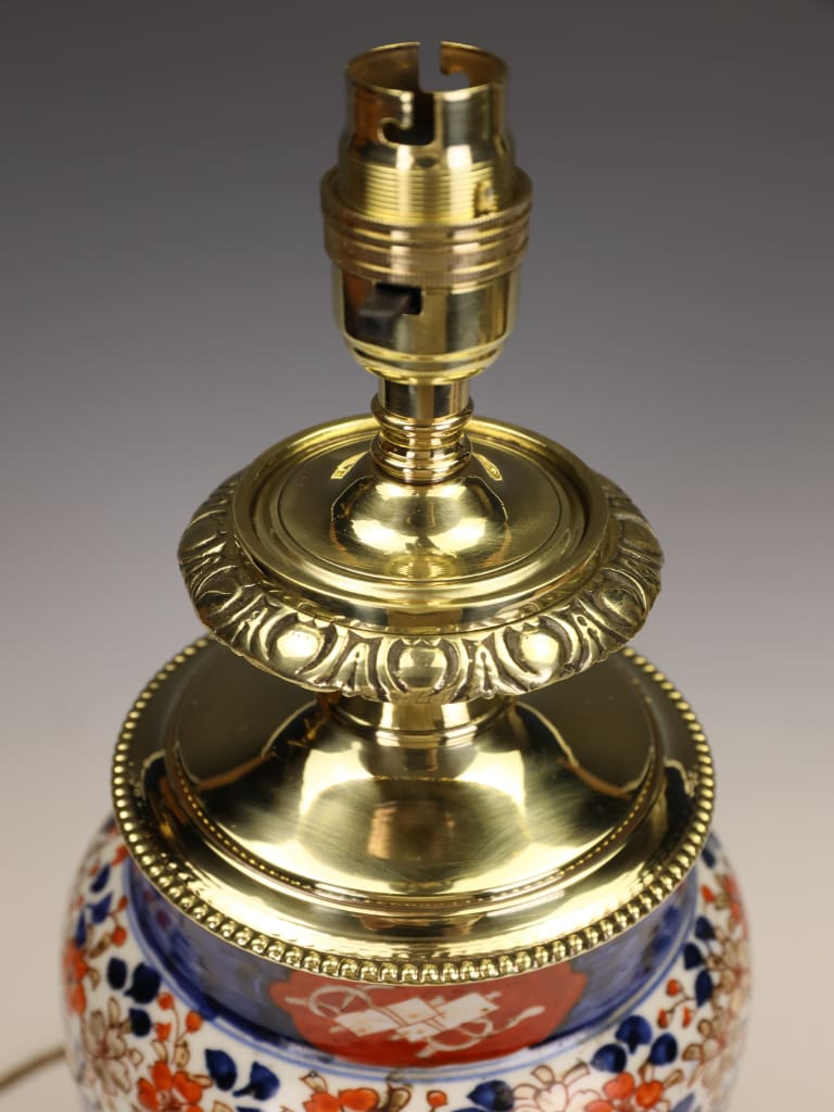 Small-scale Imari wares like this were highly prized in the late 19th century as part of the 'Aesthetic Movement' in Britain. Unlike the massive vases intended for grand hallways, these smaller lamps were designed for the more private, intimate spaces of a Victorian home. The 'Imari' palette of red, blue, and gold has remained a staple of British interior design for over a century, famed for its ability to complement both warm wood tones and rich fabrics.