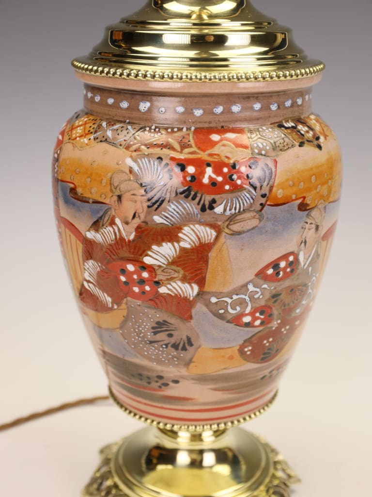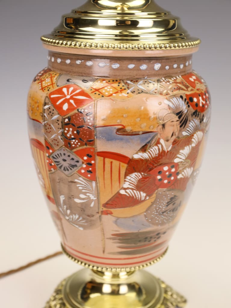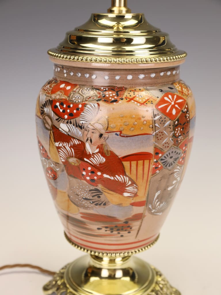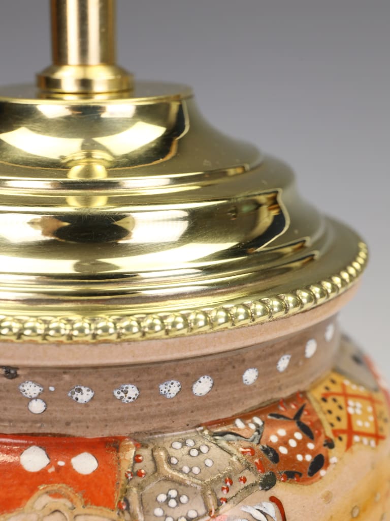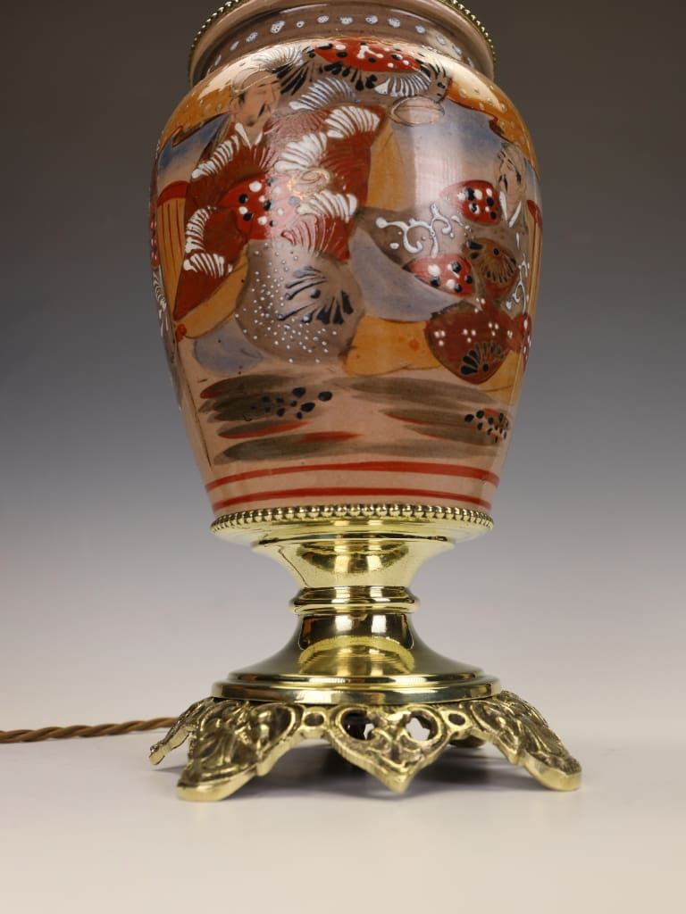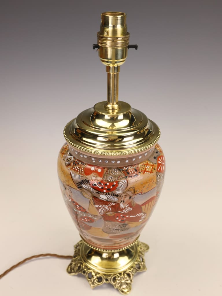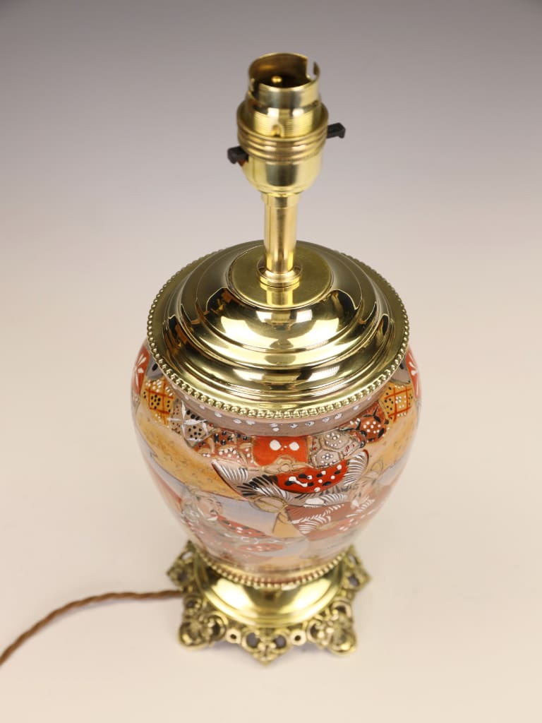 "What draws me to this particular piece is the extraordinary preservation of the enamels. Many Satsuma wares of this era can appear tired, but the 'jewelled' white highlights on the robes here still catch the light beautifully. The conversion to a lamp was handled with great care; we’ve used a solid brass stepped base and a matching cap to ensure the silhouette remains balanced. It is a striking 'statement piece' that would sit comfortably in both a traditional library or a contemporary drawing room."
