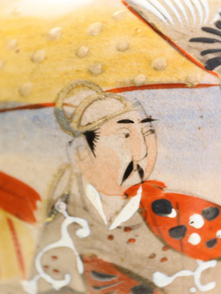 Satsuma ware originated in the Satsuma province of southern Kyushu. By the Meiji era, it became one of Japan's most famous exports to the West. The style seen here, often referred to as "Kyoto Satsuma," is noted for its ivory-coloured crackle glaze and elaborate overglaze painting. These wares were the height of fashion during the Japonisme movement in late 19th-century Britain, appearing in the finest Victorian and Edwardian homes.