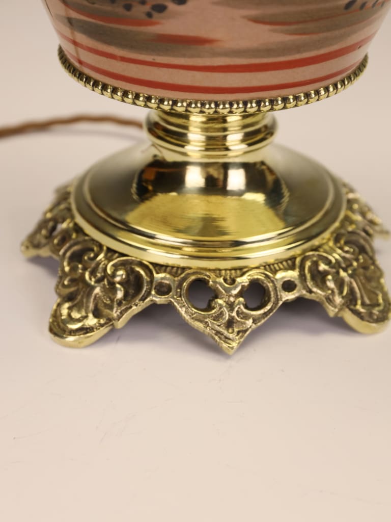The decoration is executed with characteristic moriage (raised enamel) techniques, providing a wonderful tactile quality to the flowing robes and traditional headgear. The figures are set against a landscape of stylized clouds and geometric brocade borders. This piece has been professionally sympathetically mounted with high-quality, heavy-gauge brass fittings that complement the warm tones of the ceramic, creating a bridge between Eastern antiquity and classic European interior design.