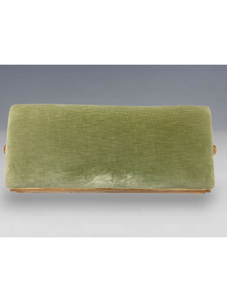 The generously sized seat is upholstered in green velvet and finished with a close-set decorative braid. The upholstery is comfortably padded and well proportioned, suitable for extended periods of use.