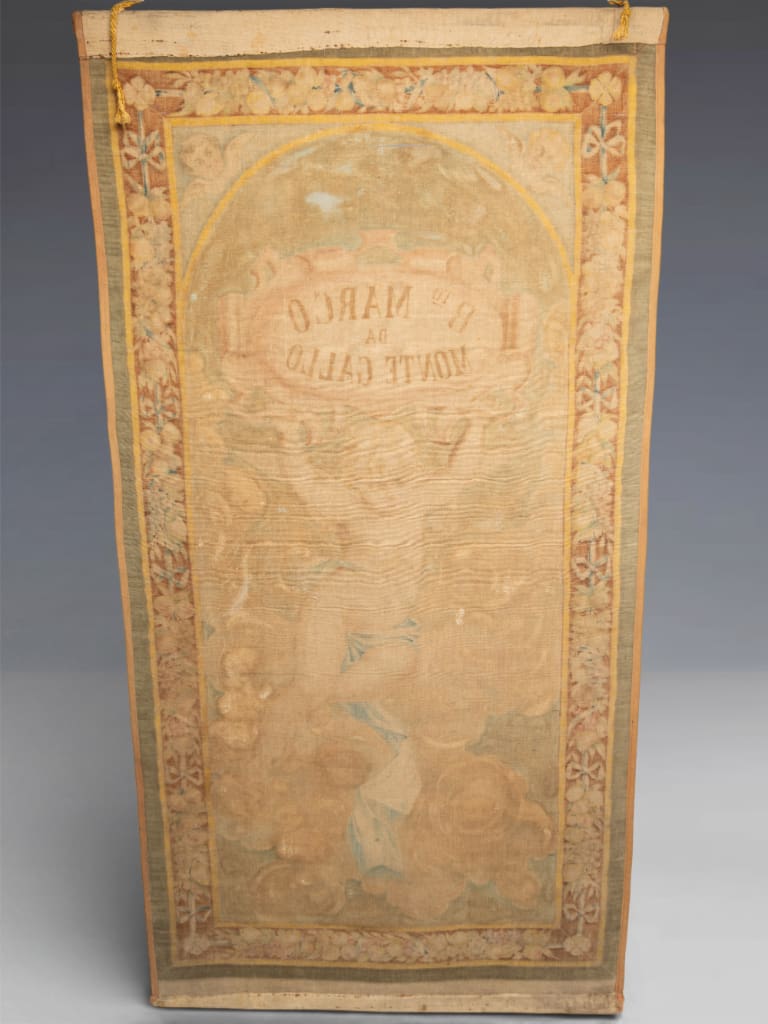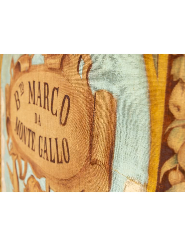 Marco da Montegallo was a nobleman and physician who became a Franciscan friar. He is revered in Italian history as the founder of the Monti di Pietà —charitable pawnshops established to provide low-interest loans to the poor, protecting them from predatory usury. This tapestry was likely commissioned for a chapel or a charitable institution in the Marche or Veneto regions to honour his legacy as a "Preacher of Love."