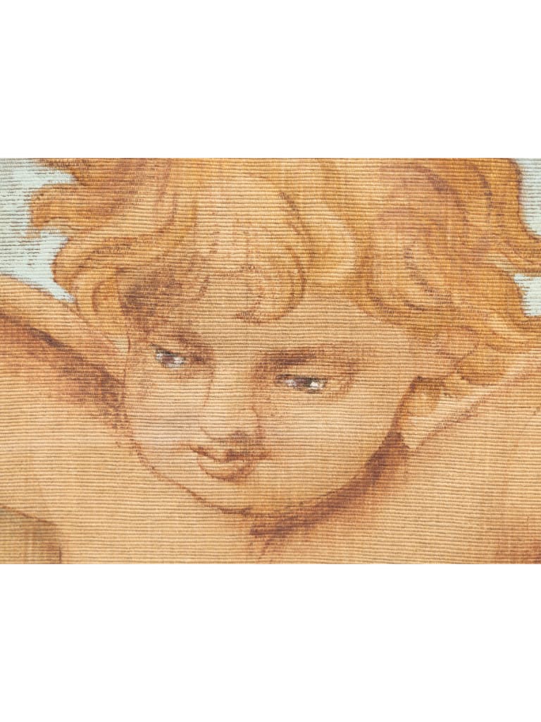 The tapestry centers on an expertly rendered cherub, who emerges from a celestial cloudscape to present a grand architectural cartouche. The inscription reads: